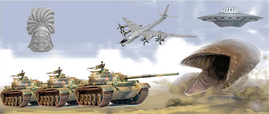 А потом было первое нападение этих жутких подземных червяков Олгой-хорхоев. Пока они были величиной с хорошего кабана (только в два раза подлиннее), было еще ничего, главное было не слезать с брони на землю, и грамотно использовать турельные ДШК, но когда появились индивидуумы величиной с пару хороших лошадей, то нас спасли только родные башенные стомиллиметровки. После того, как к утру выжившие исчадия пустыни зарылись назад песок, на броне некоторых наших машин были обнаружены хорошие такие царапины.