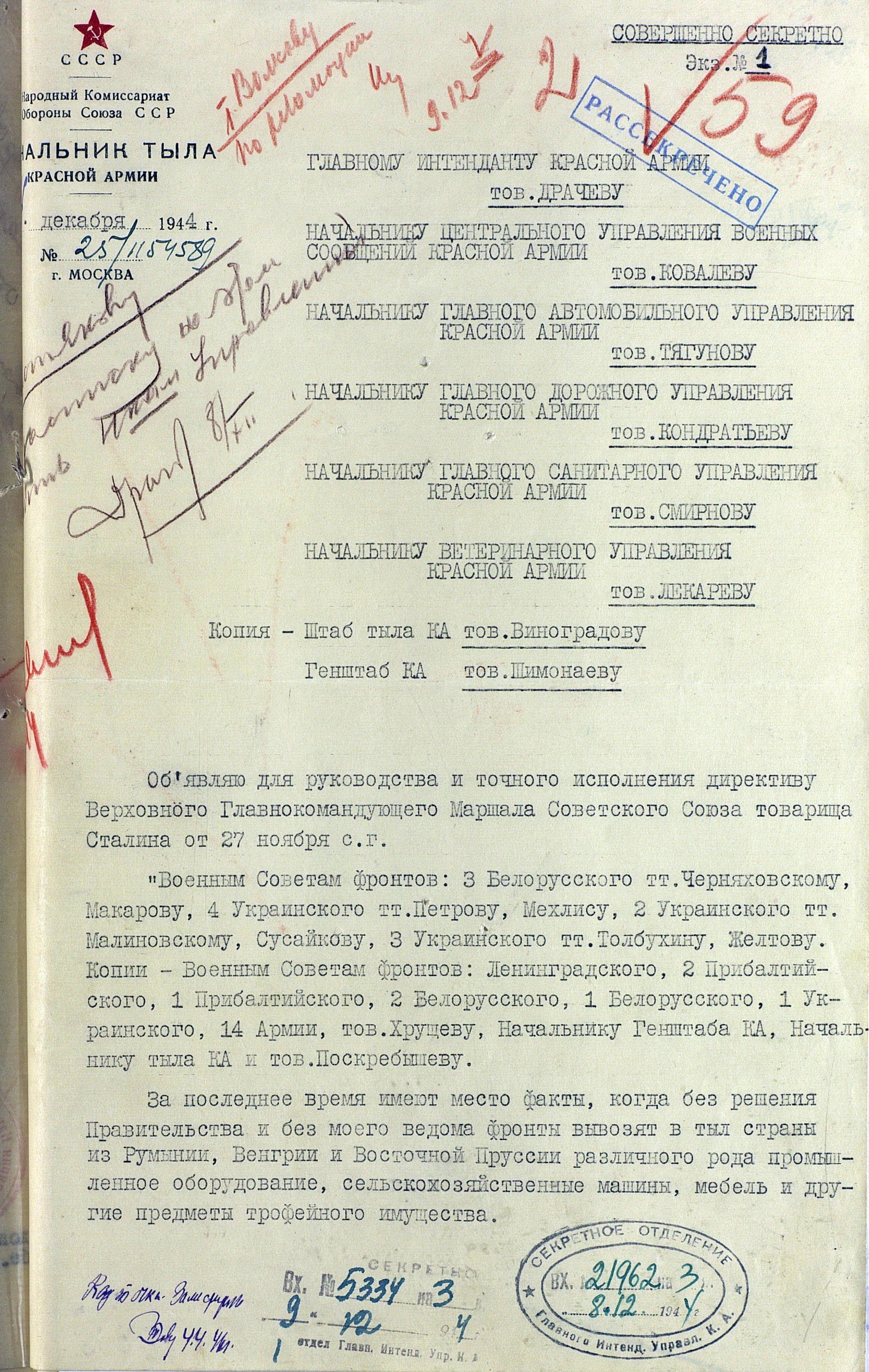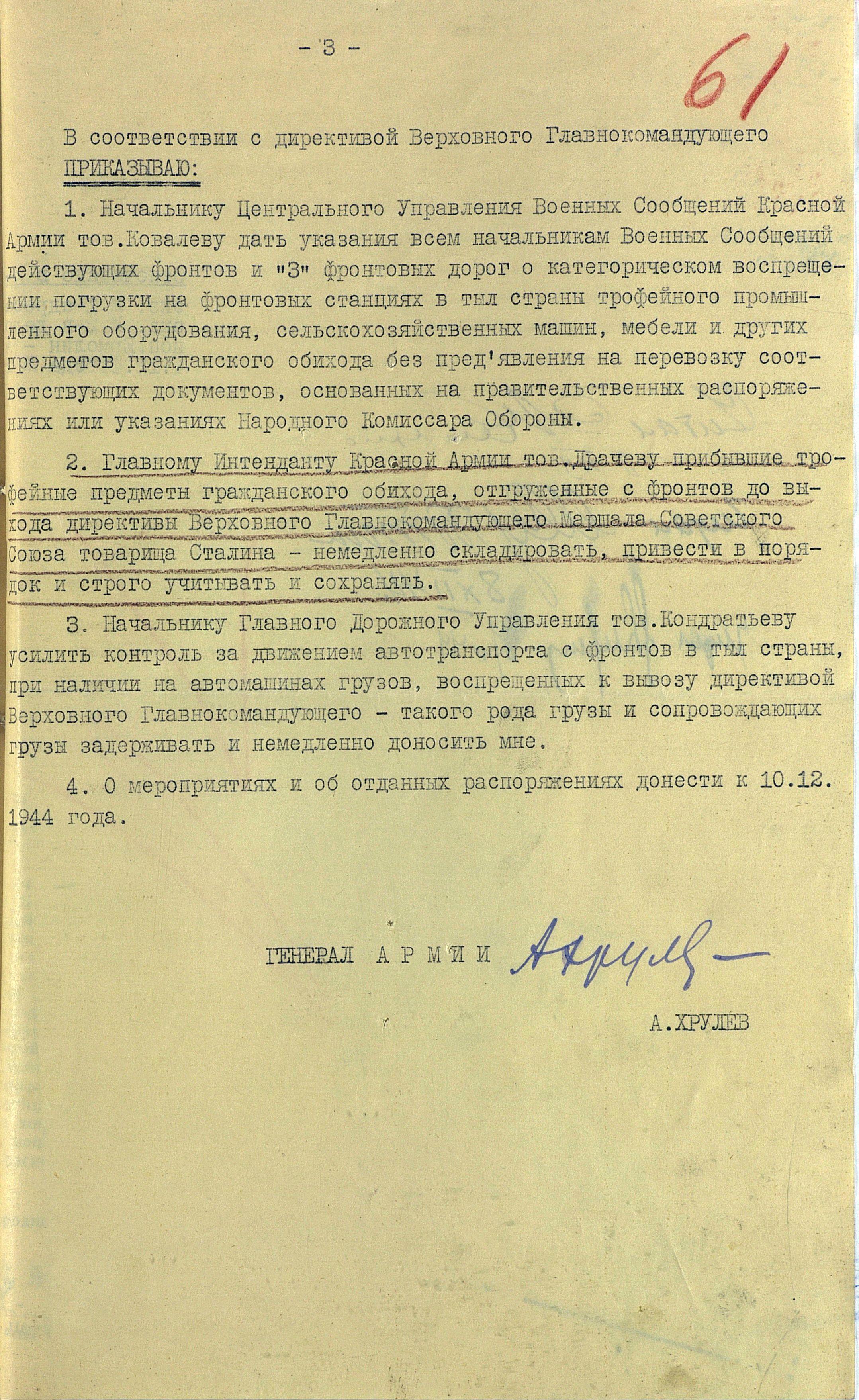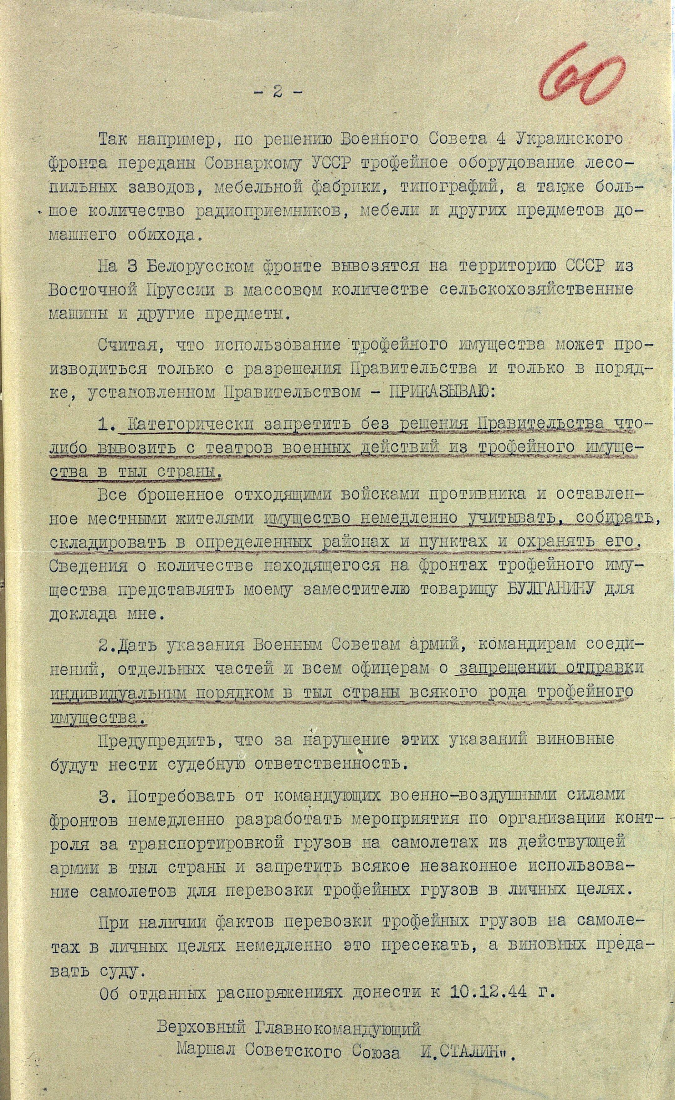 Директива Верховного Главнокомандующего о запрете вывоза трофейного имущества в тыл страны