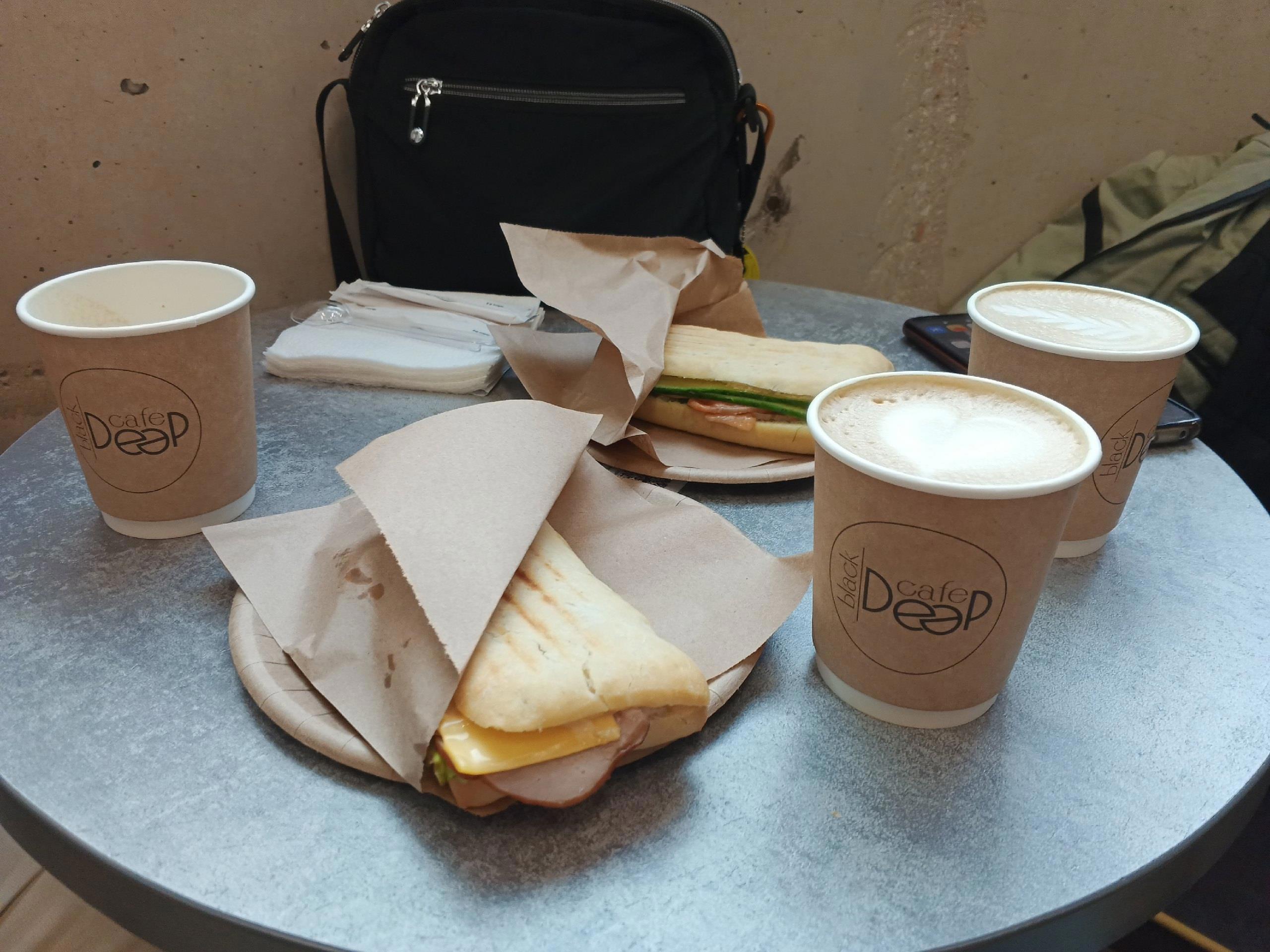 И место, кстати, не смотря на небольшой размер, нашлось для нас сразу. Да, кофе и чиабатту подают в одноразовой посуде. Но вкус-то от этого хуже не становится, зато гарантированно нет грязных разводов на тарелках и ложках.