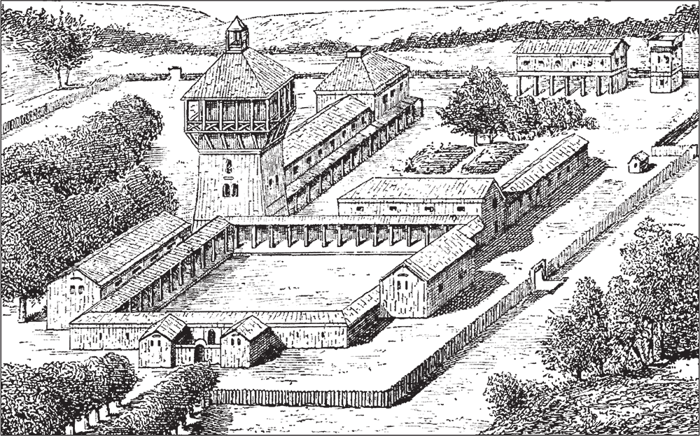Никаких остатков укреплений той эпохи до нашего времени не дошло. Скорее всего, они были деревянными. А поскольку там останавливался и король — видимо, было еще и что-то вроде имения. Видели в школьном учебнике реконструкцию имения землевладельца эпохи Каролингов? Вот и представьте что-то подобное.