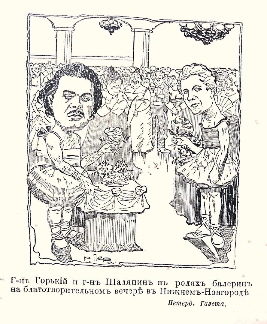 на случай, если Роскомнадзор набежит - картинка опубликована в 1901 году. Это так столичные  газетчики хихикали над стараниями Горького и Шаляпина собрать деньги на строительство общедоступного театрально-концертного здания.
