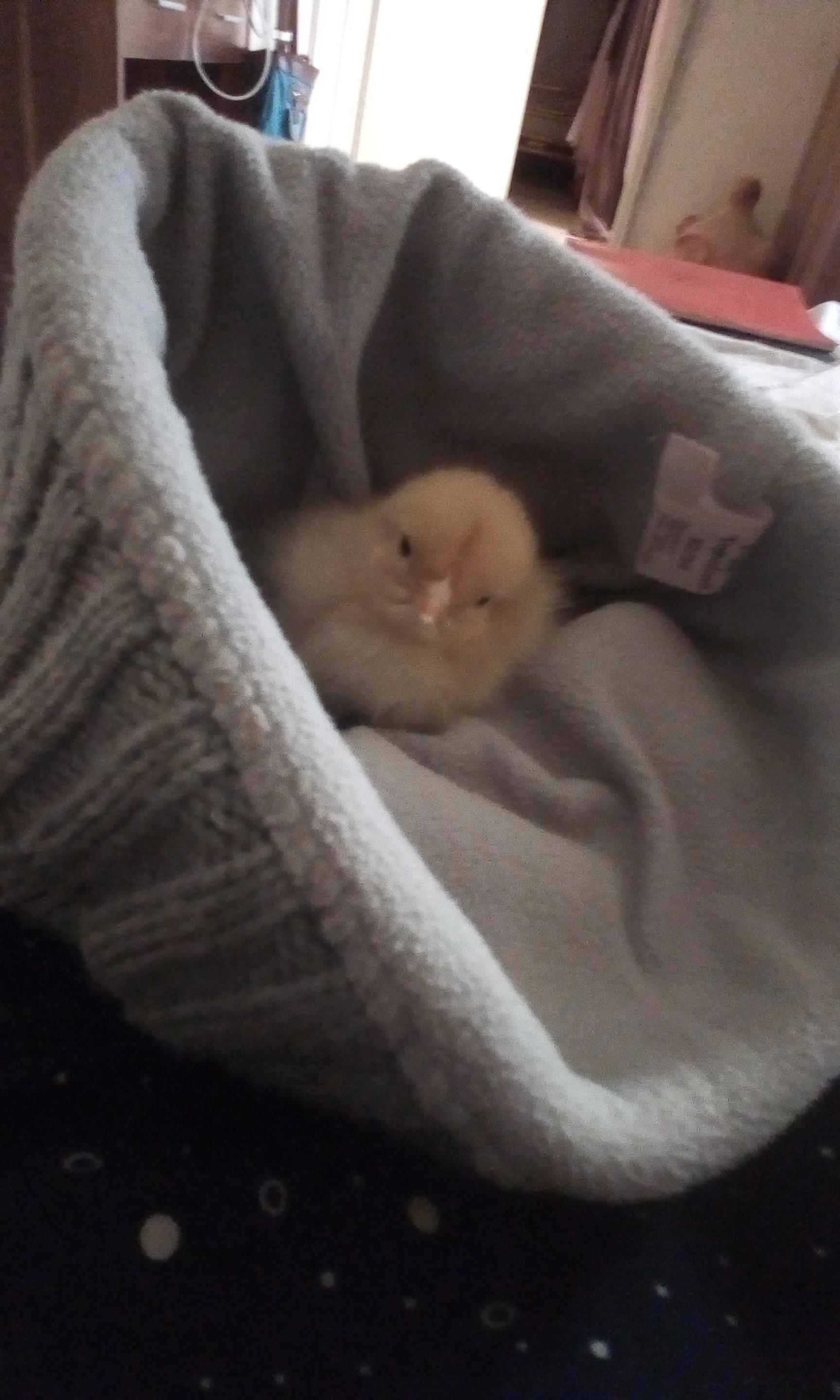 В общем, цыпа оклемался. Стал помаленьку есть корм. Водичку всё так же даю я. Смешно пытается залезть под меня, когда его вынимаю из шапки. Спать пристраиваю сразу рядом с моей подушкой - всё равно потом к себе брать.