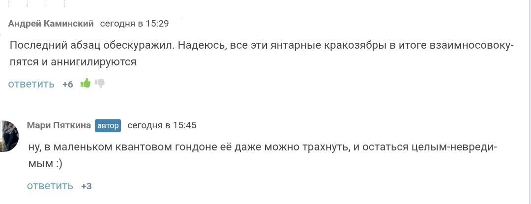 Однако, сам вопрос: если на вагину в квантовом заборе никто из вохровцев и зеков не покушается даже пальцем, все держат дистанцию, насколько прилично будет вырастить из плазменной леди пенис для гарантированного соблазнения как минимум одного местного мужчины? И не закроют ли книгу модераторы в текстовую кпз, если оная сцена соблазнения будет описана в негативном, осуждающем и трагическом ключе, ничем не похожим на пропаганду? С драматической целью. Я предварительно спрашиваю, пока раздумываю, не факт, что рискну. В общем стОит растить, или воздержаться в целях безопасности? Я серьёзно.