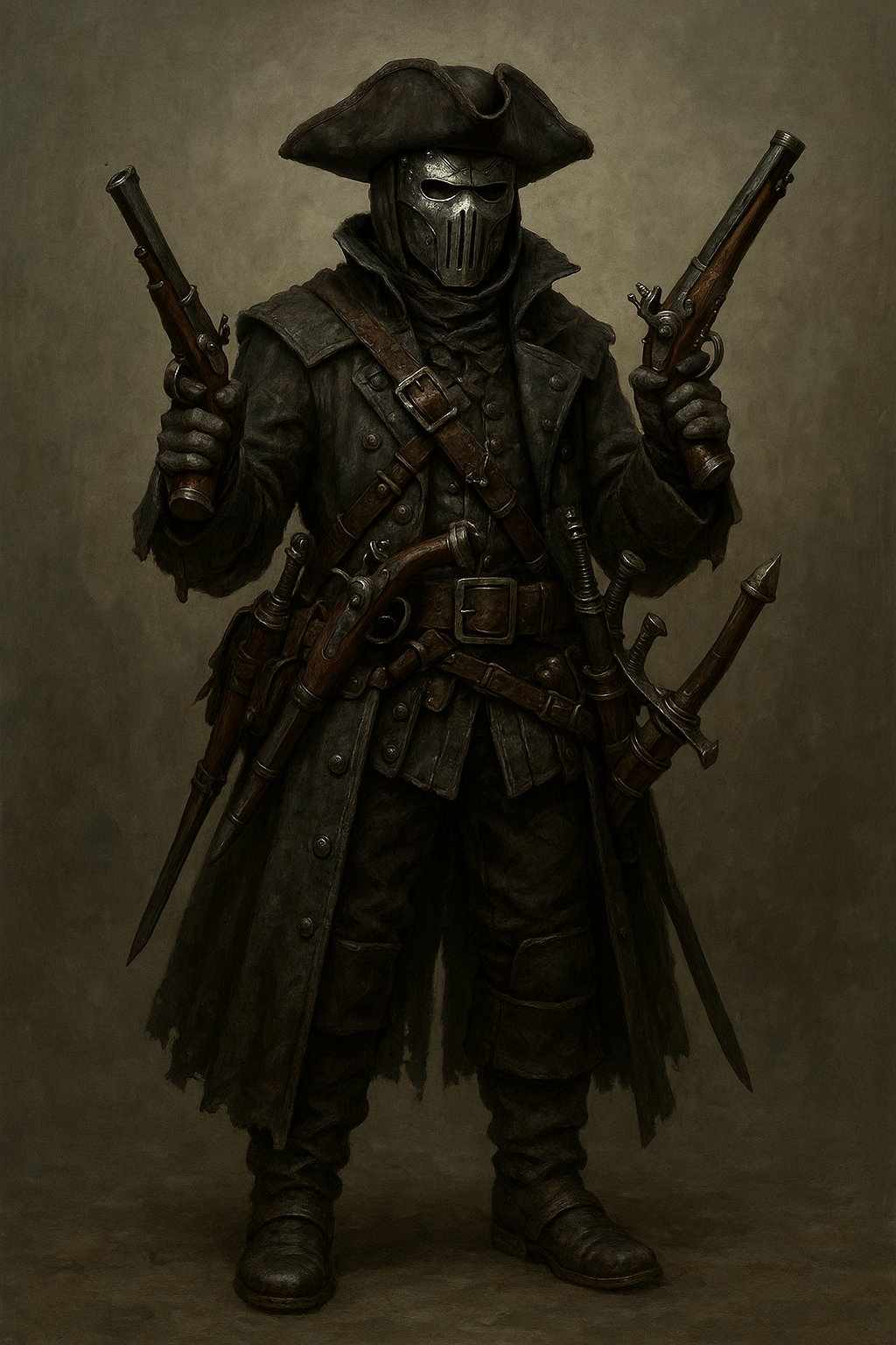 Куцкос — пепельный сокол, они определенно один из самых близки аллюзий на коммандос, которую можно представить. Причем, Куцкос один из лучших в своём ордене. А вот препоны ему чинят “среднестатистические” маски. Маски — это своеобразный “пиратский спецназ”. На каждом уважающем себя пиратском корабле есть отряд масок — отъявленных головорезов, которые одинаково хорошо владеют клинком, пистолем, умеют эффективно использовать гранаты, ловушки, элементы корабельного убранства и все, что подвернется под руку. Масок снабжают лучшими магическим снаряжением, всякими хитрыми штучками от конструктомансеров, их оружие всегда зачарованное, броня легкая, но из алхимических материалов, а дисциплина находится примерно на уровне ведущих гвардейских подразделений мира. Ну а маски Адмирала — лучшие (капитан Клоун, конечно, поспорил бы, но кто ж их всех спрашивать будет).
