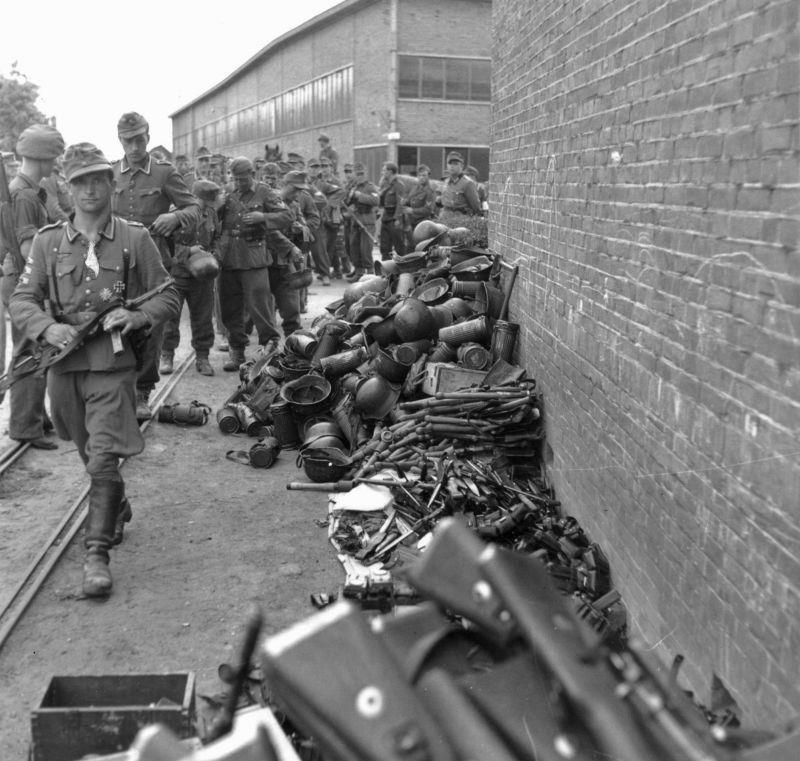 Тут тоже пока еще есть где складировать. Фотограф выбрал самого внушительного из пленных - с тремя планками за рукопашные победы над танками. А вот те что за ним - все гологрудые - ни за ранения, ни даже значков третьесортных нету.