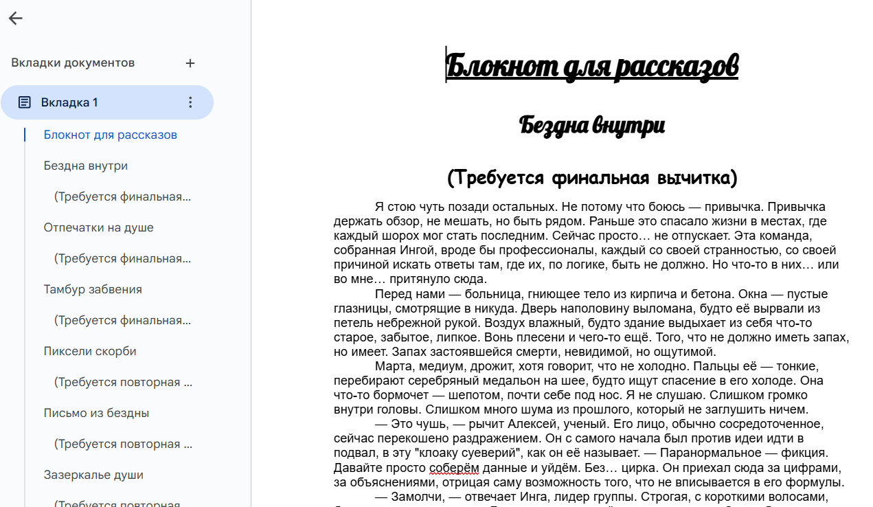 Автор: Конюшенко ЕгорВсем привет. Я провёл повторную редактуру трёх своих рассказов: «Бездна внутри», «Отпечатки на душе», «Тамбур забвения». Совсем скоро я проведу повторную вычитку ещё трёх рассказов.