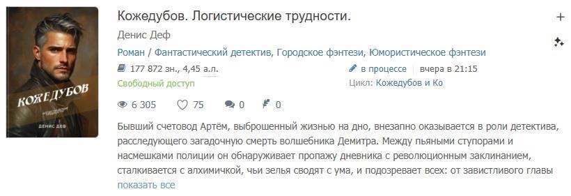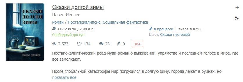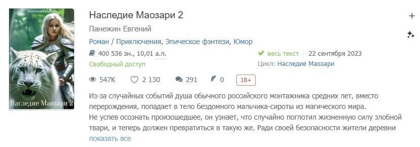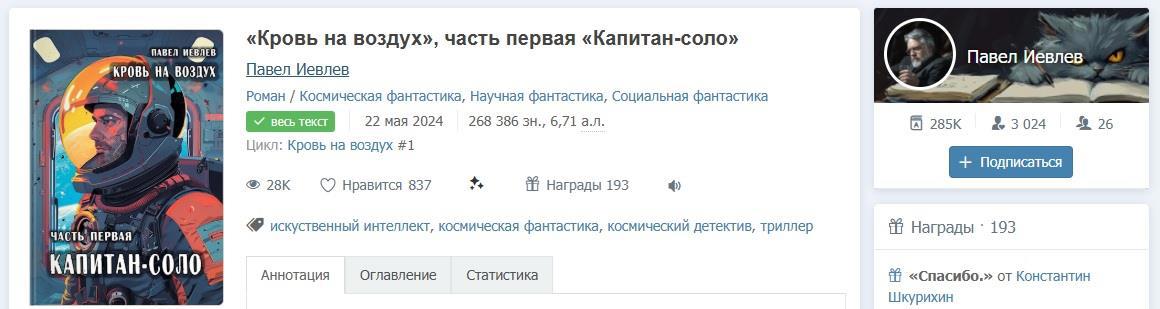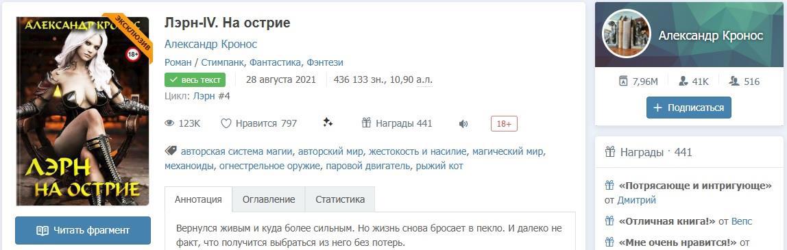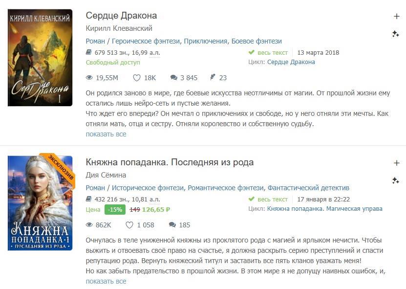 Единственный, неплохой автор, которого я нашёл - Павел Иевлев, имеет просто смешные показатели по просмотрам - 10-20к, а это уровень новичка. С другой стороны, если посмотреть на количество лайков под его книгами, то всё выглядит уже не так плохо:
