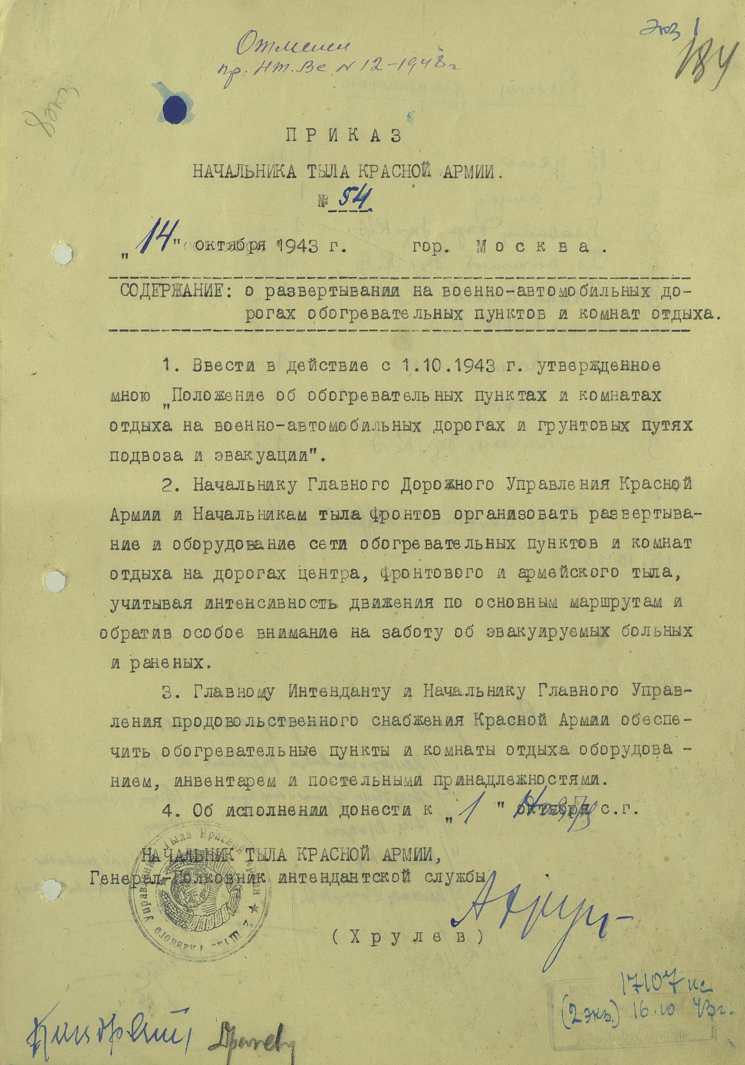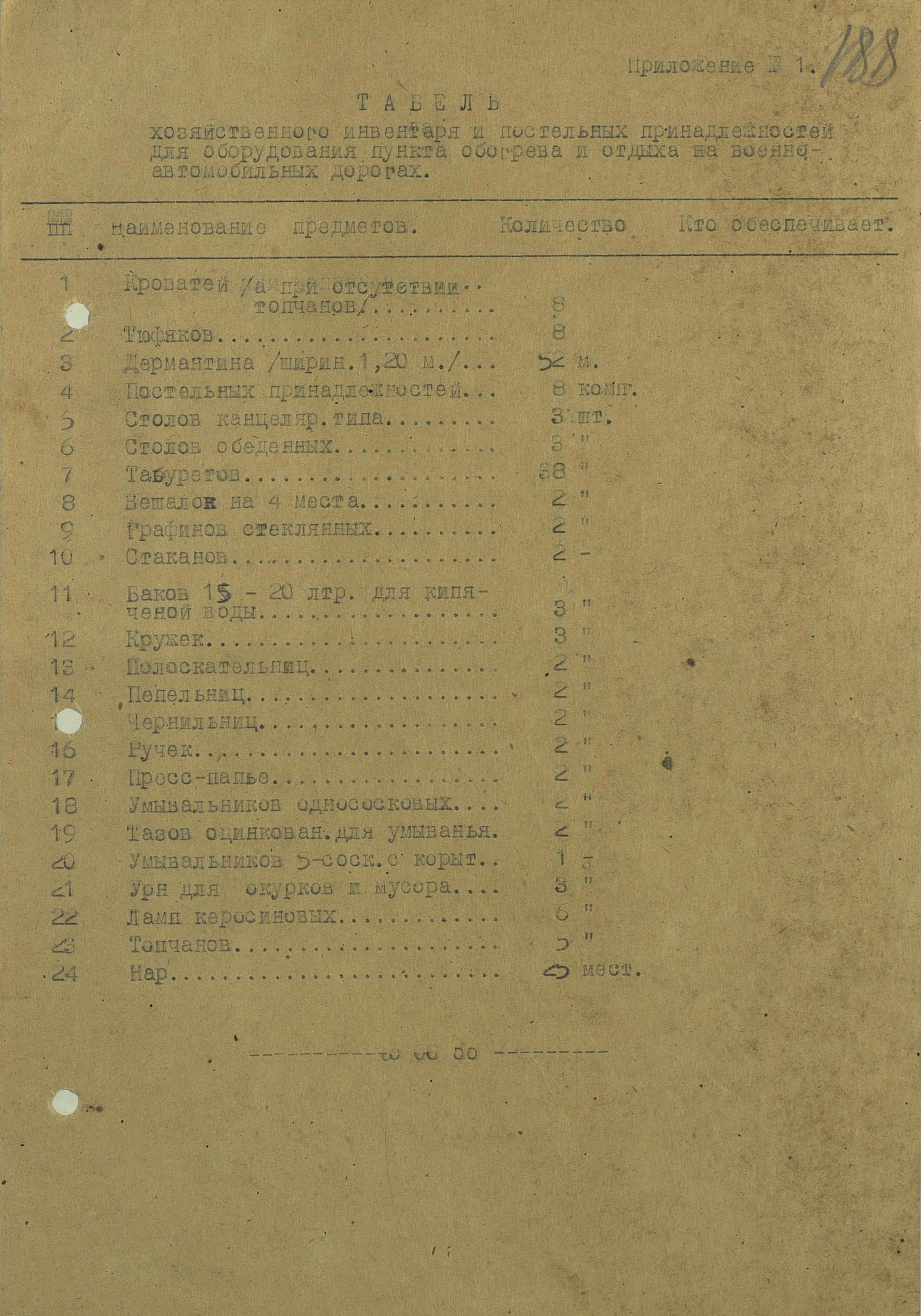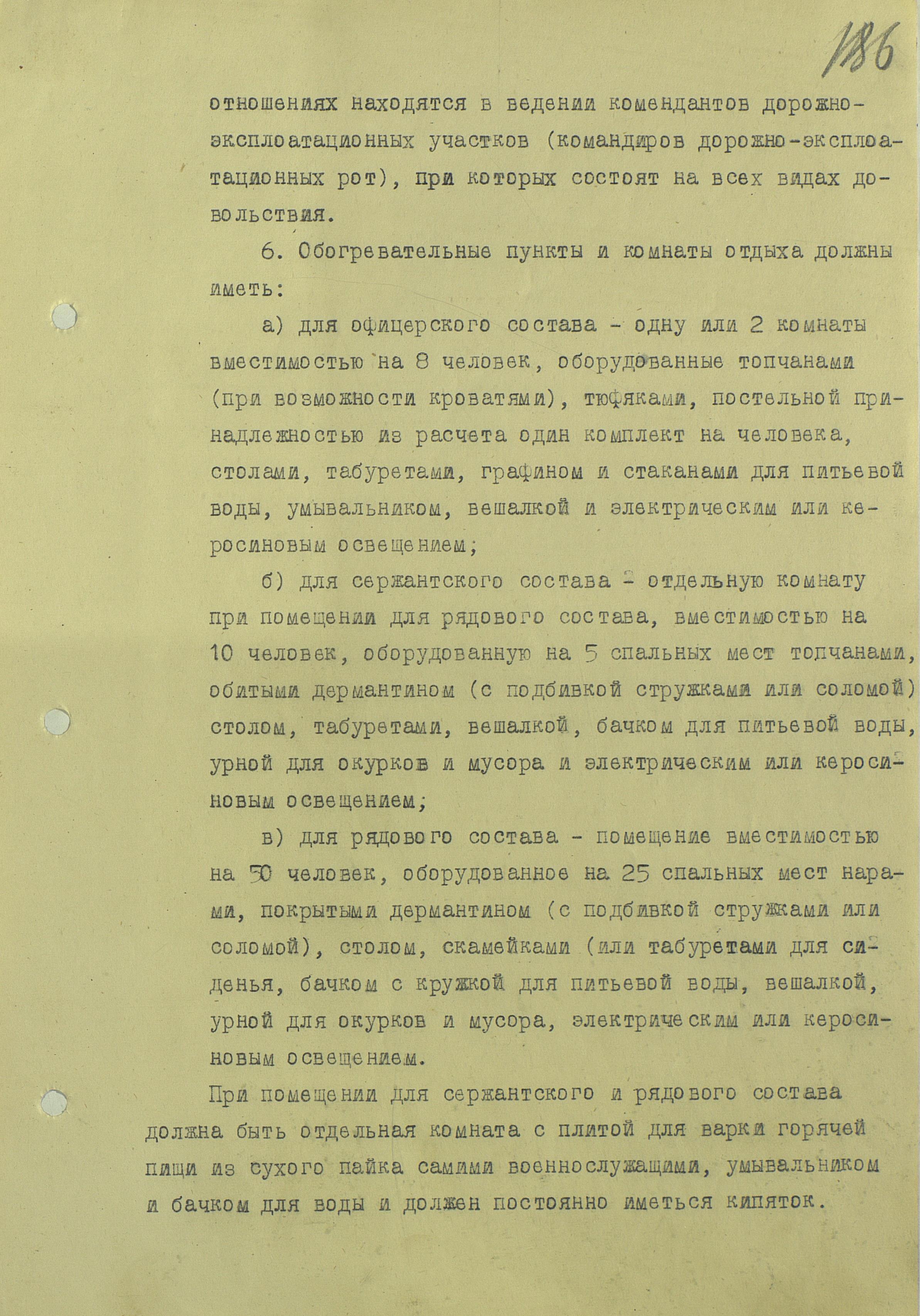 Что в этом руководящем документе показалось необычным и любопытным? Во-первых, приказ предписывал разделение обогревательного пункта и даже комнат отдыха на три помещения: отдельно для офицеров, отдельно для сержантского состава и отдельно для рядовых. Во-вторых - взимание платы с офицеров, по ценам, установленным для местных гостиниц. Правда, кипяток офицер мог получить бесплатно. А вот табель хозинвентаря хоть дело и важное, нужное, вот только при создании установленных запасов хозинвентаря, побегать снабженцам придётся немало.