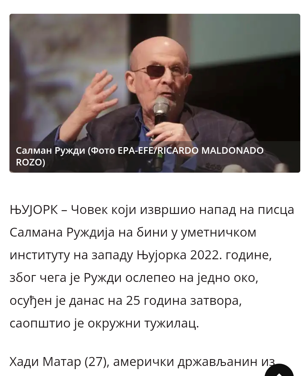 Вобщем, 27-летний мужчина, напавший на Сальмана Рушди, в результате чего тот потерял глаз, получил 25 лет. Нападение было в связи с "Сатанинскими стихами", причем ещё в 2022 году - долго же у них в Америке судебные процессы идут.