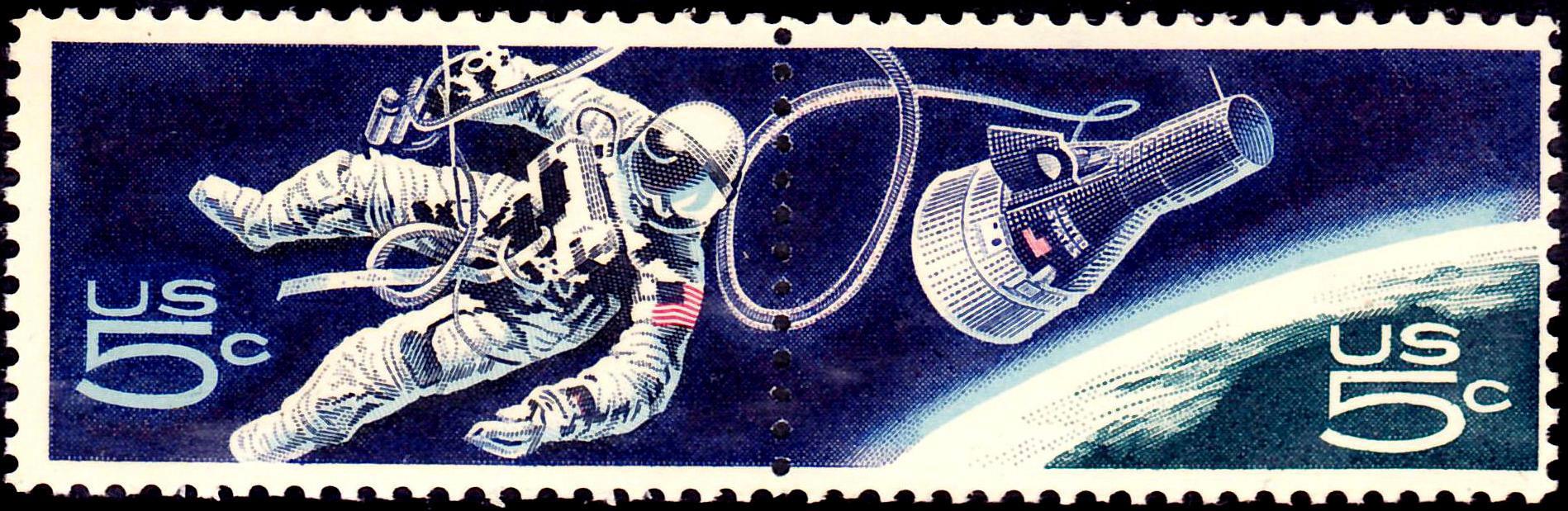 Марка посвященная первому якобы выходу американского астронавта в открытый космос. На самом деле видеофиксация не проводилась, джентльменам принято верить на слово