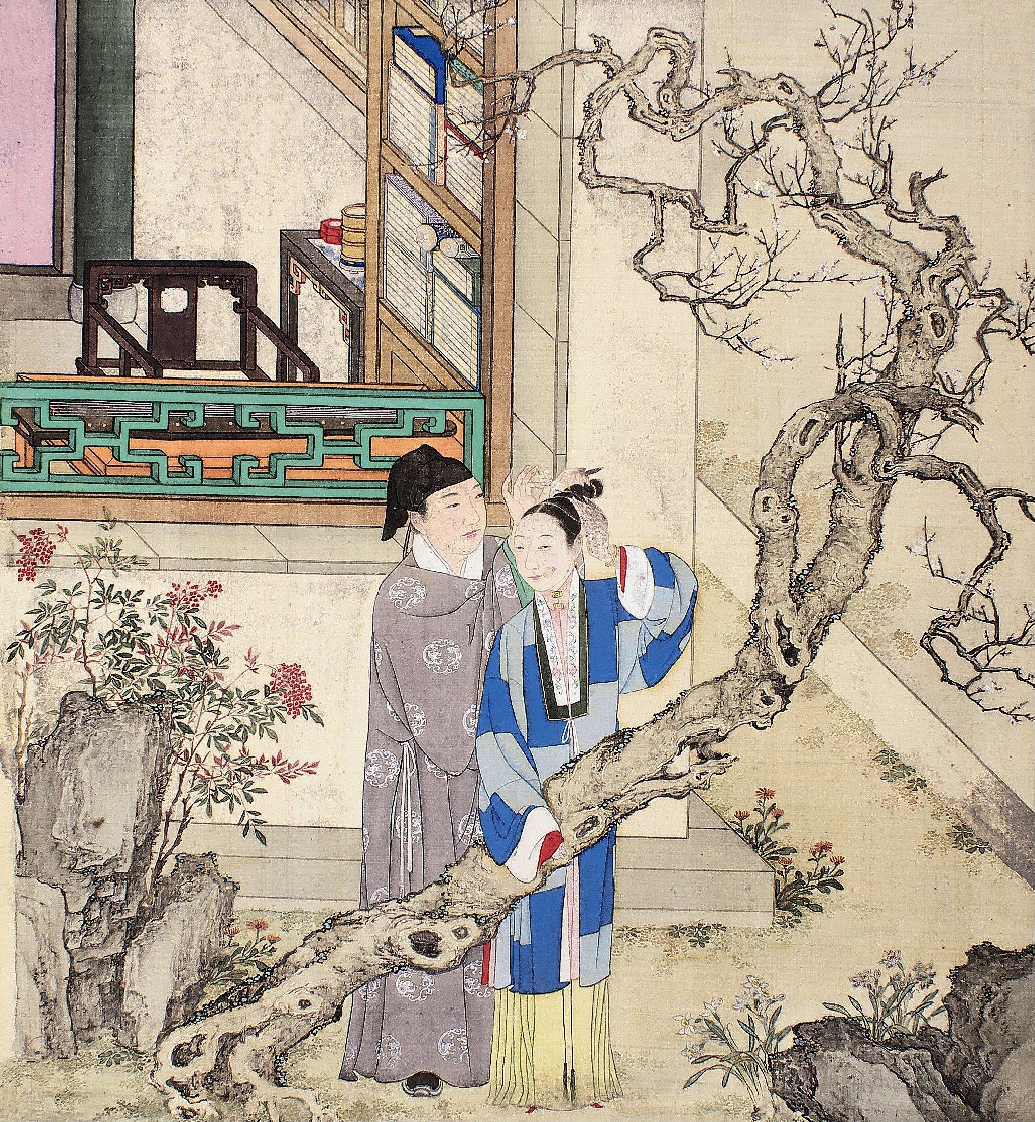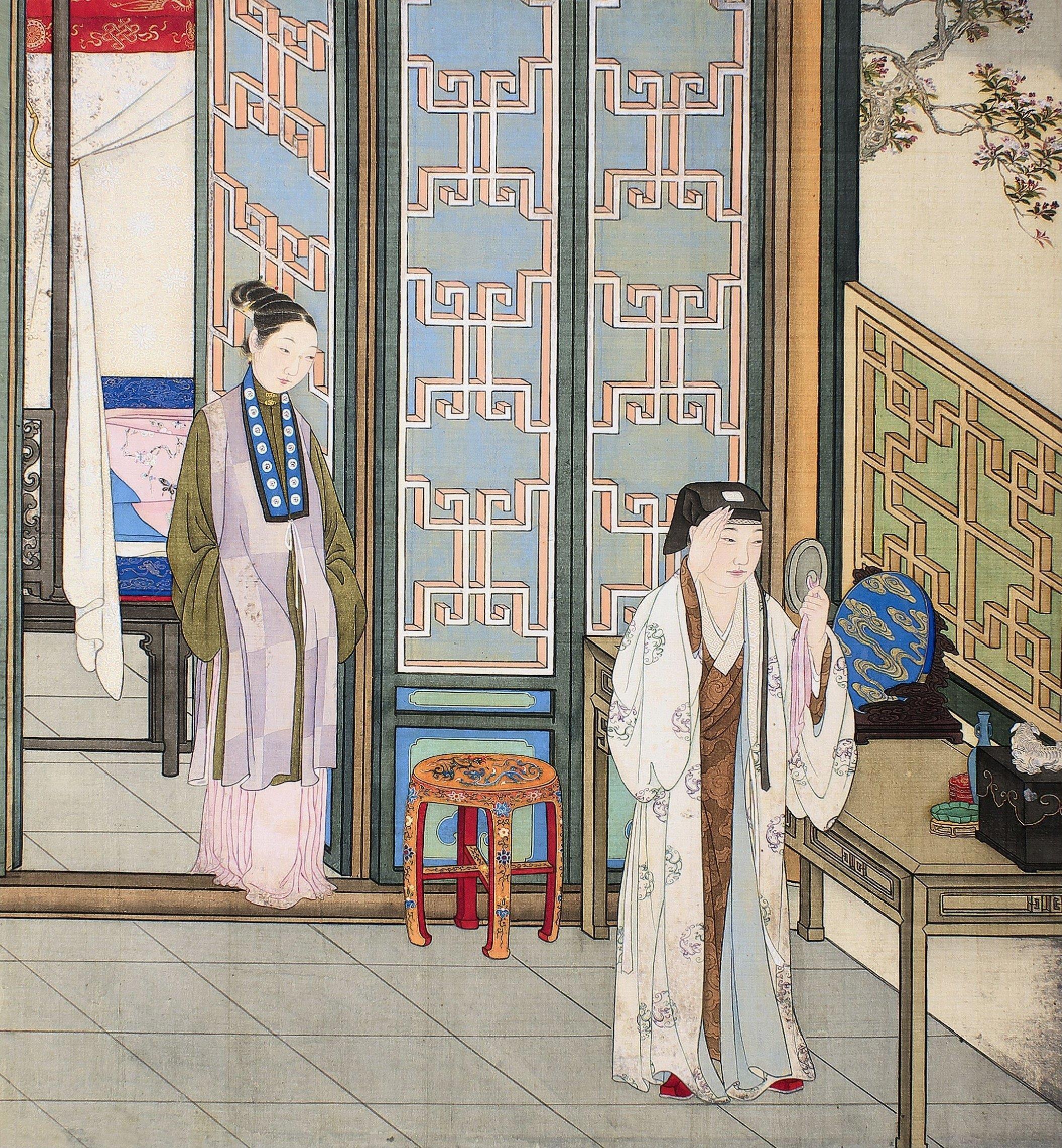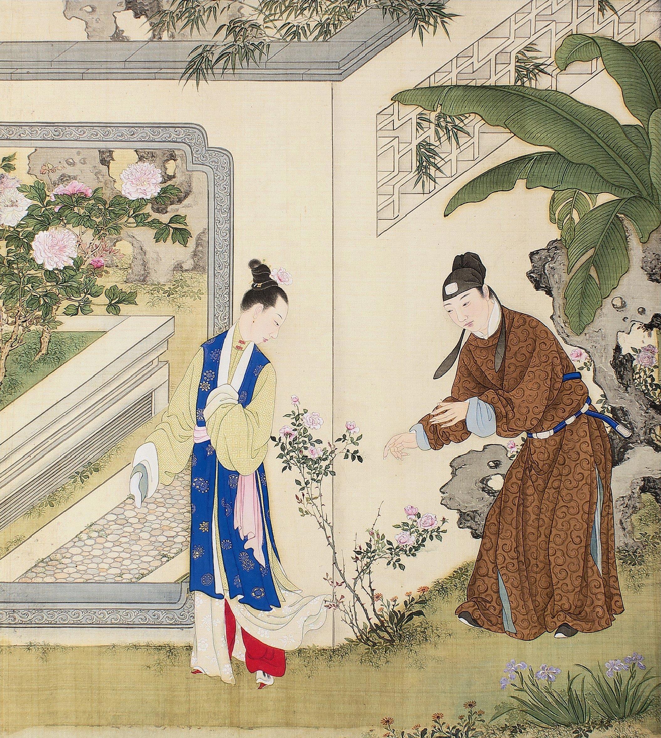 Но нас интересует альбом, написанный кем-то из придворных художников династии Цин (17 - 19 в.) и хранившийся в императорском семействе, который не представляет откровенных сцен, а показывает моменты нежности и флирта между супругами, с некоторыми нескромными намеками. Все-таки, мы занимаемся изучением того, как одевались люди в древности, а не как раздевались.
