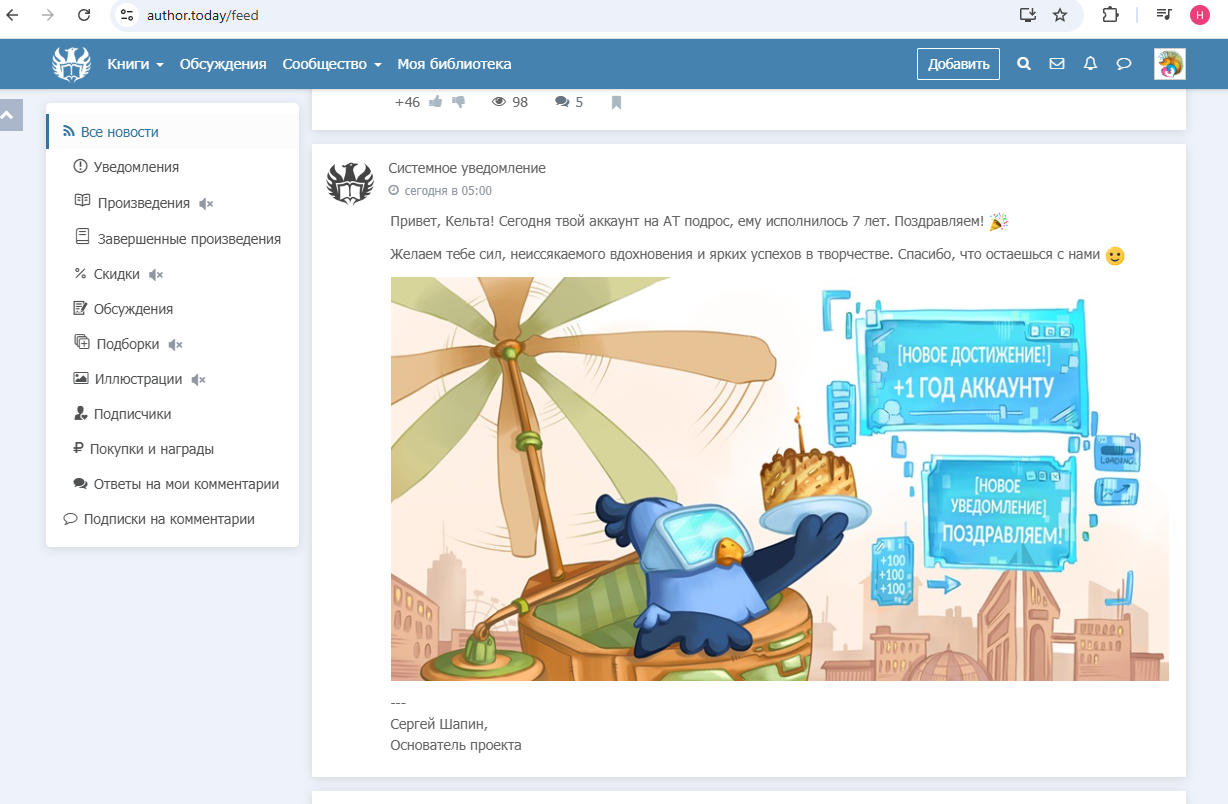 Автор: КельтаНедавно я праздновала 13 лет творческо-писательской жизни, а сегодня пришло поздравление от АТ. Ура, и потпала работать.
