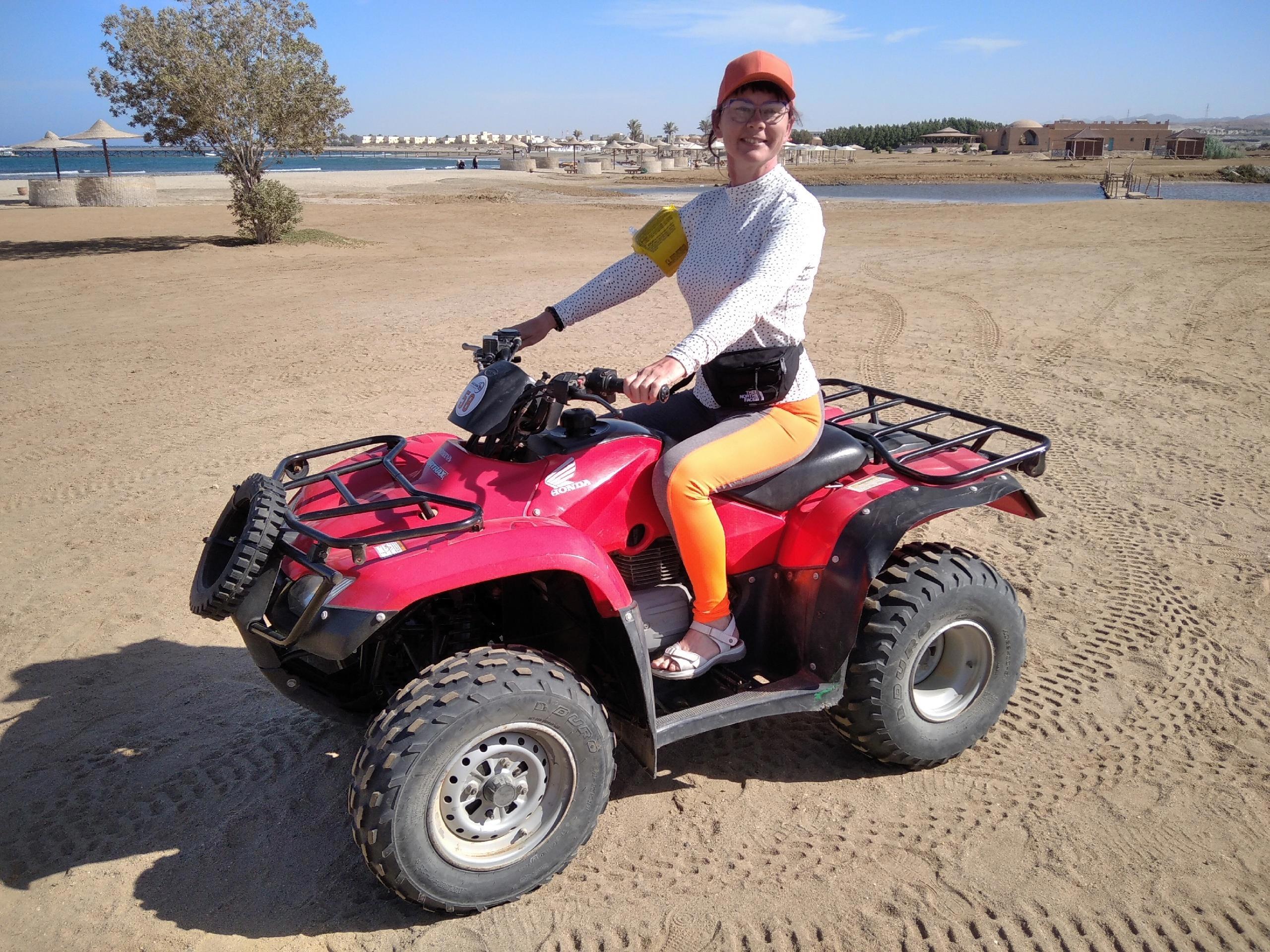 мы уже "освоили". Будем осваивать квадроцикл! Андрей и Марина записались на мотосафари, а скромный и застенчивый автор этих строк по причине жуткого количества комплексов и отсутствия навыков вождения верблю...то есть, квадроцикла, просто радостно попозировала верхом на предлагаемом виде транспорта.
