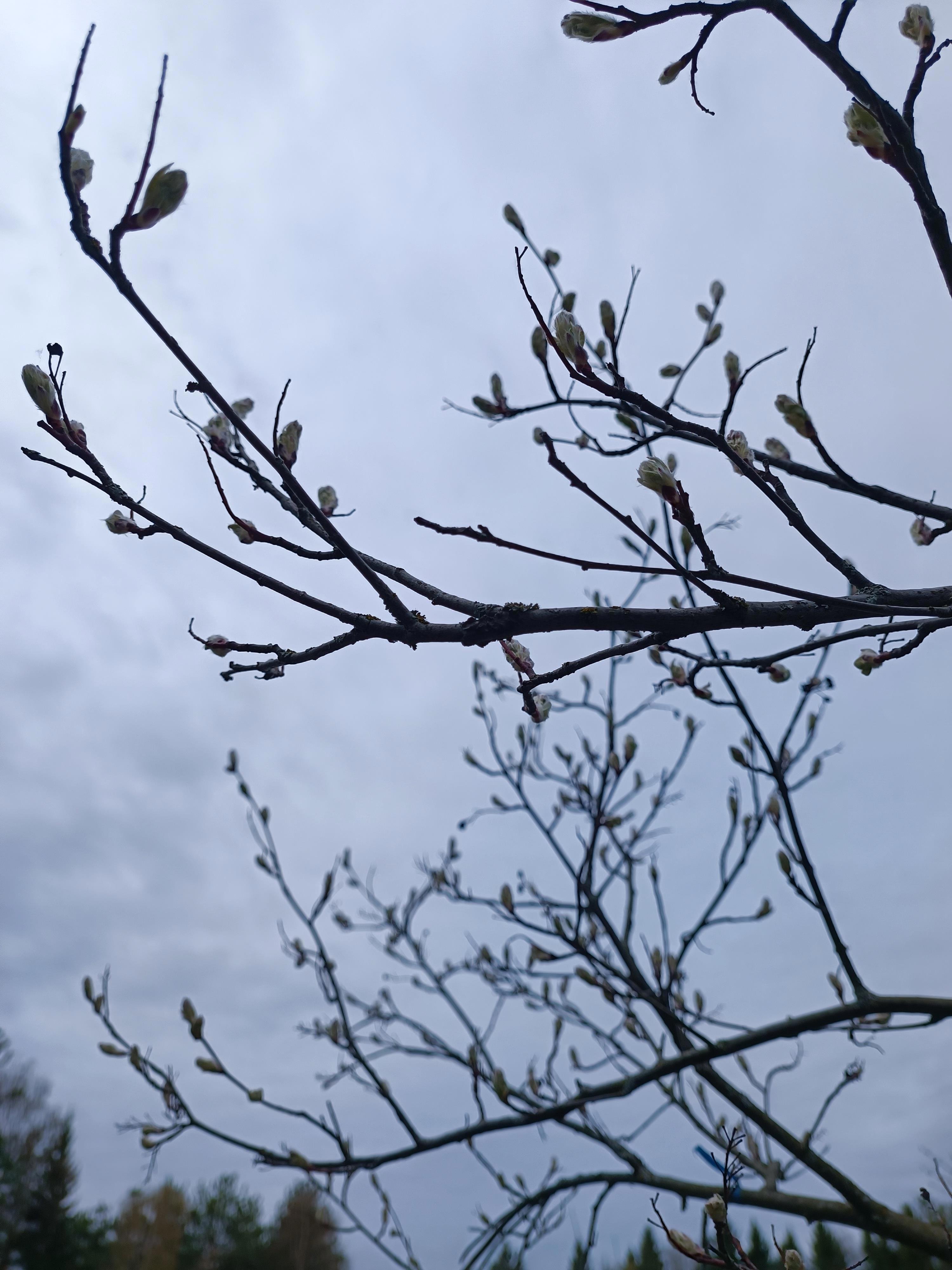 На самом деле дни были солнечные, но именно этот кадр с почками ирги (да, это не верба, но почки тоже пушистенькие) получился таким мрачным: