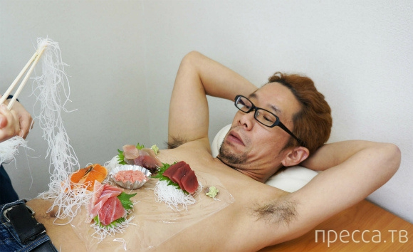 В процессе ниотамори суши раскладывают поверх тонких листьев на теле девушки (иногда мужчины), чтобы еда имела температуру человеческого тела.