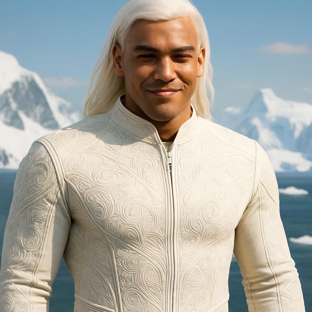 Белые волосы средней длины (до плеч), густые и слегка волнистые.
