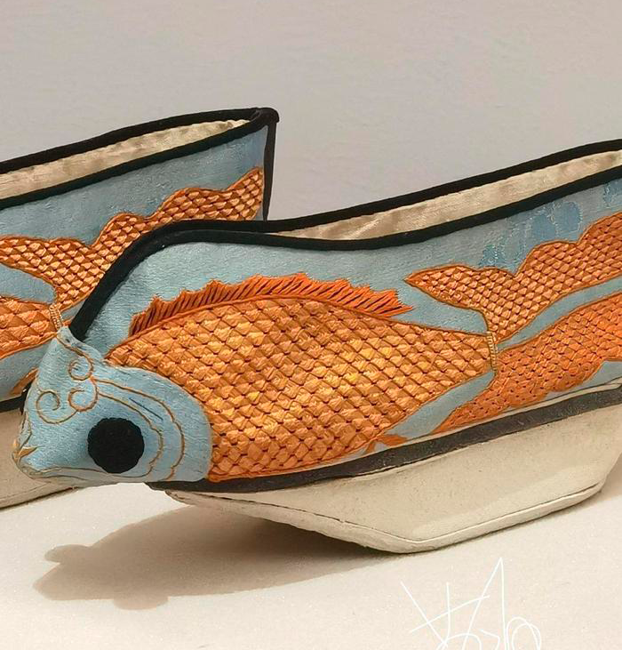 Автор: Хатка БобраТуфли знаменных женщин на платформе в виде денежного слитка с вышитыми золотыми рыбками (19 век)