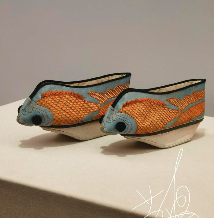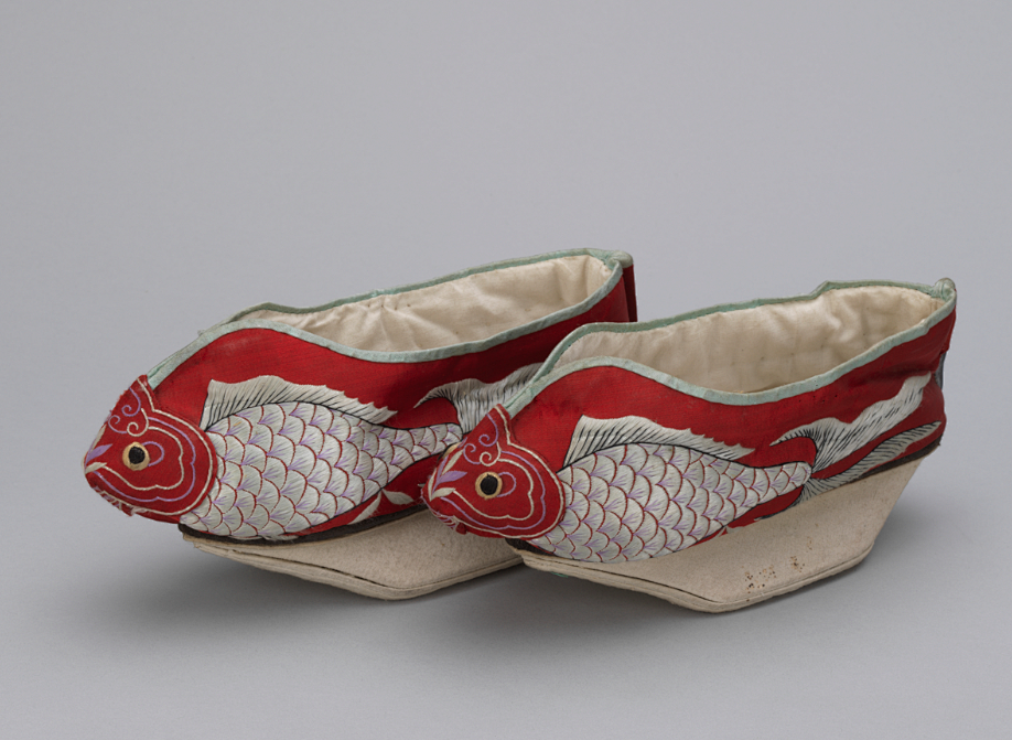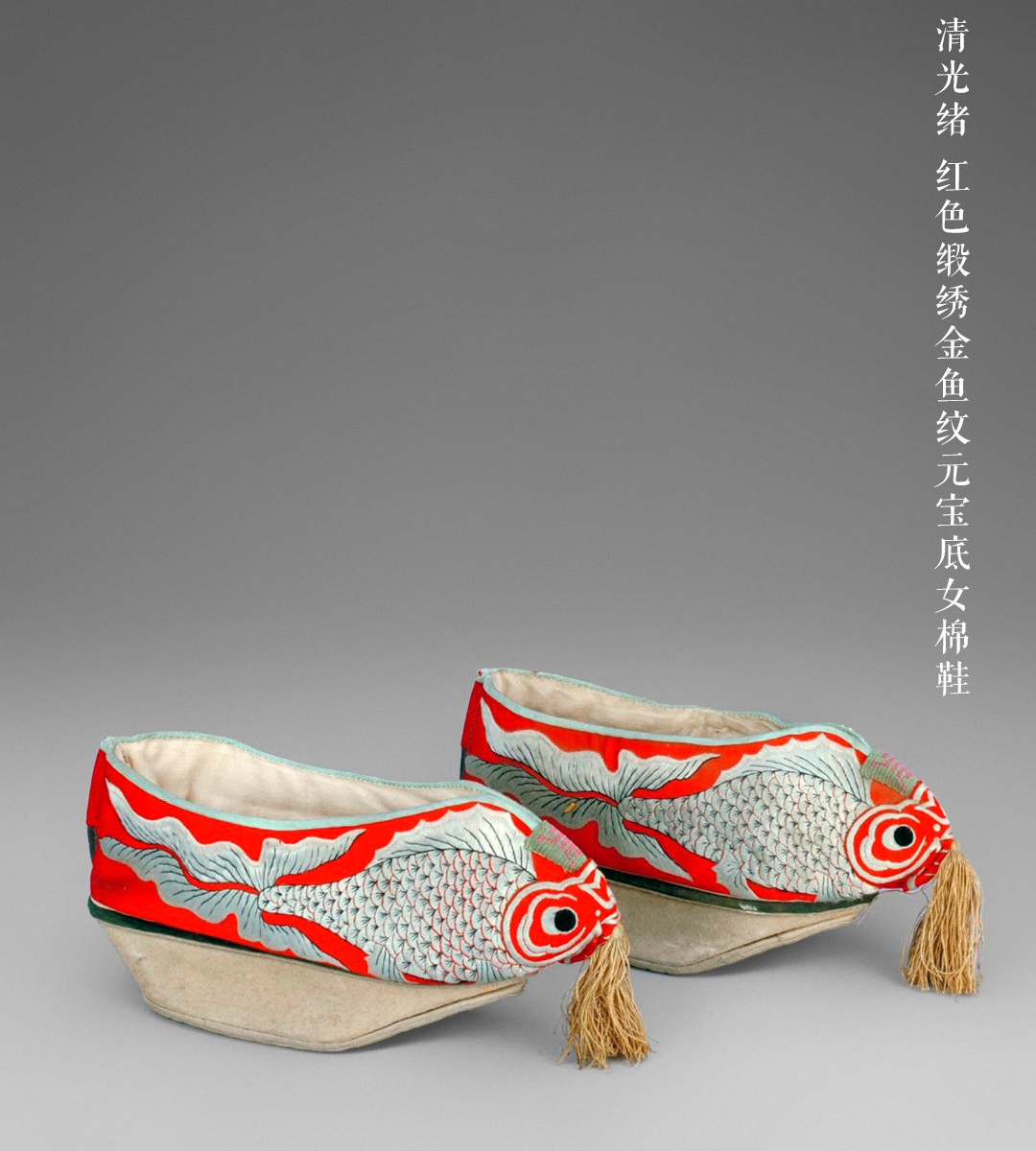 Туфли знаменных женщин на платформе в виде денежного слитка с вышитыми золотыми рыбками (19 век)