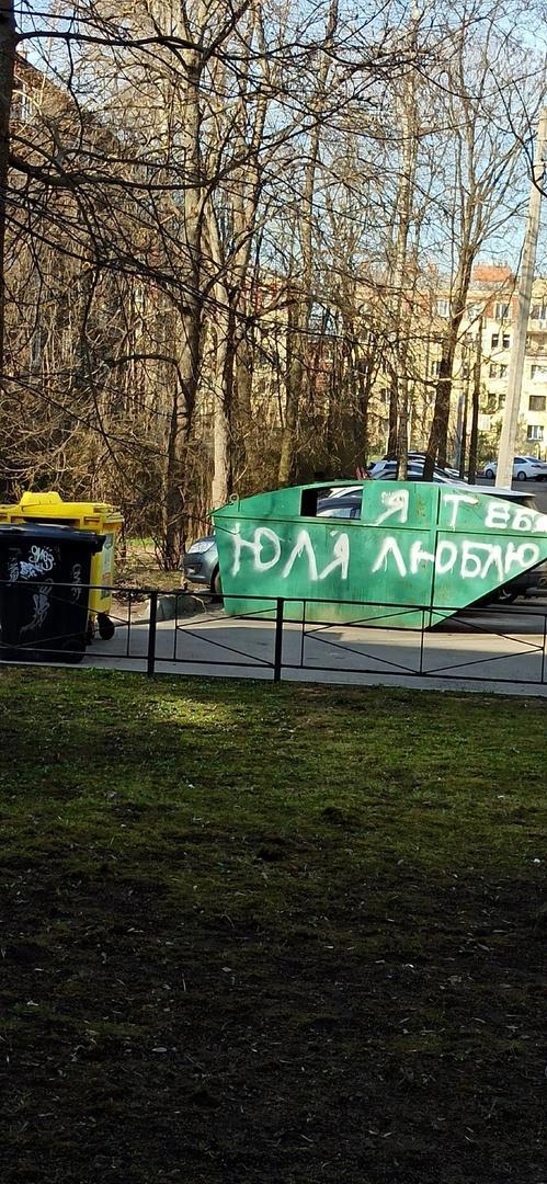Или - помойка. Здоровый контейнер для мусора и на нём надпись во весь контейнер: "Юля, я тебя люблю!" Таковы они, лики любви...