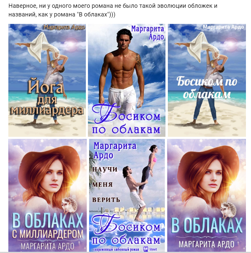 Это единственная моя книга, которую уже закончив, я полностью переписала заново. И обложек она много пережила. Теперь это просто "В облаках" - история, как две психологические травмы притянулись друг к другу, и что из этого вышло. Как ни странно, это тем не менее комедия на фоне йоговского ретрита и Черного моря.