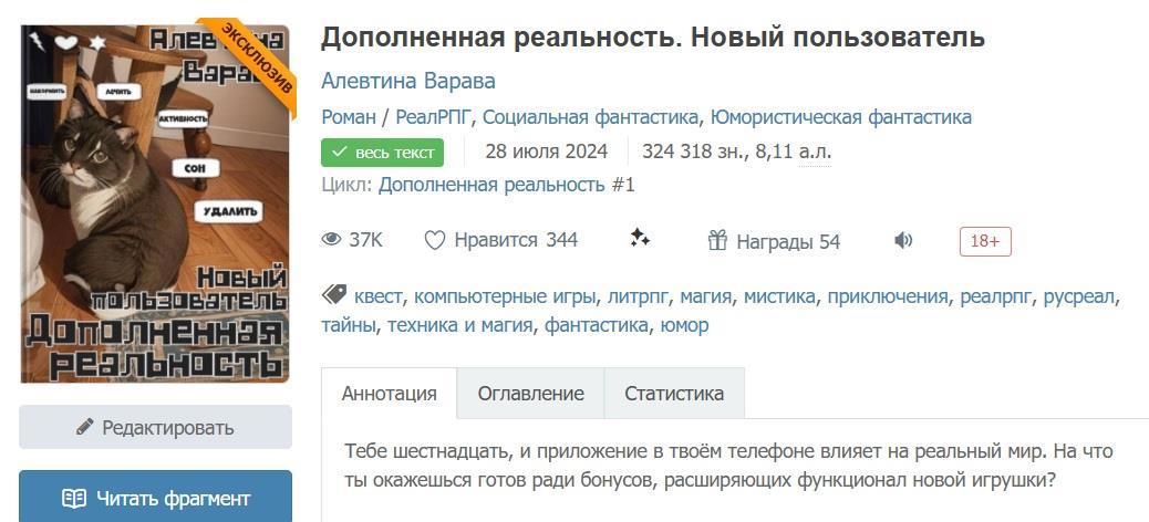 Автор: Алевтина ВараваСегодня и завтра книгу "Дополненная реальность. Новый пользователь" можно прочесть бесплатно, все главы открыты. История оболтуса-Пашки, в руки которого попала необычная игра с особыми возможностями, в которые он не сразу поверил. Никакого нагибаторства, минимум статов, загадку функционала можно разгадать логически раньше героя. Это книга о жизни современного подростка из не очень благополучной семьи, с юморком и честно написанным образом очень неидеального героя.