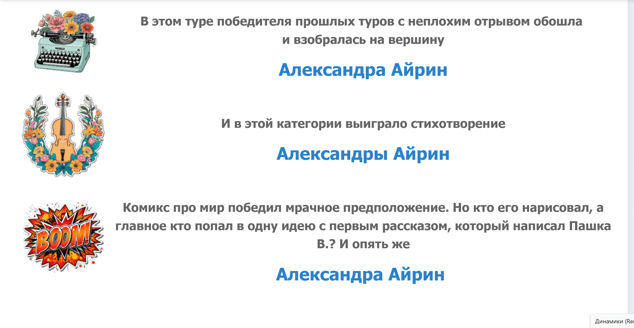 Александра участвует в игре Твори Кратко, начиная с третьего тура. И уже через два захода, в пятом туре игры, она сумела совершить то, что удается лишь считанным участникам — она сделала так называемый "хет трик", выиграв сразу в трех категориях: короткий текст, стих и ... комикс