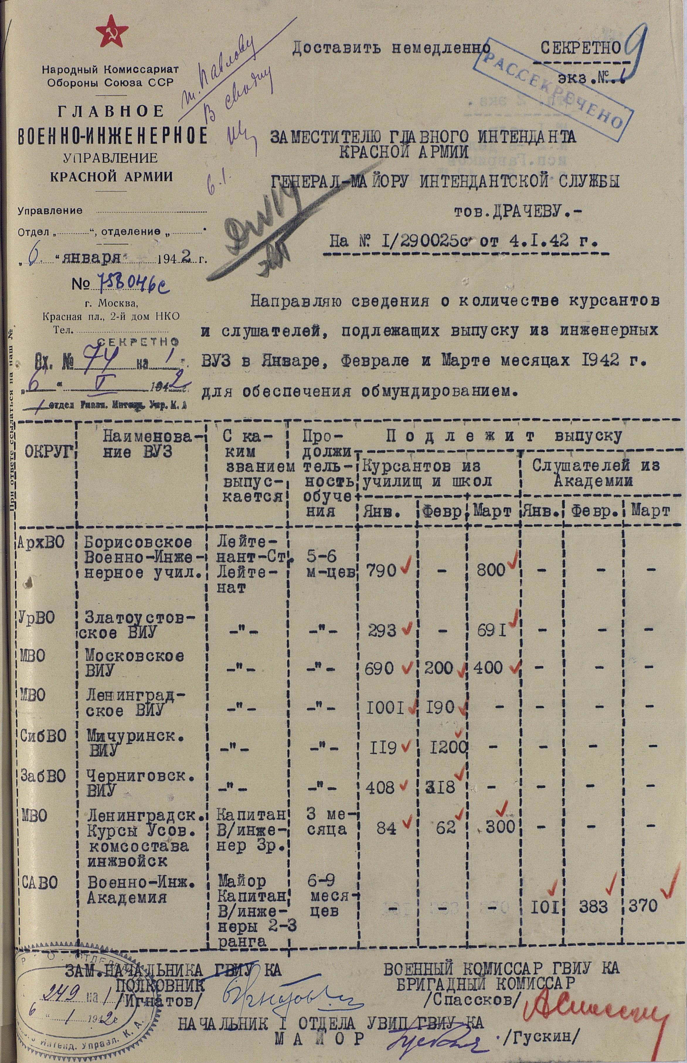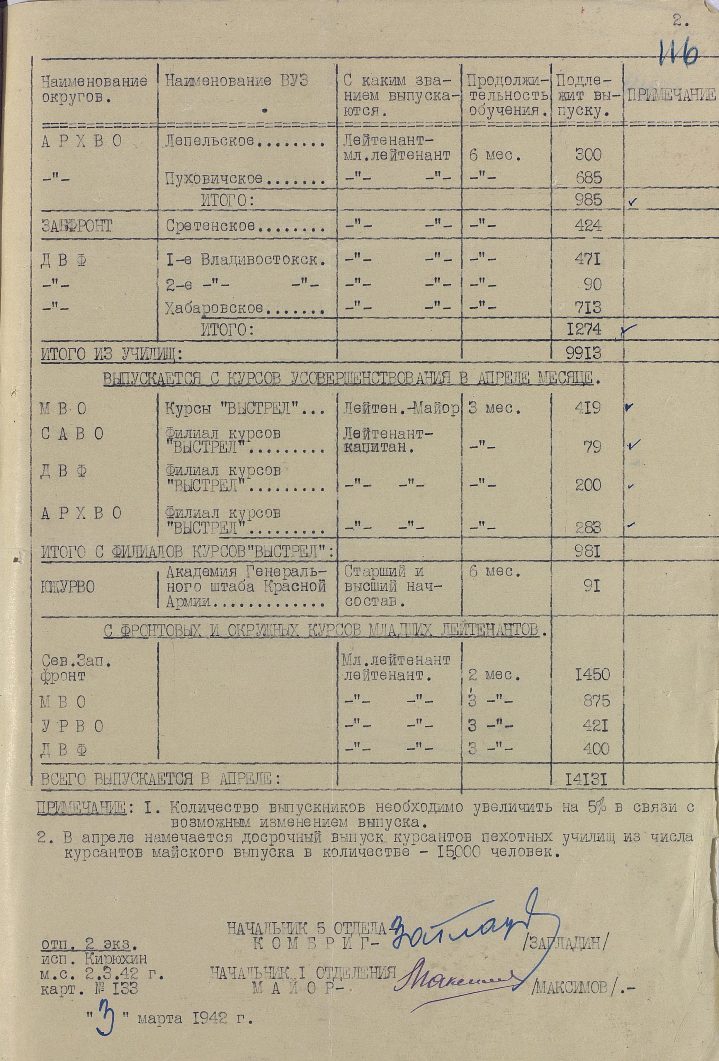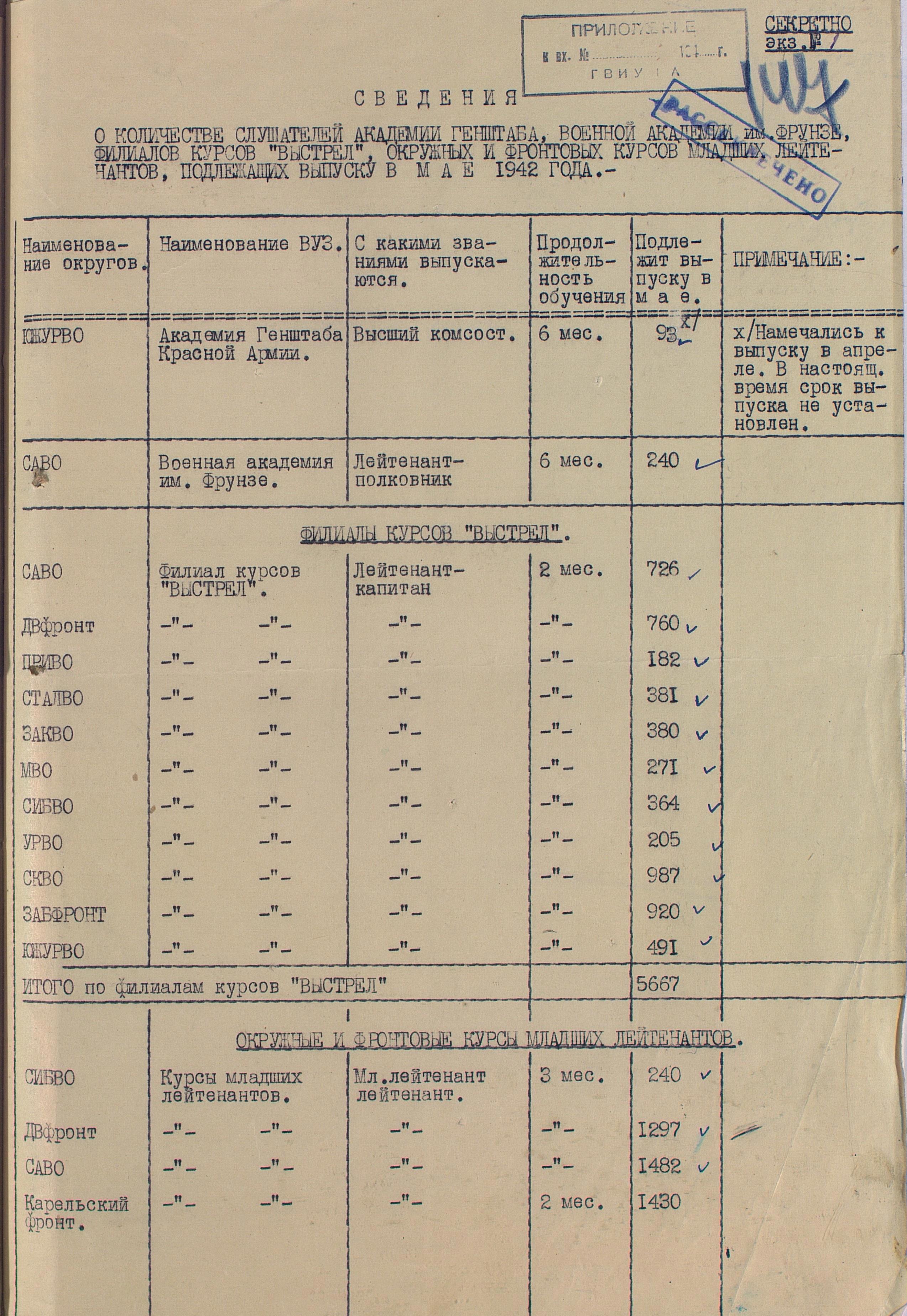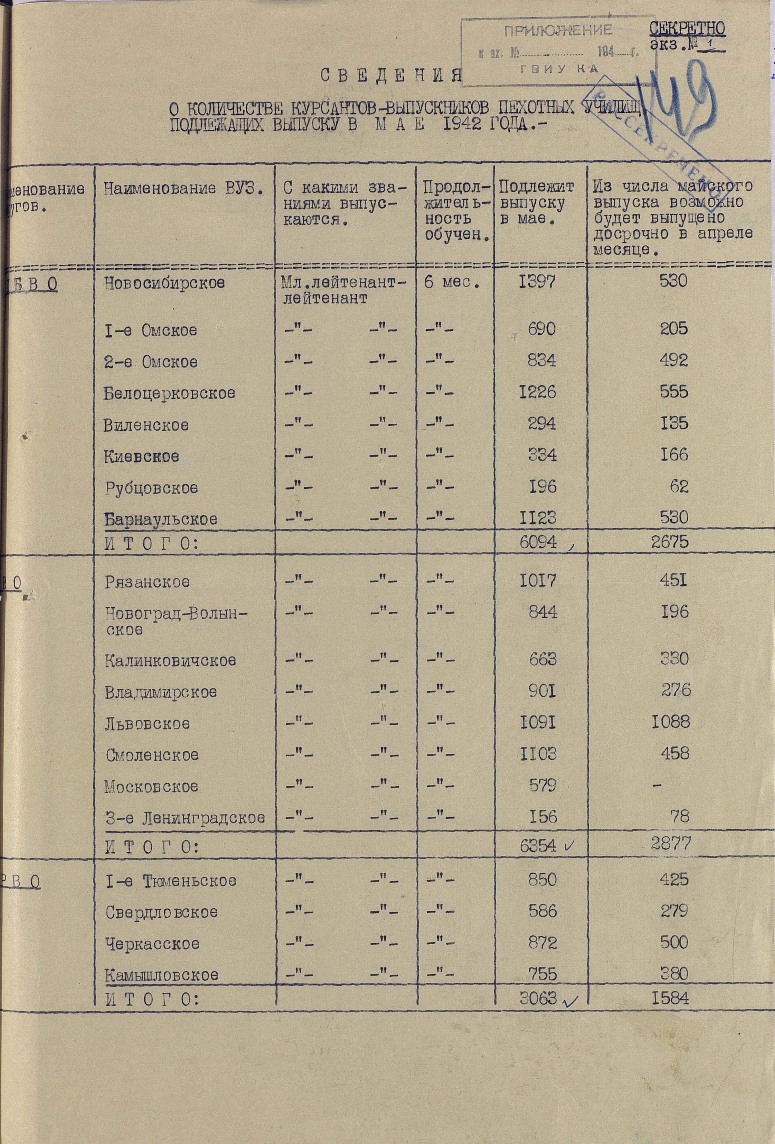 Сведения по ВУЗам 1942 года намного подробнее и охватывают большинство видов и родов войск, но и они, увы, не полны. И хотя, среди документов есть, к примеру, доклад по Центральной военно-технической школе собаководства, но вот данных по учебным заведениям, готовившим танкистов, специалистов химзащиты и некоторых других, у меня к сожалению нет. Даже не знаю, есть ли необходимость в их поиске или имеющихся в интернете данных вполне хватает.