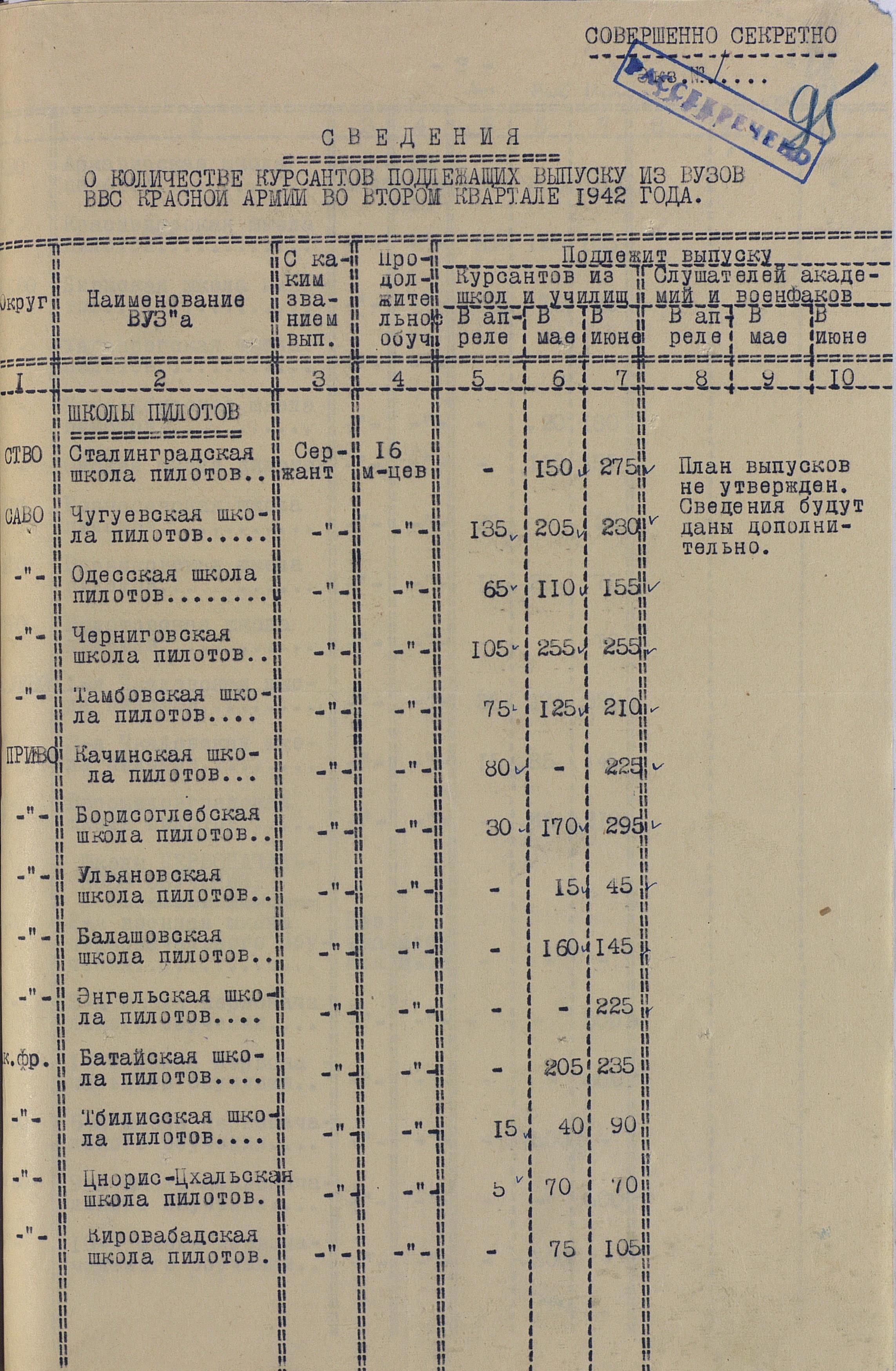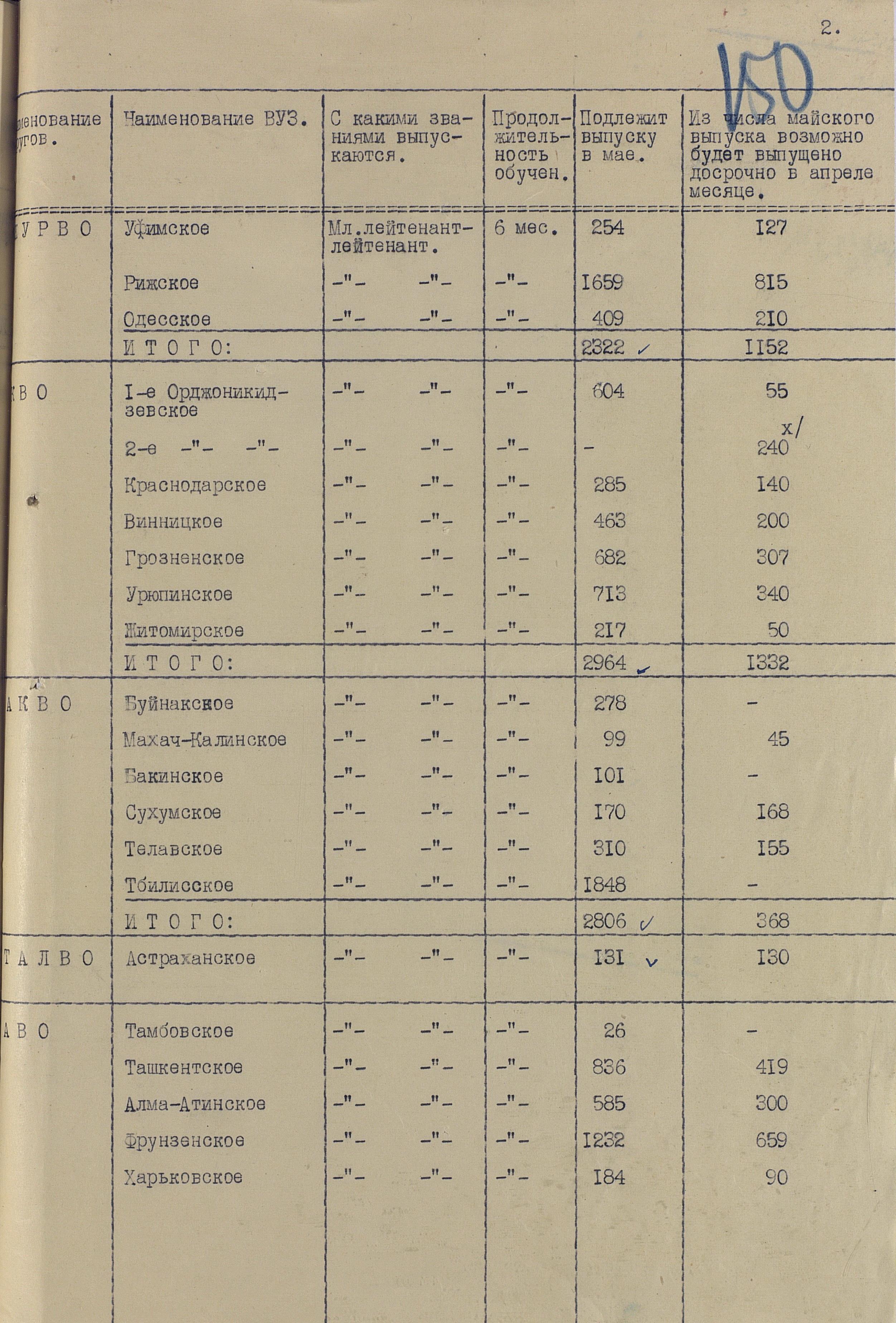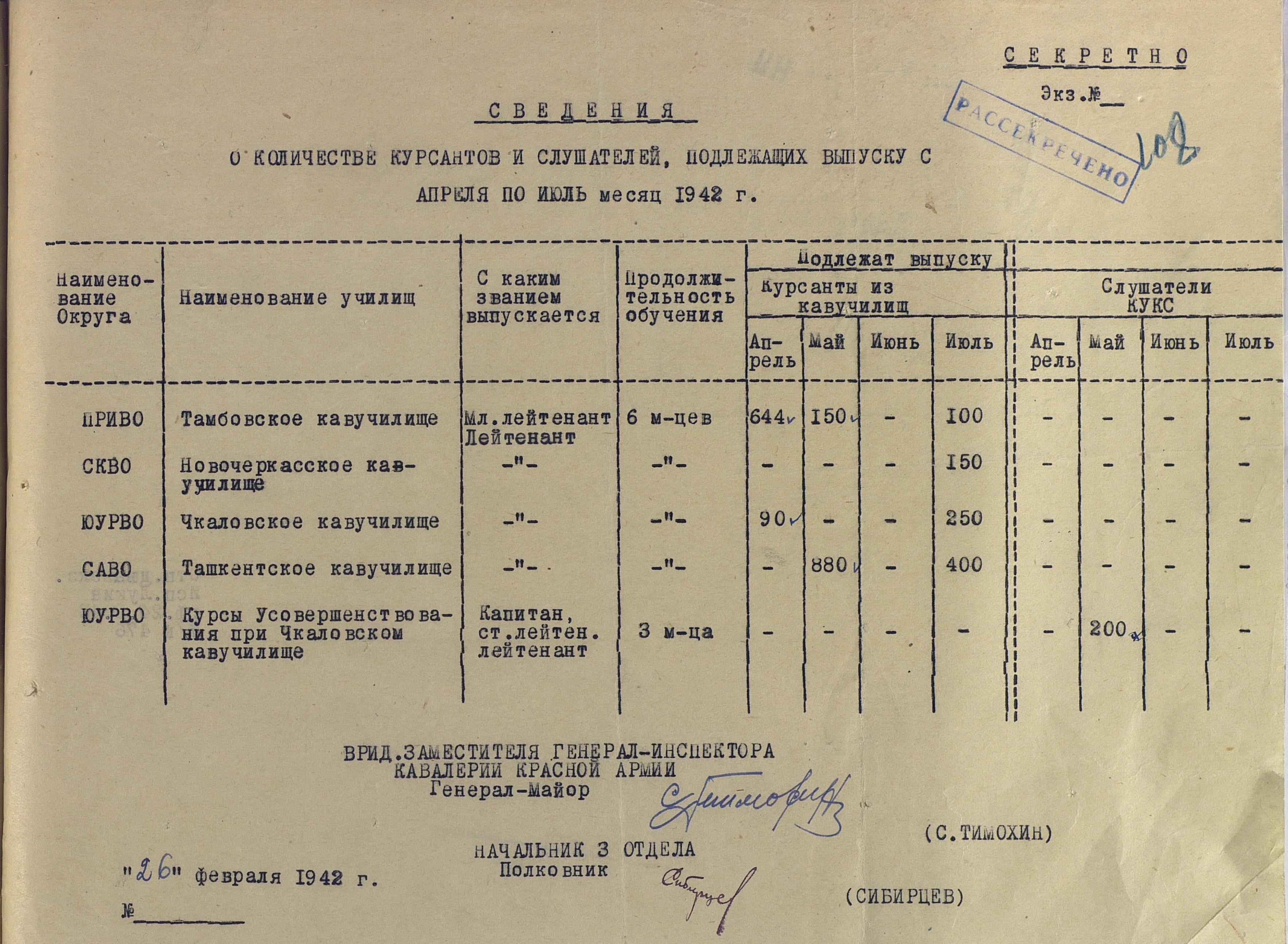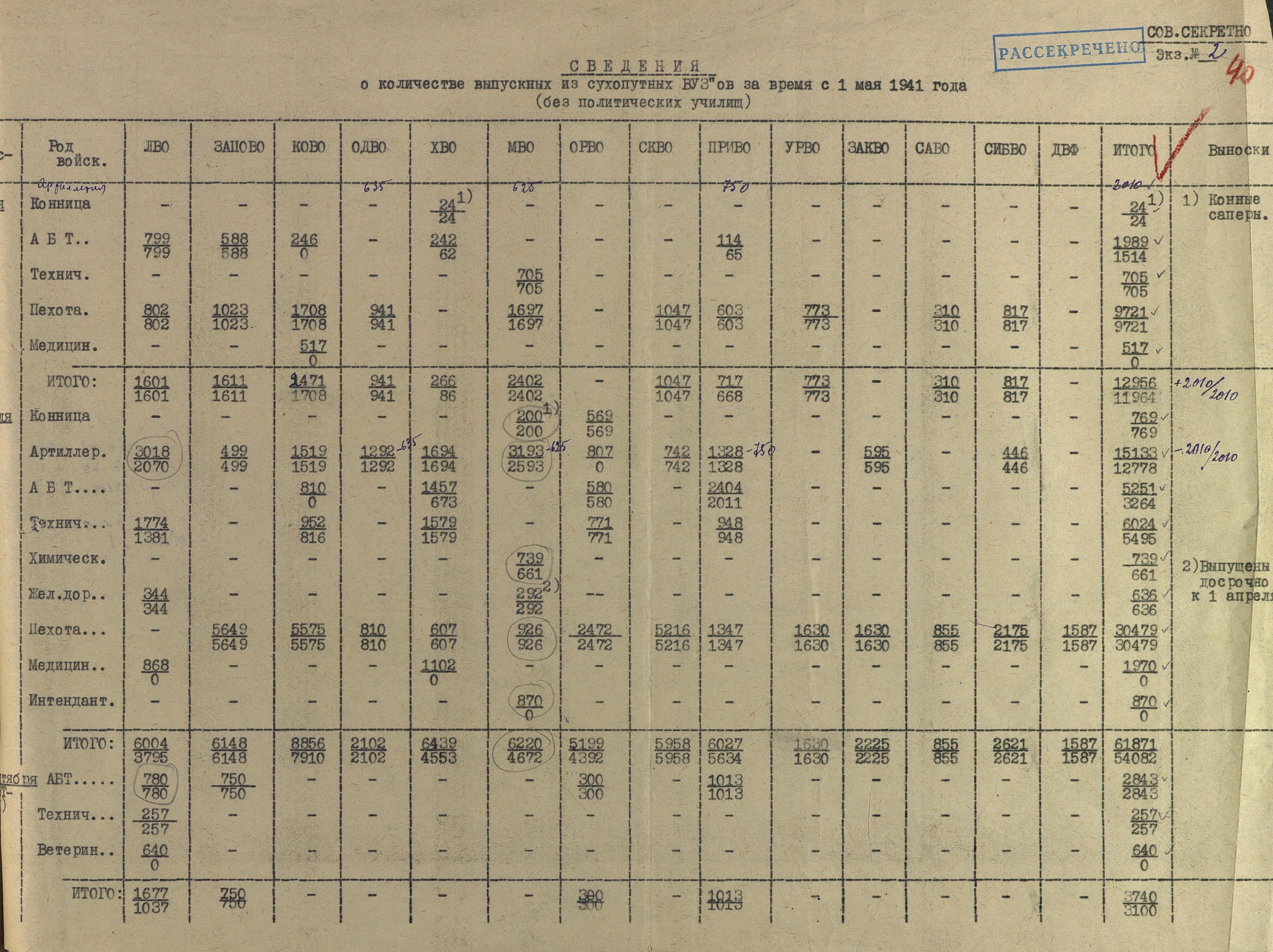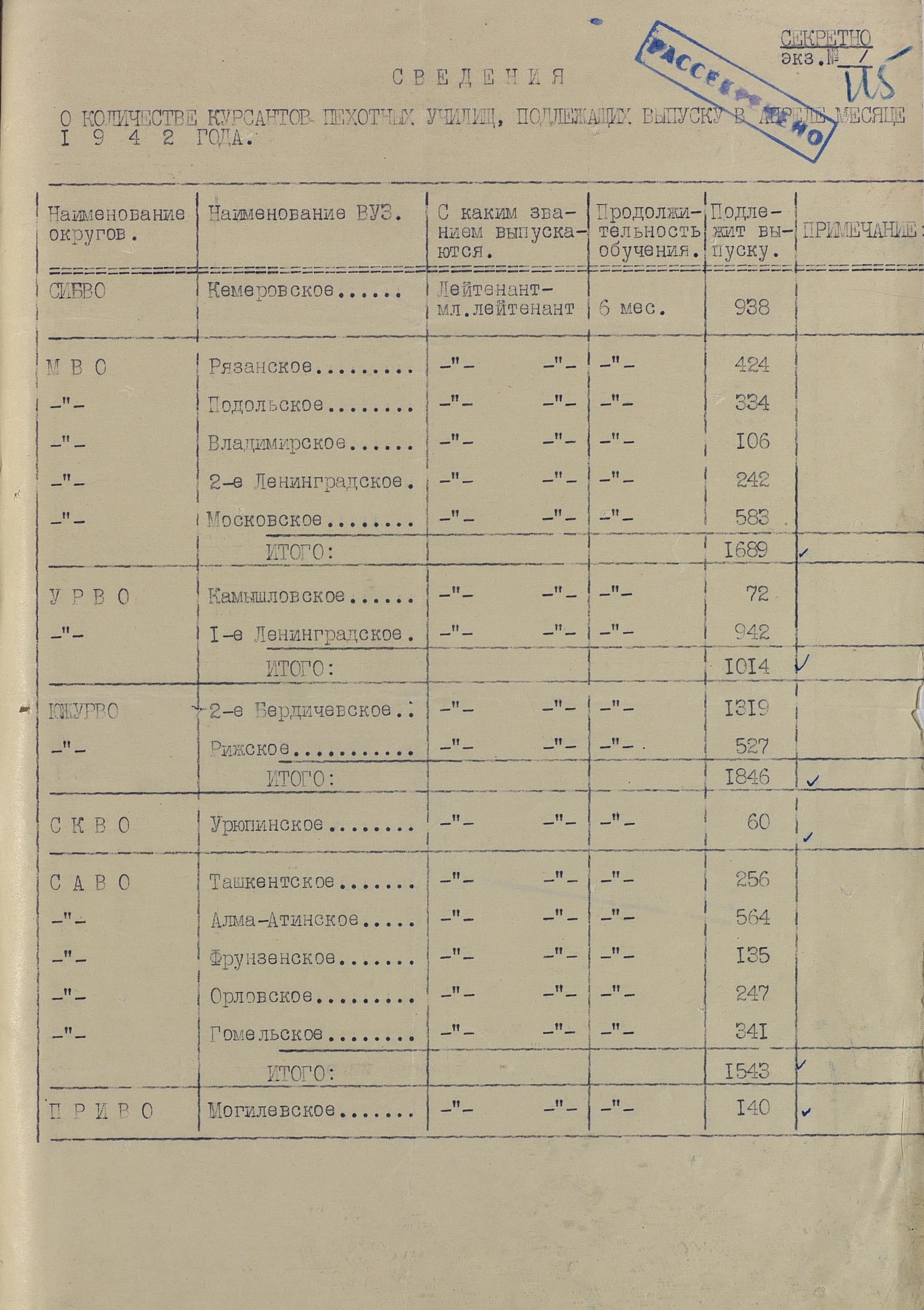 Сведения по ВУЗам 1942 года намного подробнее и охватывают большинство видов и родов войск, но и они, увы, не полны. И хотя, среди документов есть, к примеру, доклад по Центральной военно-технической школе собаководства, но вот данных по учебным заведениям, готовившим танкистов, специалистов химзащиты и некоторых других, у меня к сожалению нет. Даже не знаю, есть ли необходимость в их поиске или имеющихся в интернете данных вполне хватает.