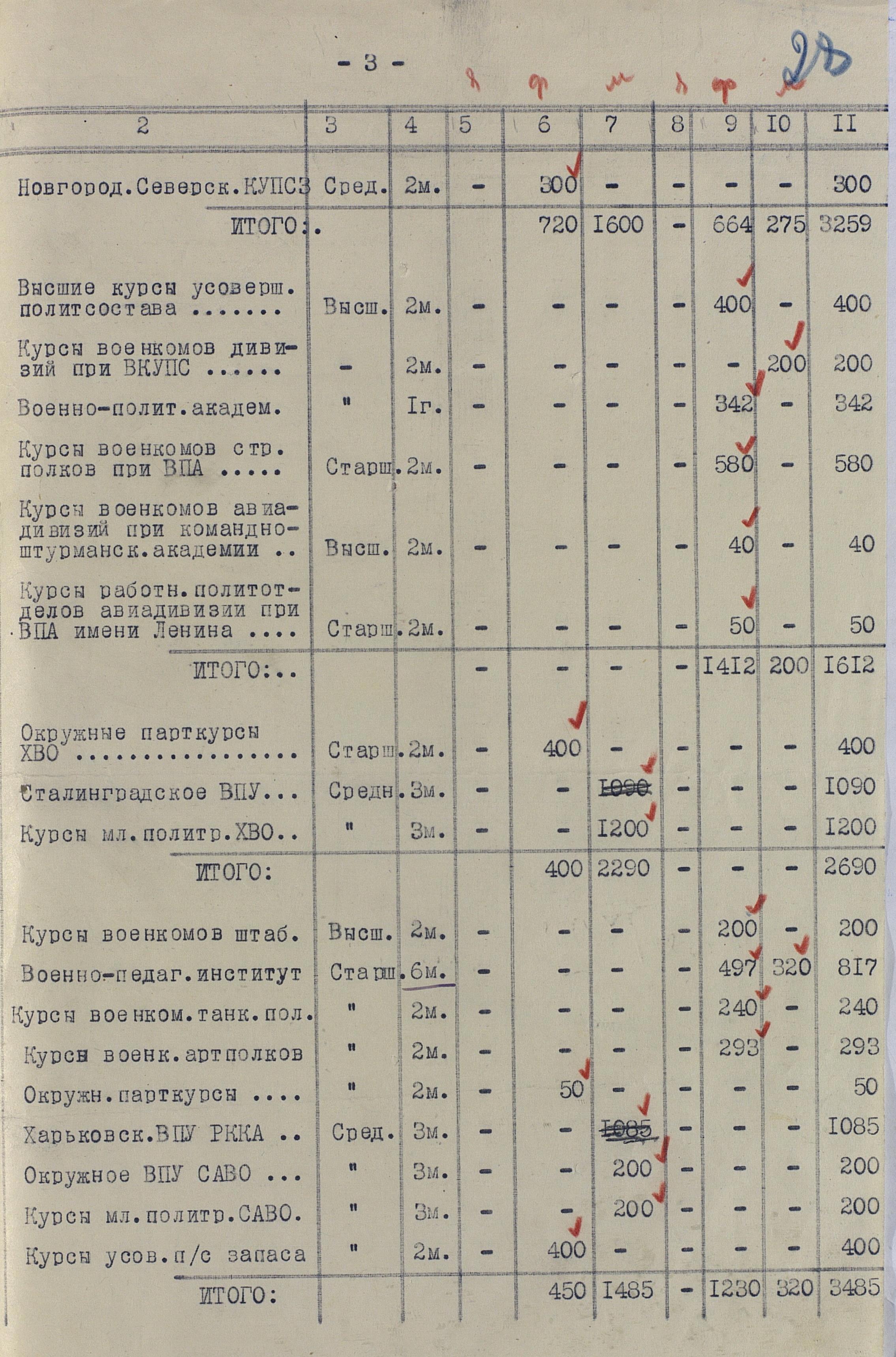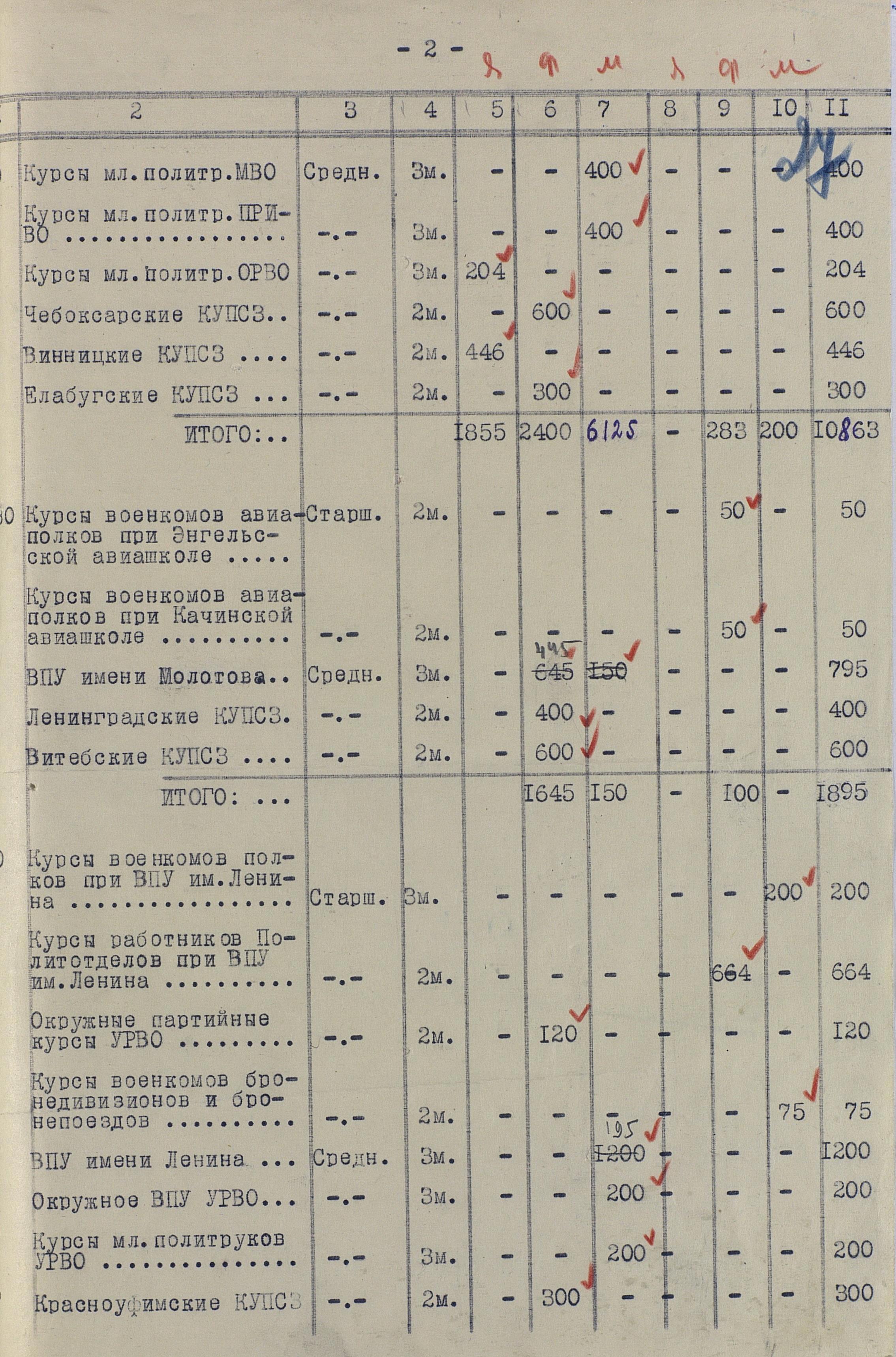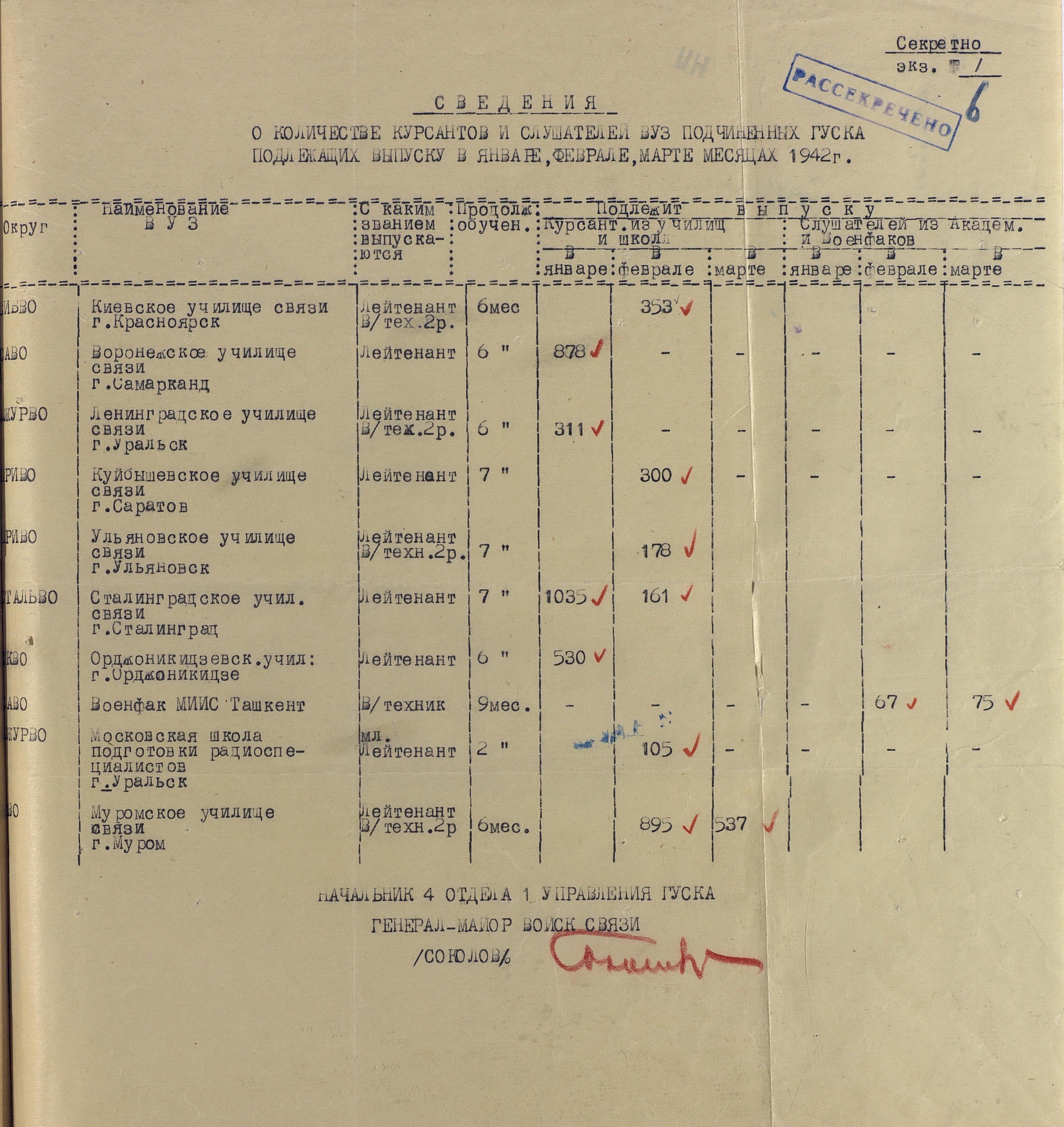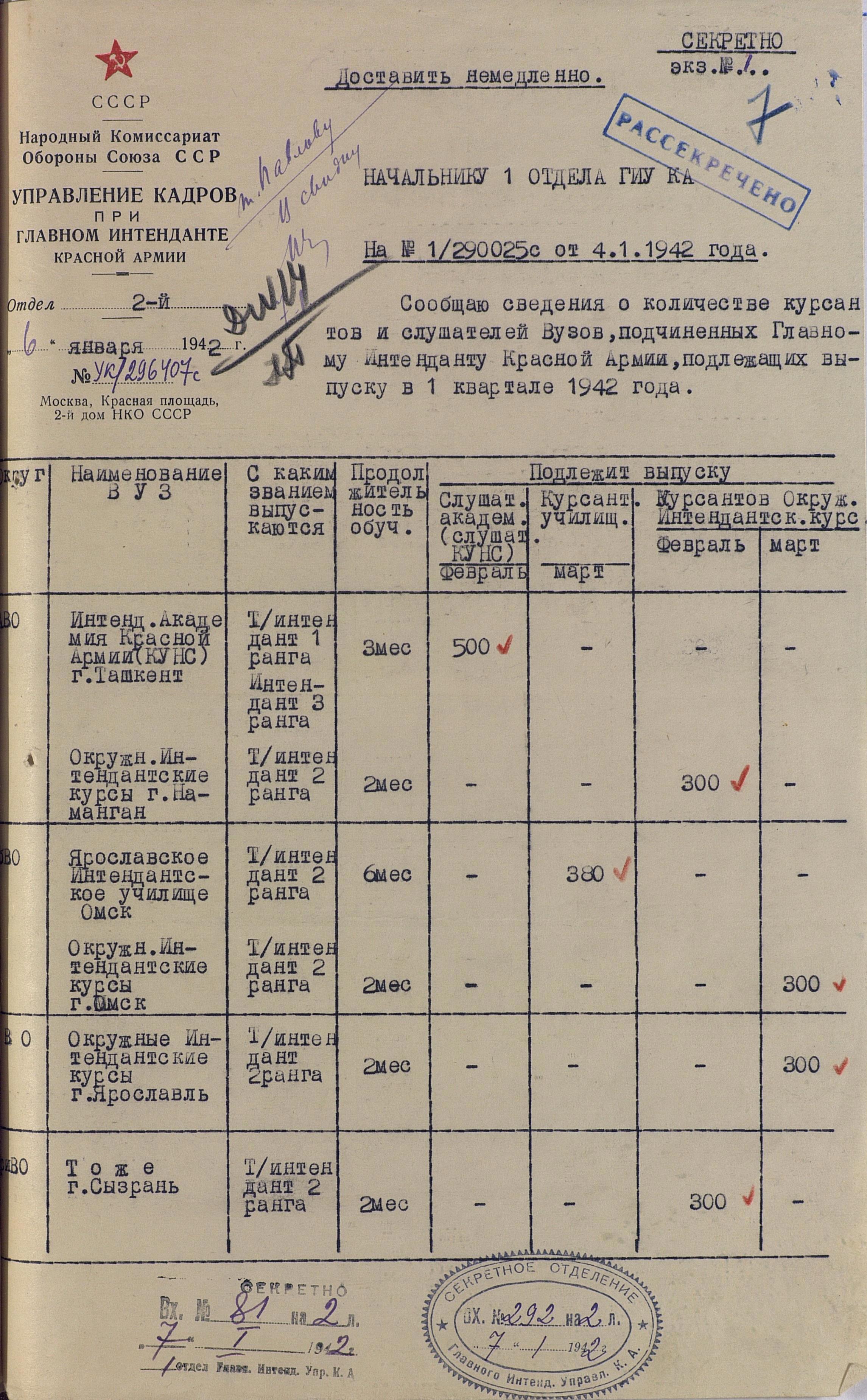 Сведения по ВУЗам 1942 года намного подробнее и охватывают большинство видов и родов войск, но и они, увы, не полны. И хотя, среди документов есть, к примеру, доклад по Центральной военно-технической школе собаководства, но вот данных по учебным заведениям, готовившим танкистов, специалистов химзащиты и некоторых других, у меня к сожалению нет. Даже не знаю, есть ли необходимость в их поиске или имеющихся в интернете данных вполне хватает.
