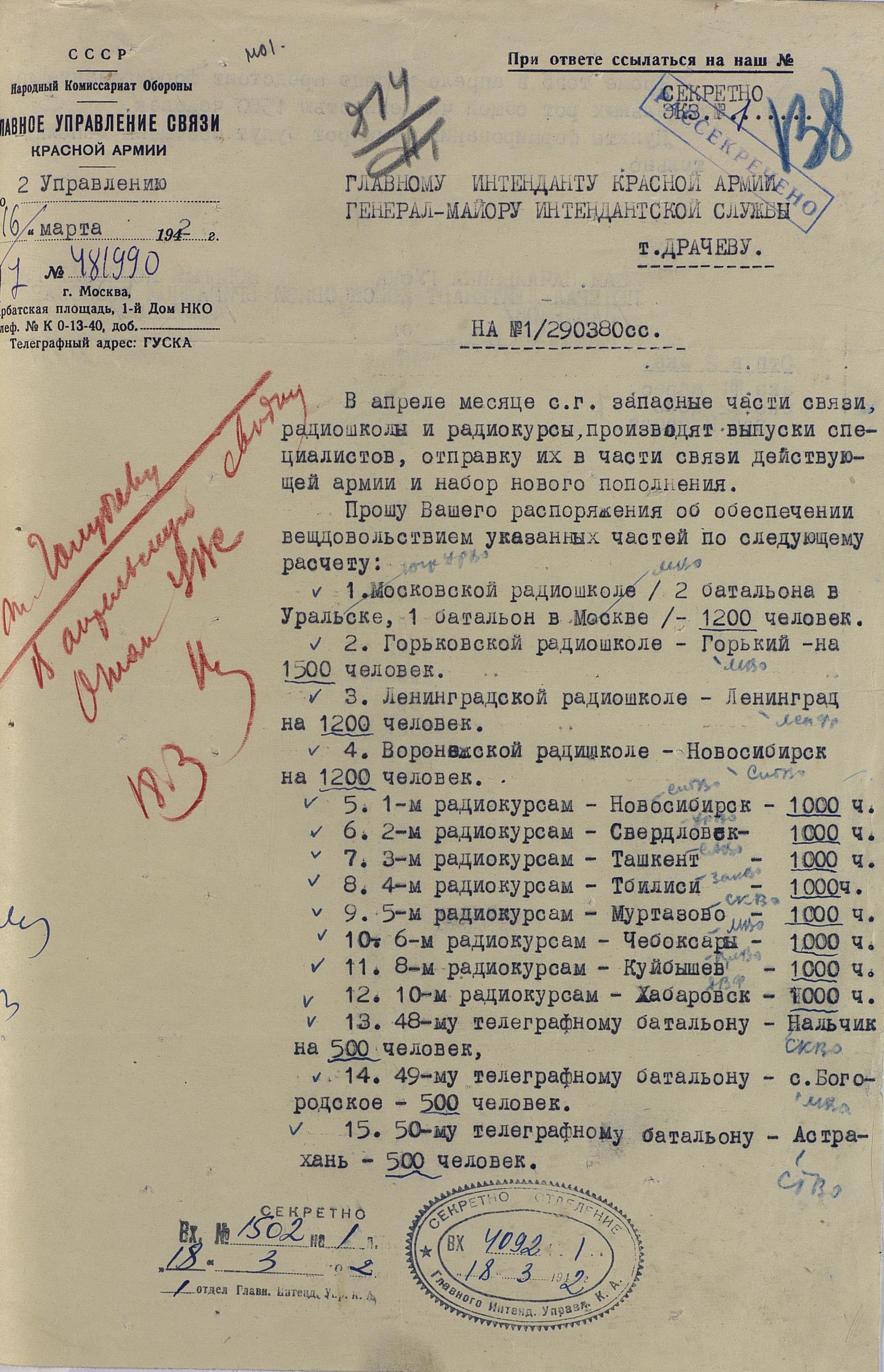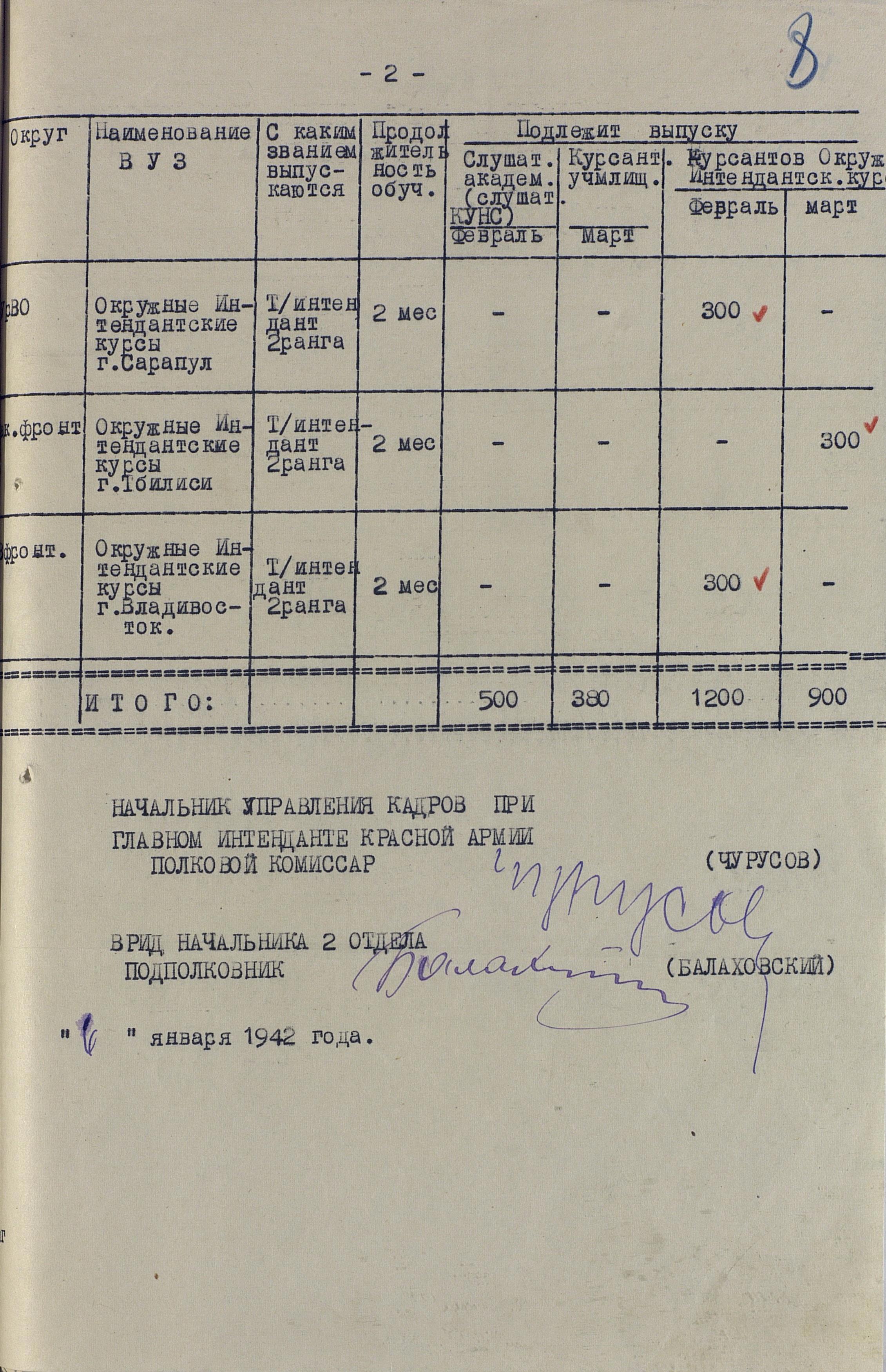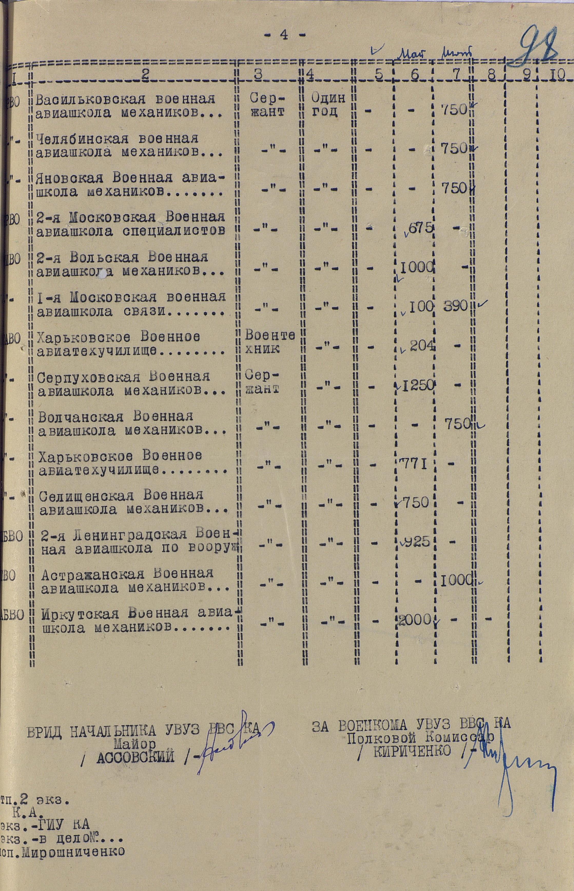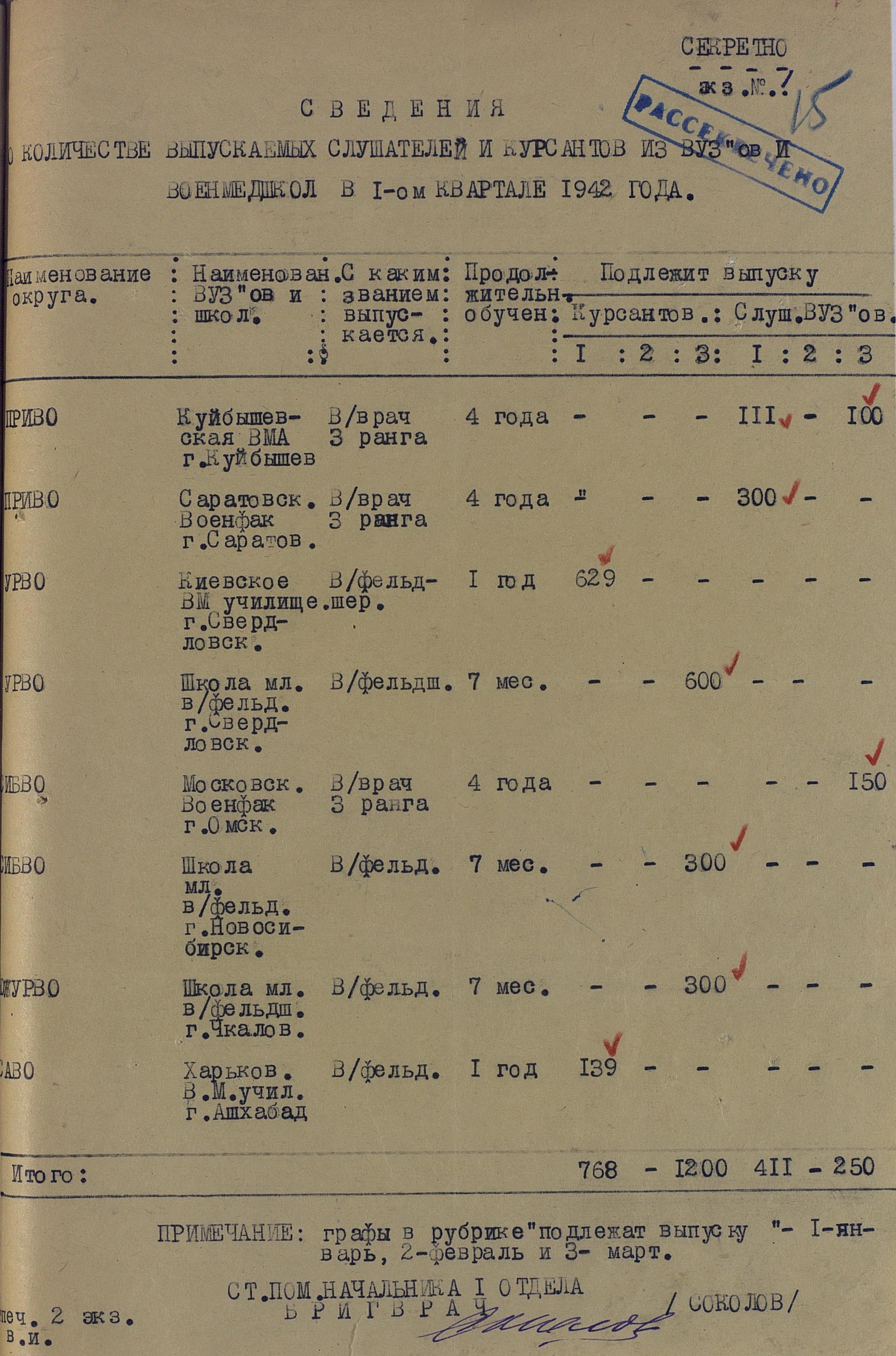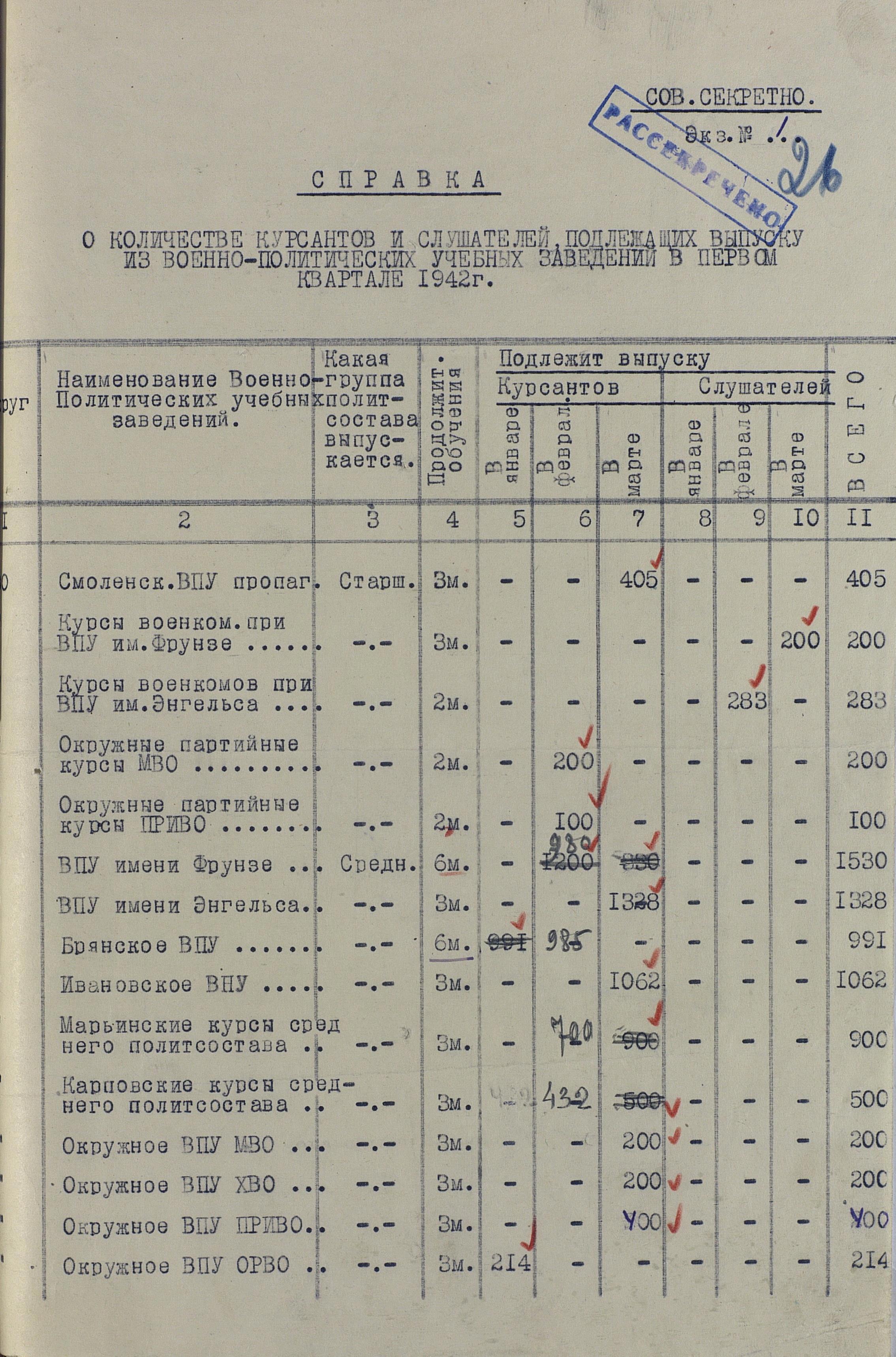 Сведения по ВУЗам 1942 года намного подробнее и охватывают большинство видов и родов войск, но и они, увы, не полны. И хотя, среди документов есть, к примеру, доклад по Центральной военно-технической школе собаководства, но вот данных по учебным заведениям, готовившим танкистов, специалистов химзащиты и некоторых других, у меня к сожалению нет. Даже не знаю, есть ли необходимость в их поиске или имеющихся в интернете данных вполне хватает.