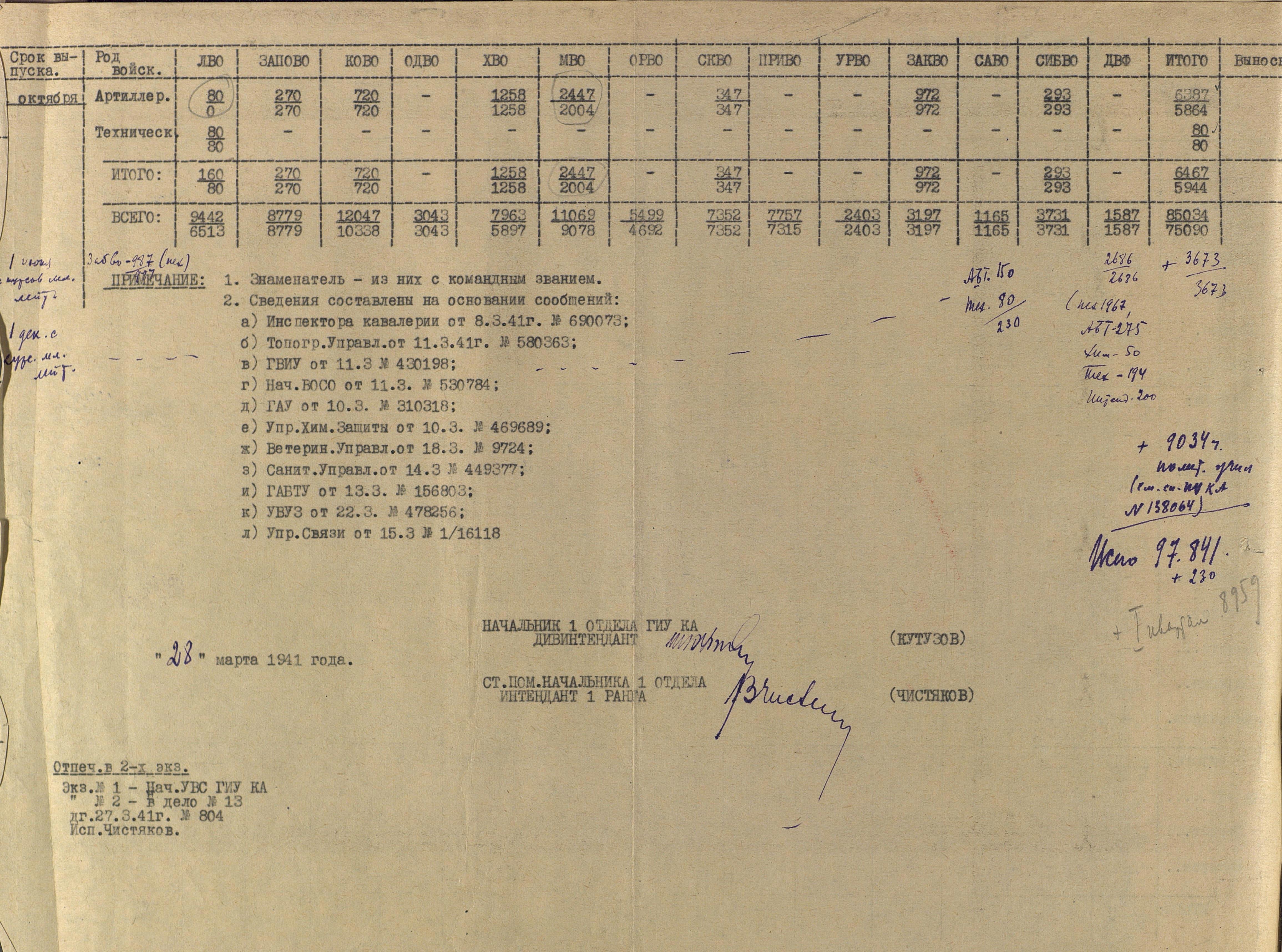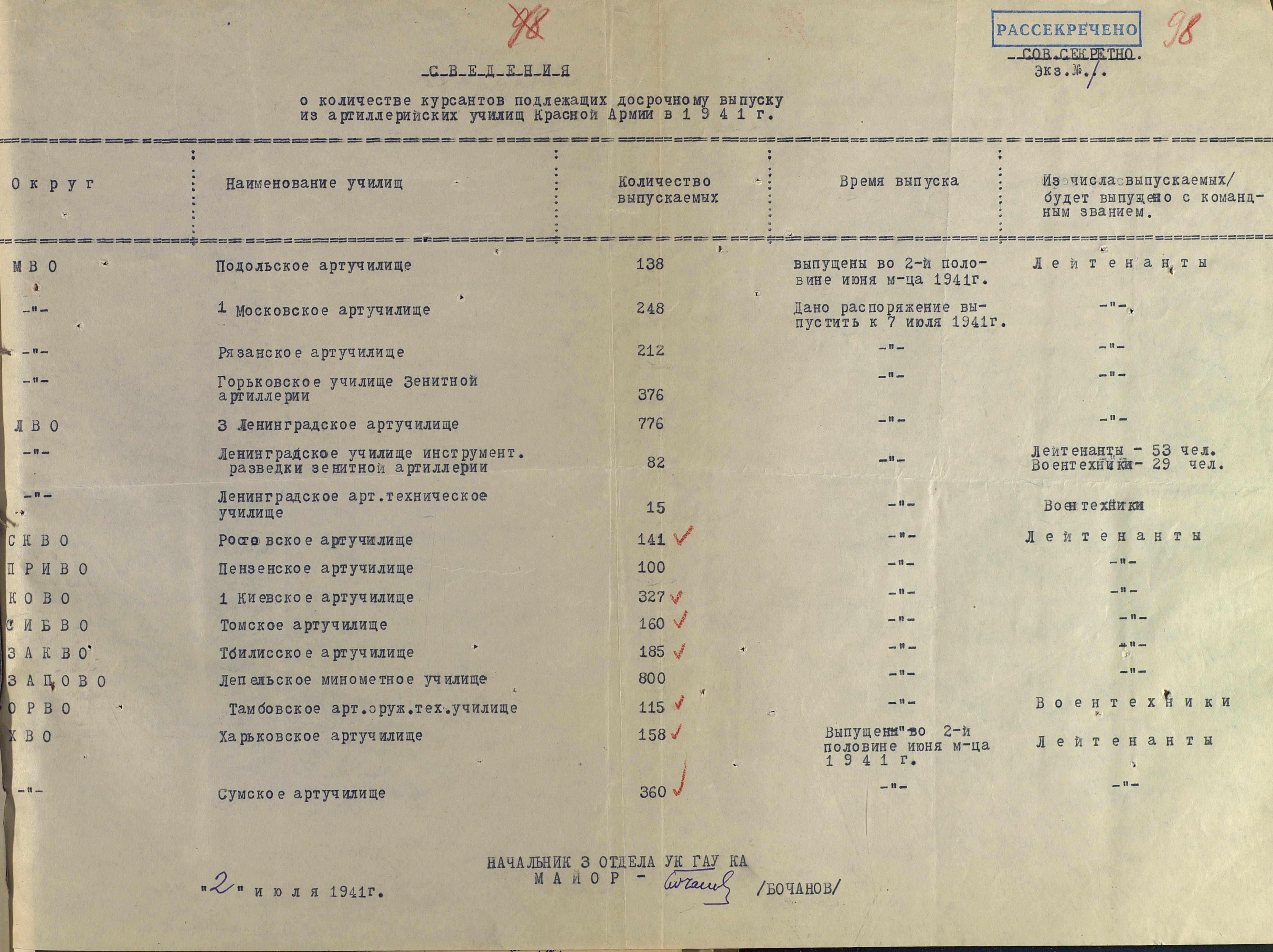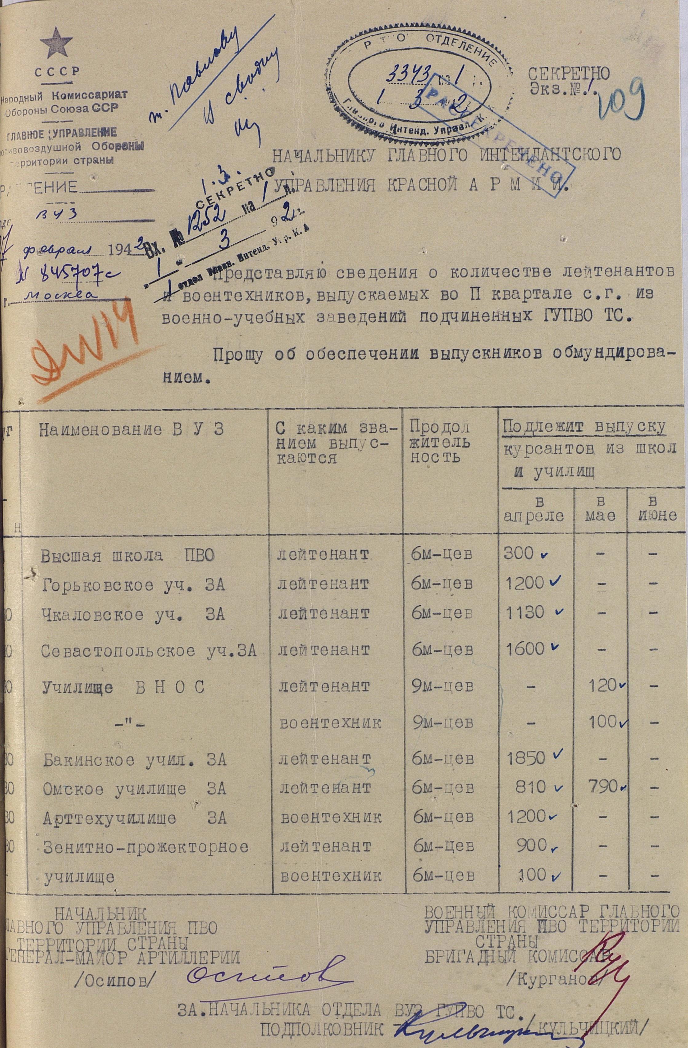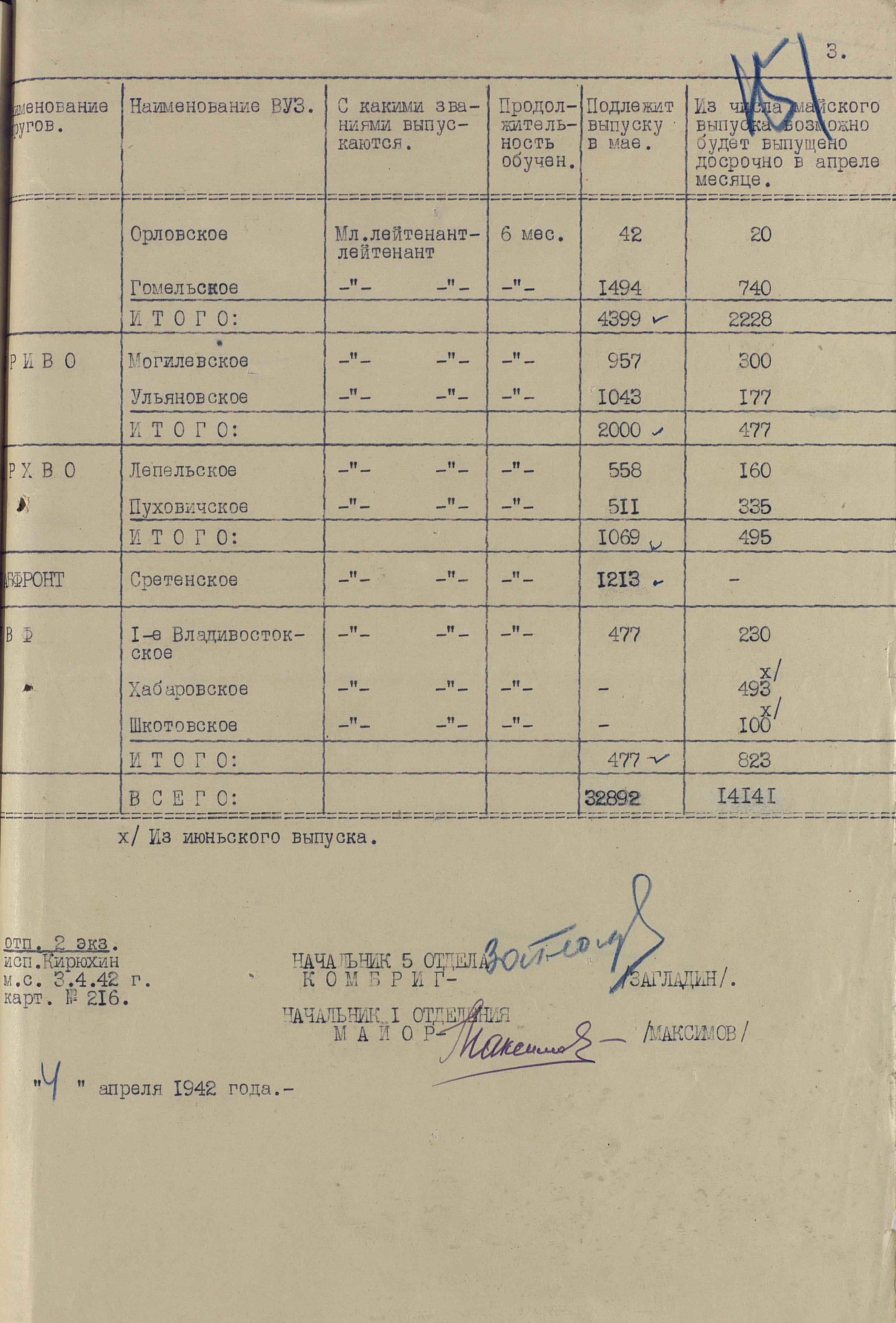 А это уже первый, военный, досрочный выпуск артиллеристов. И хотя из документа можно узнать и перечень ВУЗов, и количество выпускников, за скобками остались школы младшего начальствующего и командного состава артиллерии.