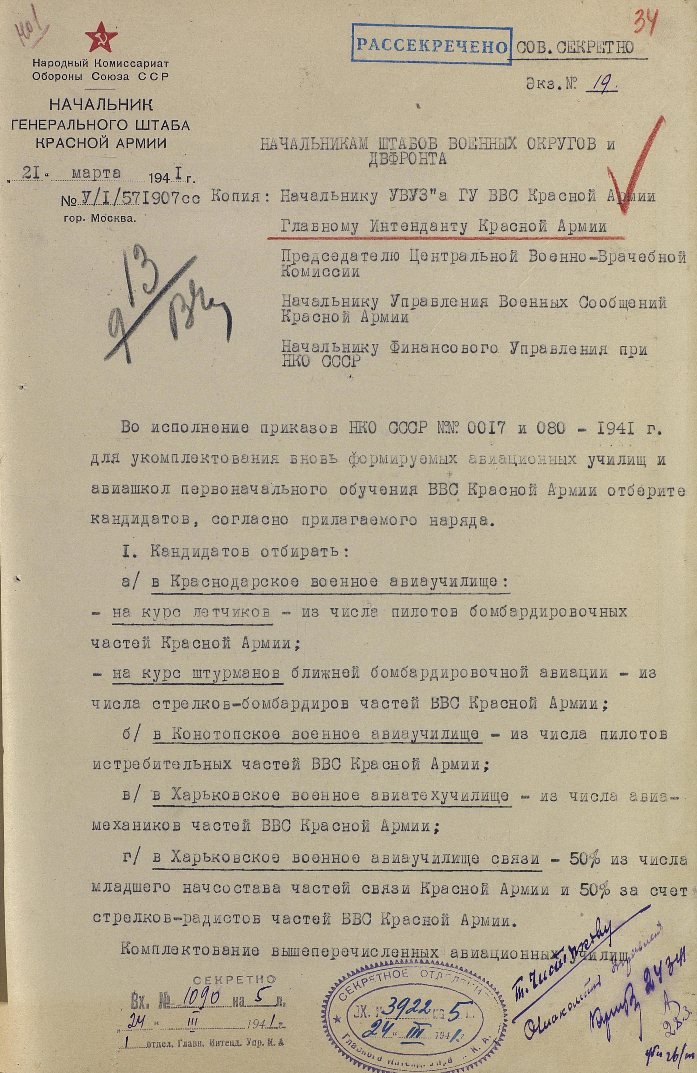 Об увеличении численности авиашкол ВВС мы уже говорили при обсуждении публикации Предвоенный заказ для ВВС, утверждённый генералом Рычаговым . Среди документов, предлагаемых вашему вниманию сегодня, помимо распределения курсантов авиашкол между военными округами, есть ещё одно интересное указание: распоряжение начальника Генерального штаба Красной Армии о порядке набора кандидатов в авиаучилища: