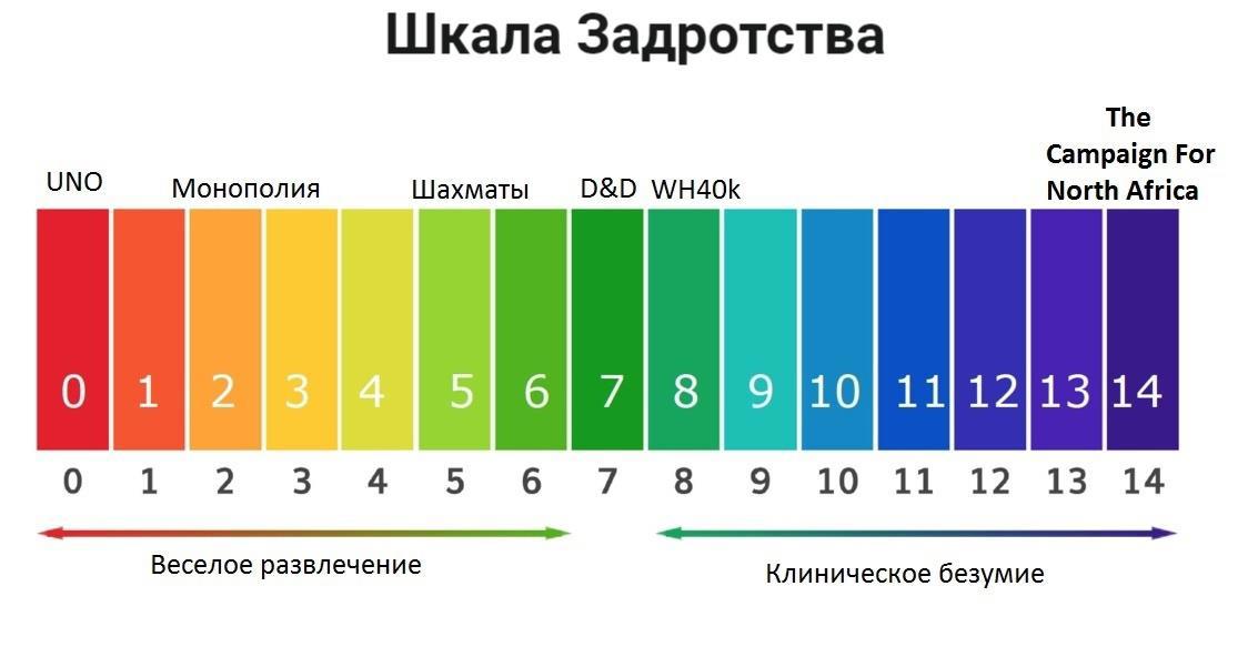 Итак, это Варгейм. Что-то вроде Risk!, но симулирующий Североафриканскую Кампанию Второй Мировой Войны. Всю. Целиком. Эта игра не без основания считается самой сложной настолкой в истории человечества. Возвращаясь к моей шкале задроства, опирающейся на порог входа и длину партии...