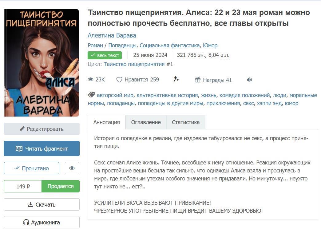 Автор: Алевтина ВараваСегодня и завтра (22-го и 23-го мая) все главы "Таинства пищепринятия. Алиса" открыты в свободном доступе. Читать комедию положений о попавшей в удивительный и абсурдный на первый взгляд мир, пошедший по другому культурному пути, можно по ссылке: Таинство пищепринятия. Алиса (ссылка на текст)