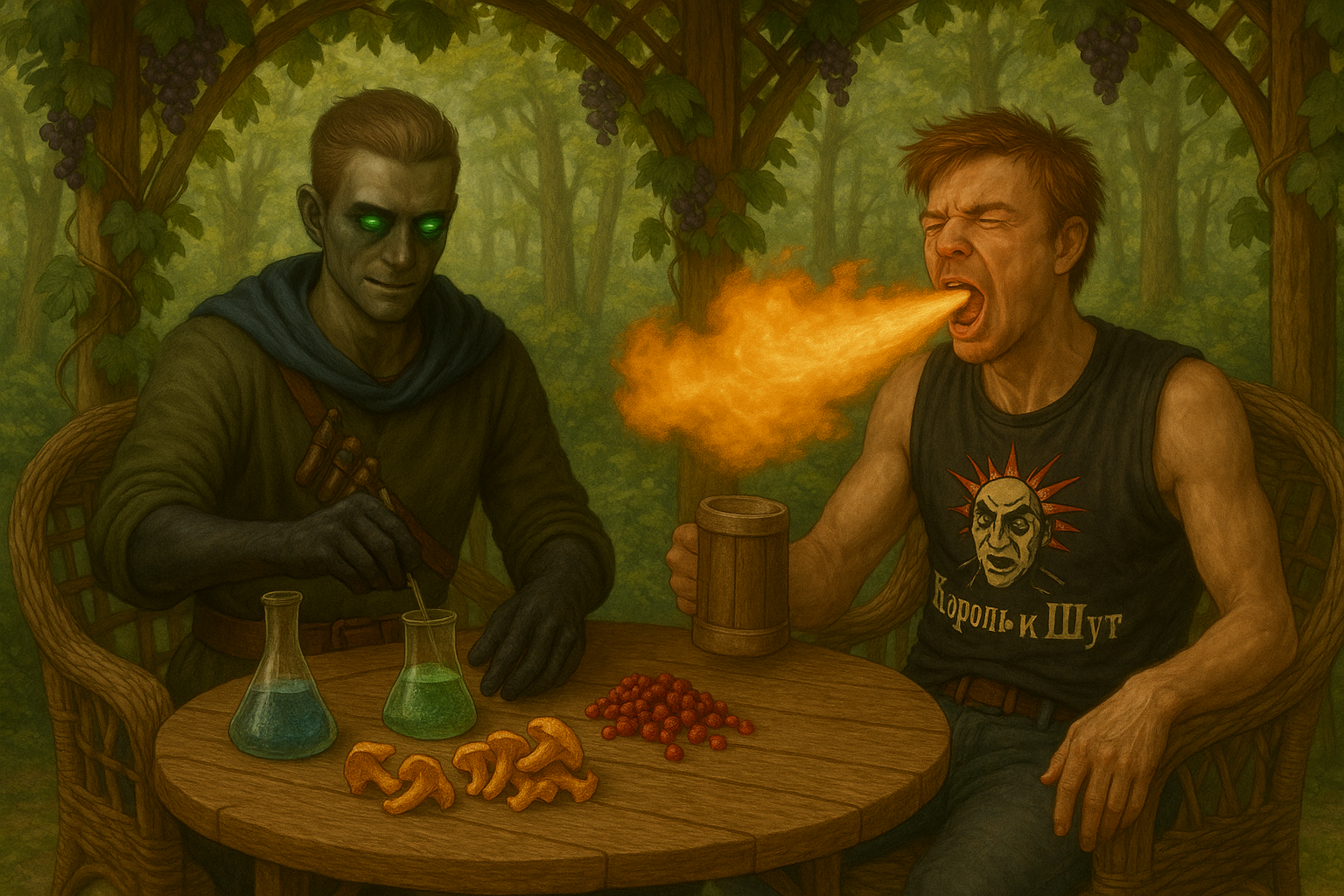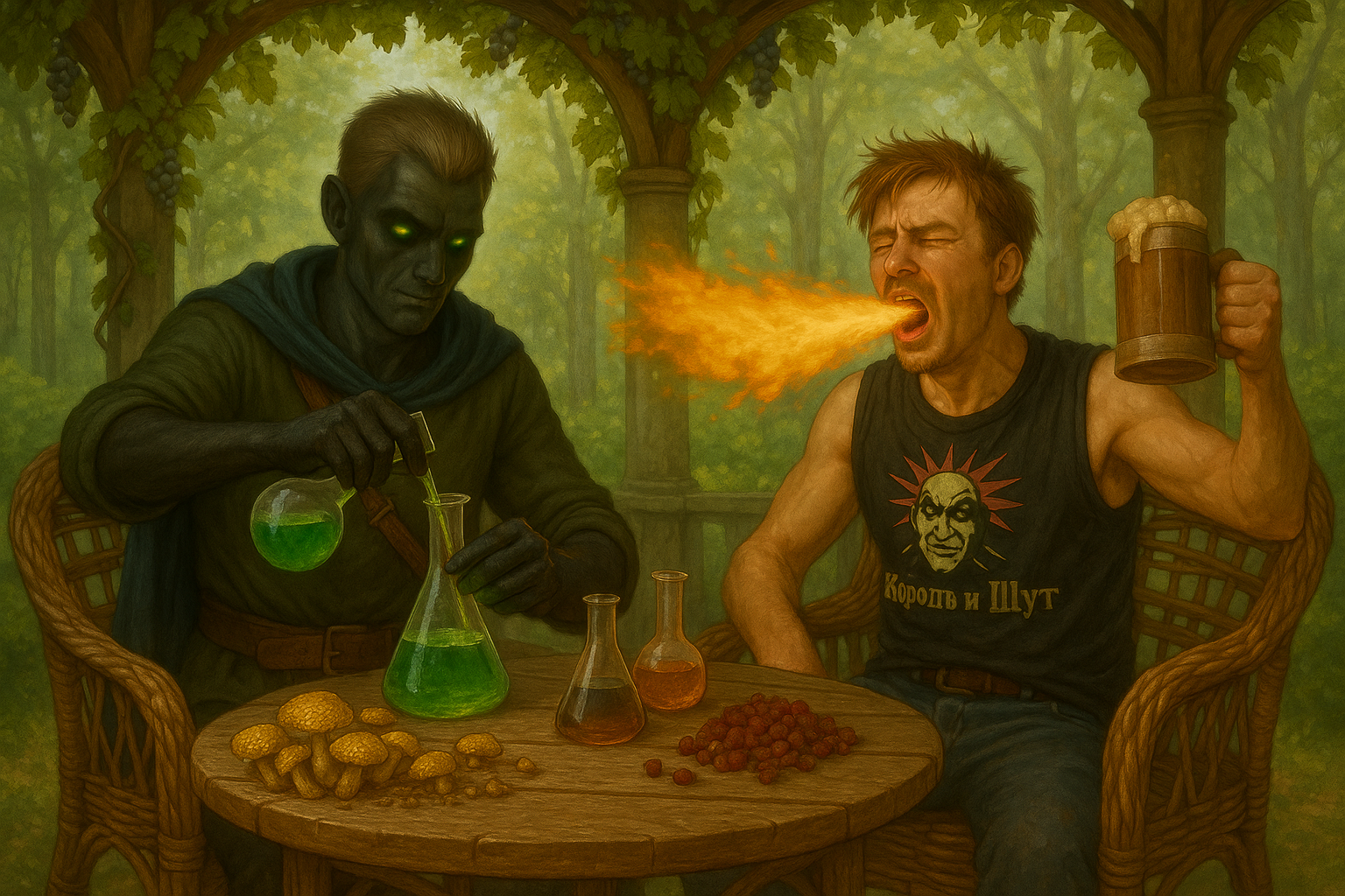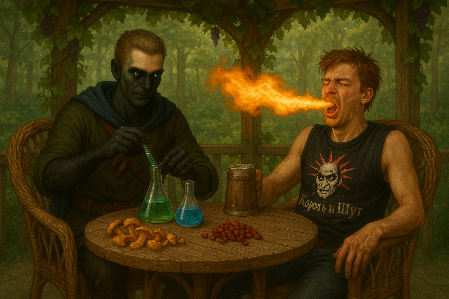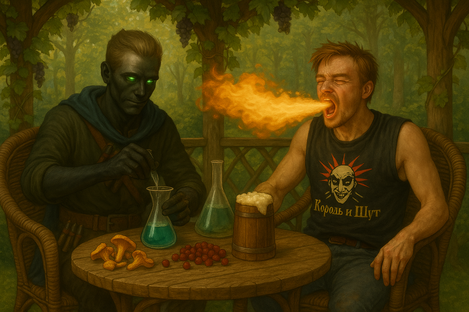 АлкХимик угощает Веселителя отрезвляющим зельем.