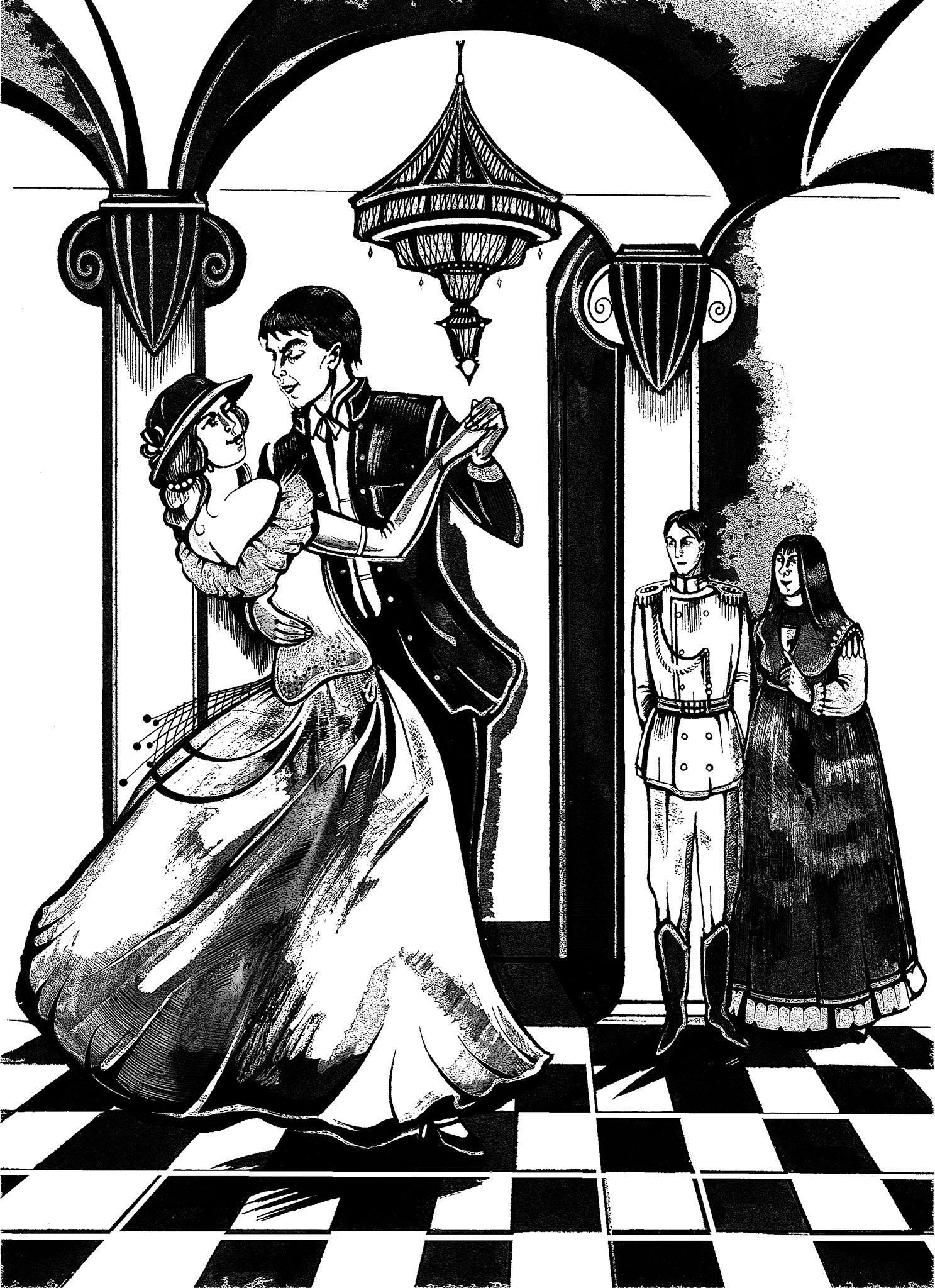 Пиксель и дочь губернатора Софи Фокс танцуют, а Карл и Ефросинья Пронина за ними наблюдают. Иллюстрация к 16 главе "Полёта Птитса": Диана Кузнецова.