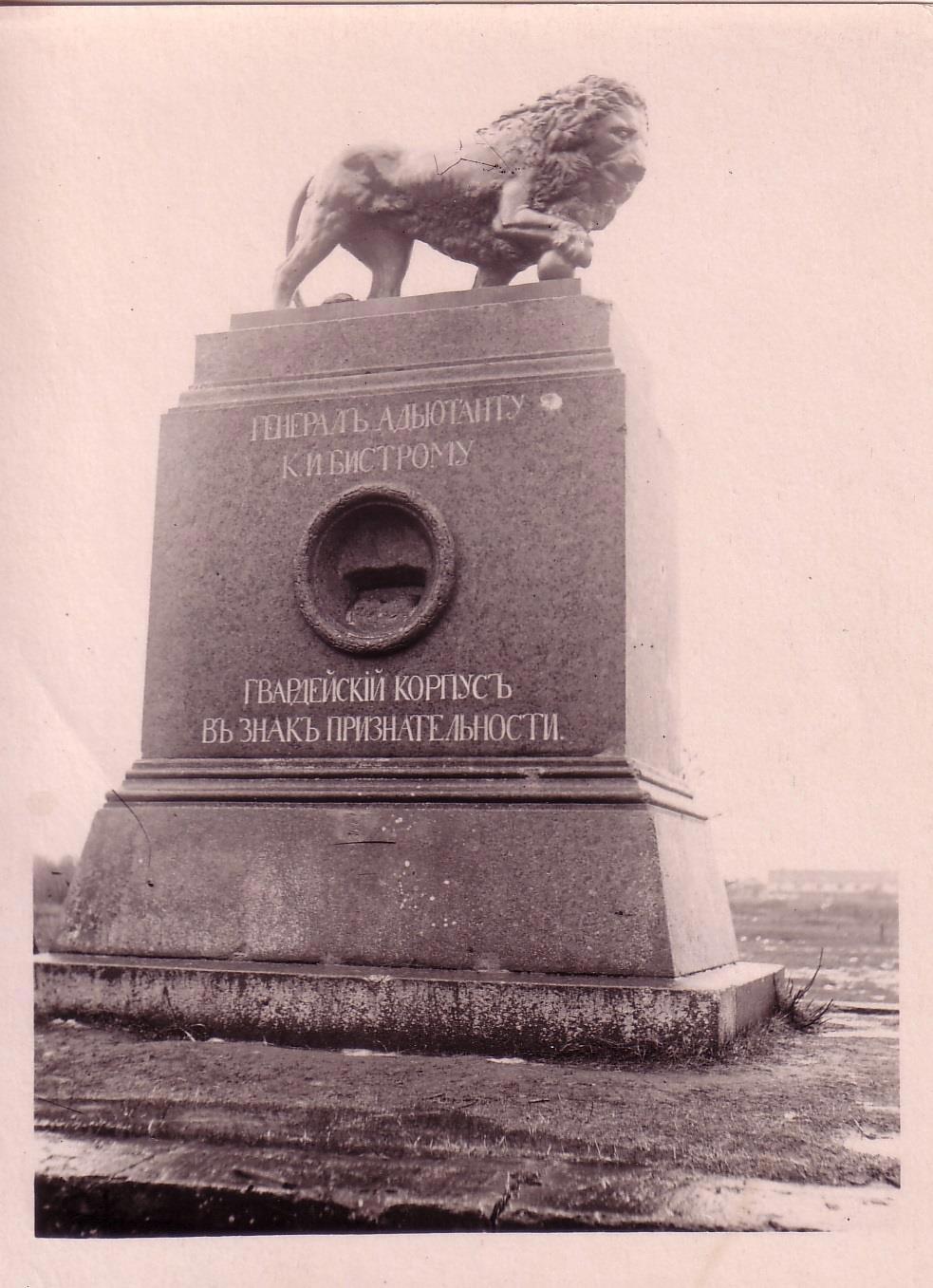 В 1841 г. в Санкт-Петербурге была издана «Биография генерал-адьютанта Бистрома», написанная Н. Лукьяновичем – старшим адьютантом штаба гвардейской пехоты. Лукьянович писал о сооружаемом памятнике: «Памятник сей будет свидетельствовать о беспредельной признательности гвардейского корпуса к незабвенному генералу, но памятник, сооруженный в сердцах воинов, будет прочнее камня, воздвигнутого над могилою Бистрома.
