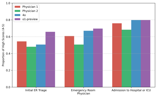 Исследование показало, что преимущество ИИ было особенно заметно в ситуациях с высокой степенью риска и ограниченным объемом информации. Подумайте о первоначальной сортировке в отделении неотложной помощи: медсестра собирает предварительные данные, и быстрая, точная оценка имеет решающее значение. В этих ситуациях, когда информация скудна, а срочность высока, модель «o1» определила точный или очень близкий диагноз в 65,8% случаев, превзойдя своих человеческих коллег. По мере поступления дополнительной информации (например, оценка врача отделения неотложной помощи, госпитализация в отделение интенсивной терапии) и люди, и ИИ улучшали свои показатели, но LLM последовательно сохраняли лидерство.