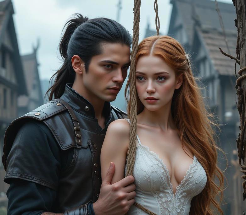 В общем, снова пробую визуализировать сцену спасения Ланы с костра. Так вот, эту картинку пришлось обрезать в фотошопе, поскольку нейросеть допустила сразу два крупных ляпа. Но зато тут и Килиан, и Лана получились похоже на задумку.