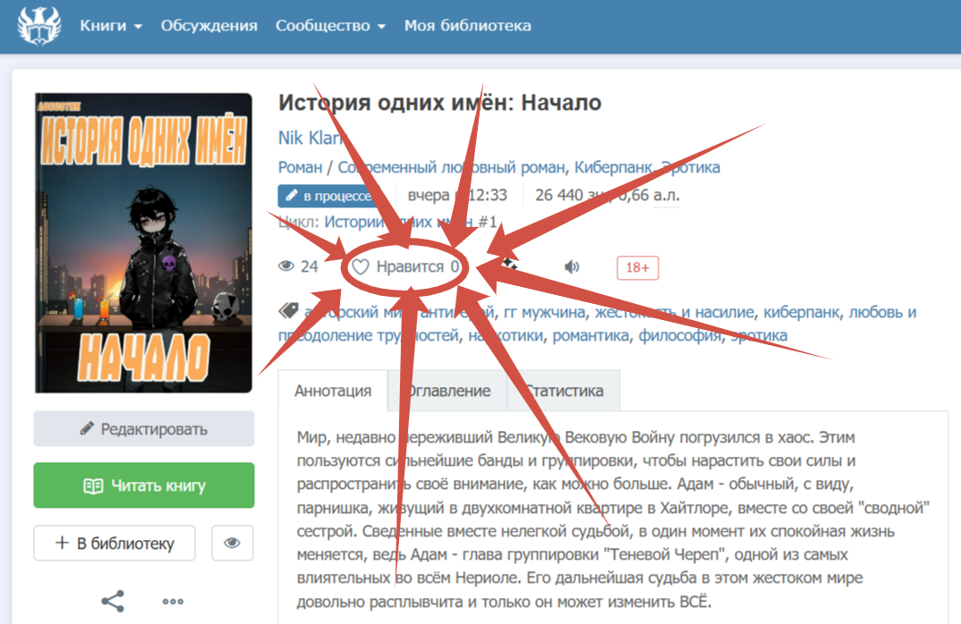, за то что любезно предоставила мне их. Можете также глянуть отрывочек редактирования обложки (Надо было включить её пораньше, но да ладно). В общем, что хотелось бы сказать. Бл№%*, меня переполняют эмоции. Такого вайбика я ещё не чувствовал никогда. От одной мысли, что мой бред могут прочитать, возникают такие смешанные эмоции. В связи с этим, мне нужно ВАШЕ мнение. Почему же люди не оставляют комментарии, когда они так нужны? Не знаю. Хотелось бы также напомнить вам, мои читатели, что существует такая классная кнопка, которая мотивирует меня и дальше писать мой бред: