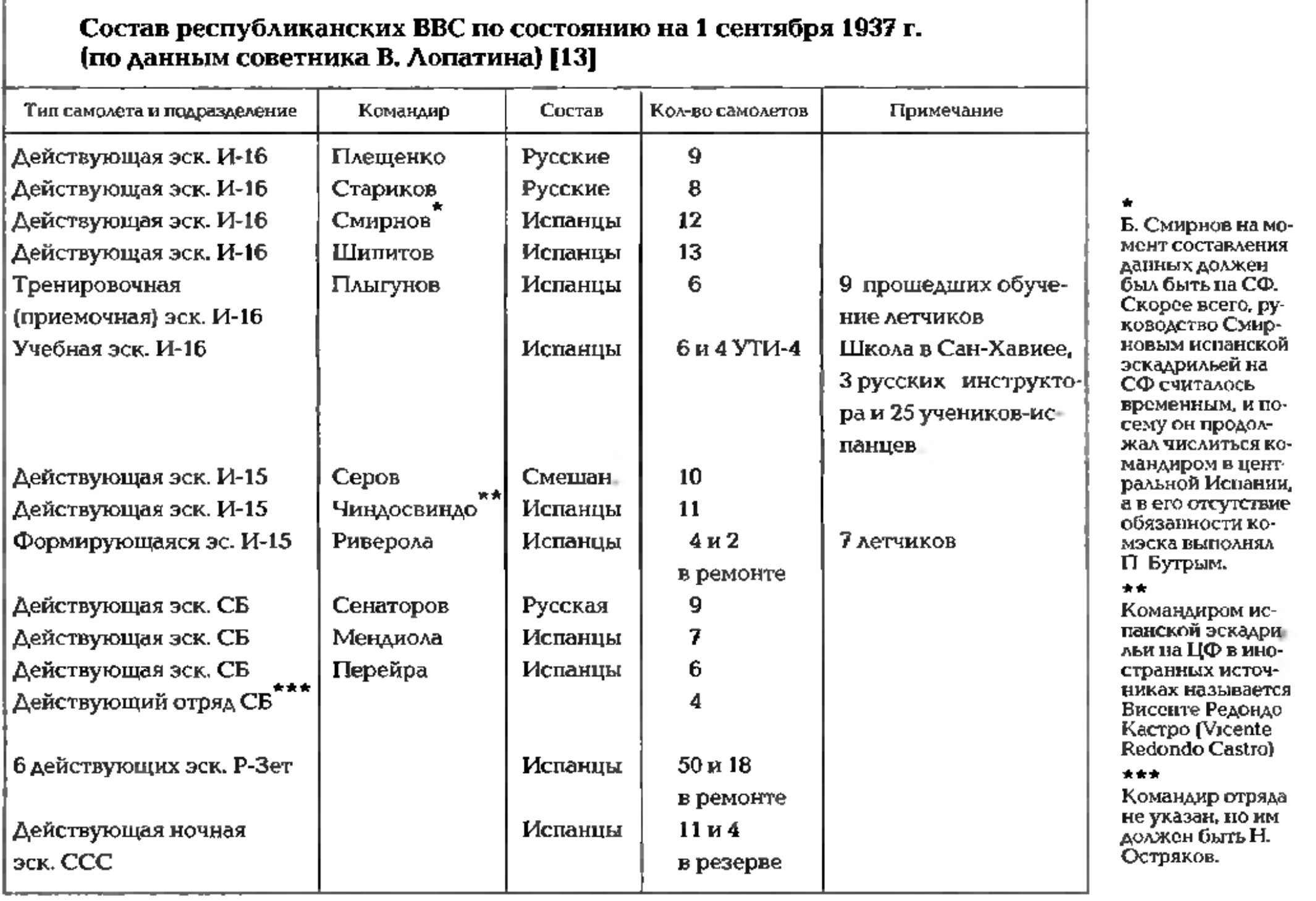 В исторических документах есть табличка составленная советником по авиации в этот период В. Лопатиным.