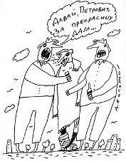 От впадания в кому нашего гостя спасла проводница, заглянувшая в купе, и сообщившая, что пассажиру Петровичу пора выходить. Петрович затравленно обвел нас глазами, но тут лицо его просветлело. Известно, что чувство опасности обостряет даже небольшие умственные способности.
