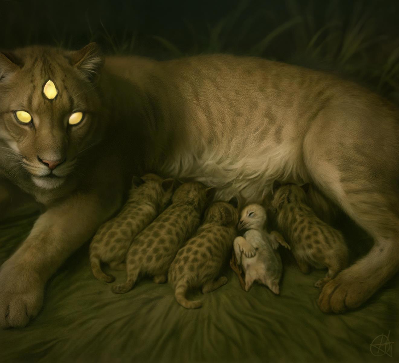 Мурчание. Отчетливое, громкое, оно доносилось с противоположного края поляны. Там — лежала огромная дикая кошка. Пума? Саниру приготовилась к паническому ужасу, который должен был сейчас захлестнуть ее тело. Но он не пришел. В растерянном оцепенении взгляд девушки скользил по кошачьему силуэту. Бархатистая темно-песочная шерсть переливалась золотом в закатном свете. Янтарем сияли звериные глаза — три, и один из них — посреди широкого лба. Пума лежала на боку, расслабленно разбросав по земле мускулистые лапы. Длинный толстый хвост покоился у ее живота. Прикрыв глаза, кошка опустила голову. Каким-то образом Саниру оказалась рядом со зверем — она не помнила, когда решила подойти или решала ли. Пума, шевельнув длинным, массивным хвостом, откинула его в сторону. Отрывисто вздохнув, девушка вгляделась в нескольких котят, копошащихся в густой шерсти материнского живота. Детеныши тихо пищали и толкались, добираясь до заветного молока или, напившись, просто теснились к братьям и сестрам, чтобы не замерзнуть. Саниру нахмурилась.