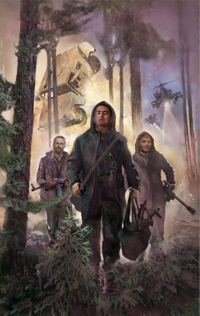 Затем, была обложка. Второй вариант вы видите ниже, первый был совсем стрёмный и увы, не сохранился. Хотя лица остались на месте. Если что, Ропша был тот усатый придурок слева, с криво нарисованным "калашом" и очень сильно восточной внешности, как карикатурный торгаш с рынка. Снайпера Чернова изуродовали и оставили как есть, хотя я предельно чётко сказал редактору, что писал деда с актёра Алексея Чернова из отличного советского фильма "Обратной дороги нет". Михась... гхм, тоже почему-то стал кем-то вроде Панкратова-Чёрного без стероидов.