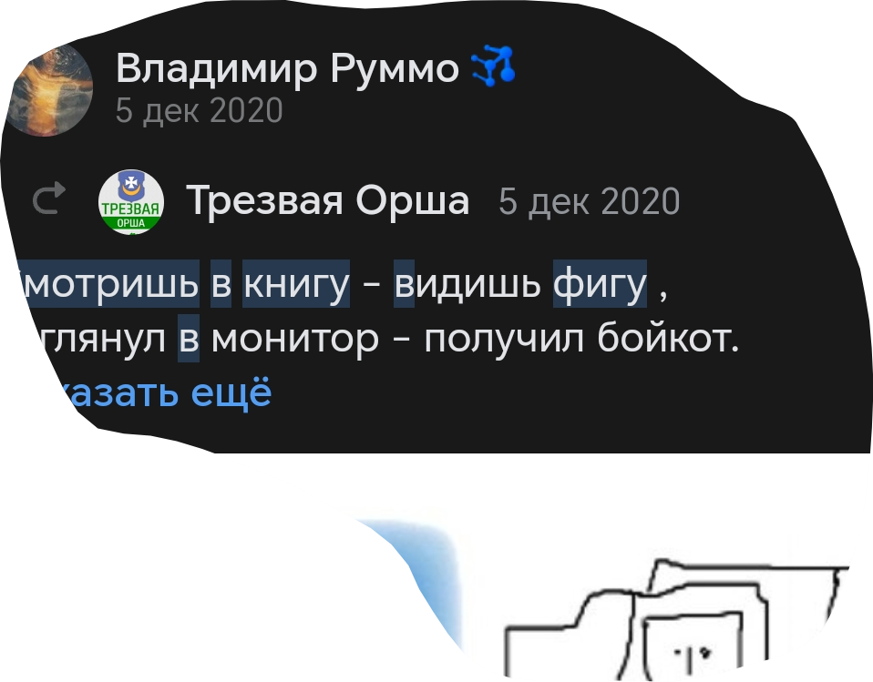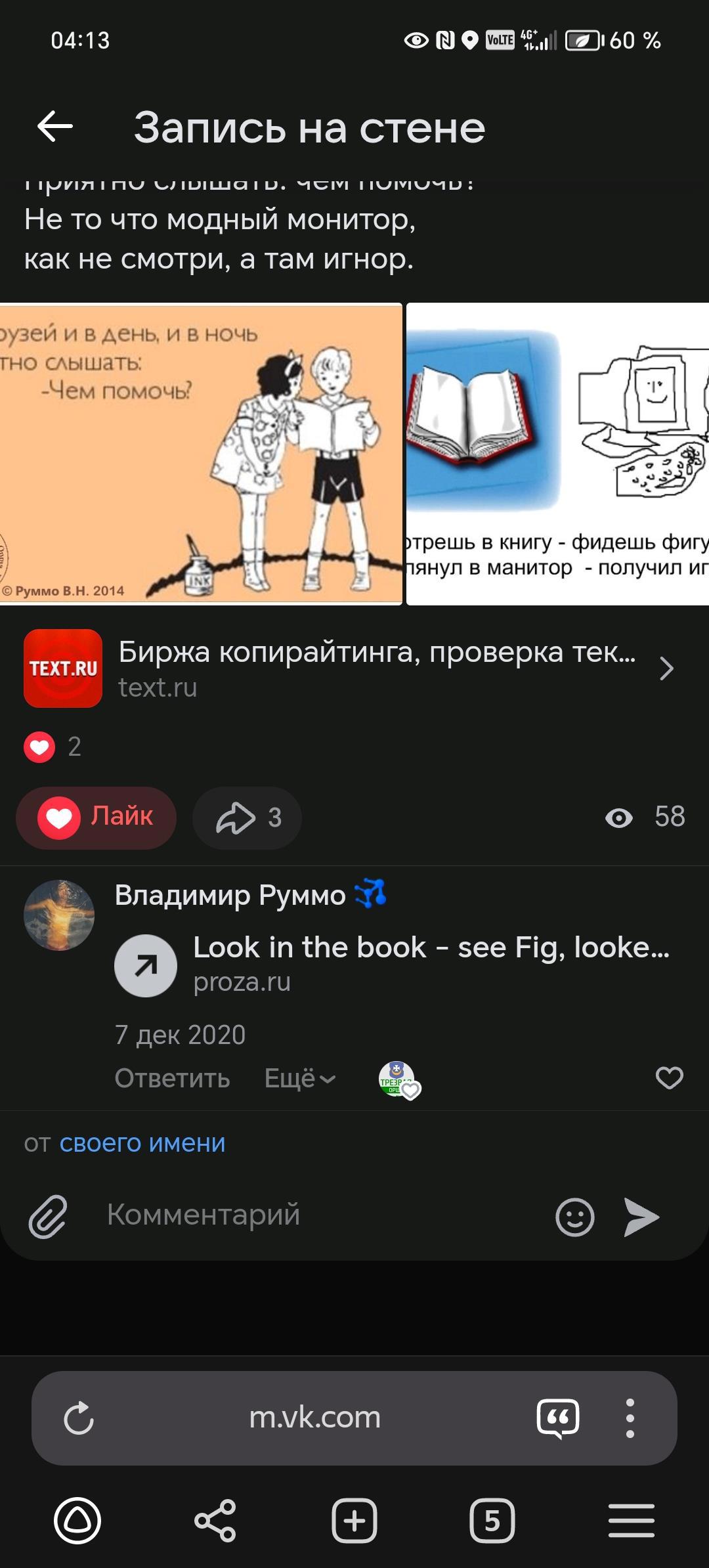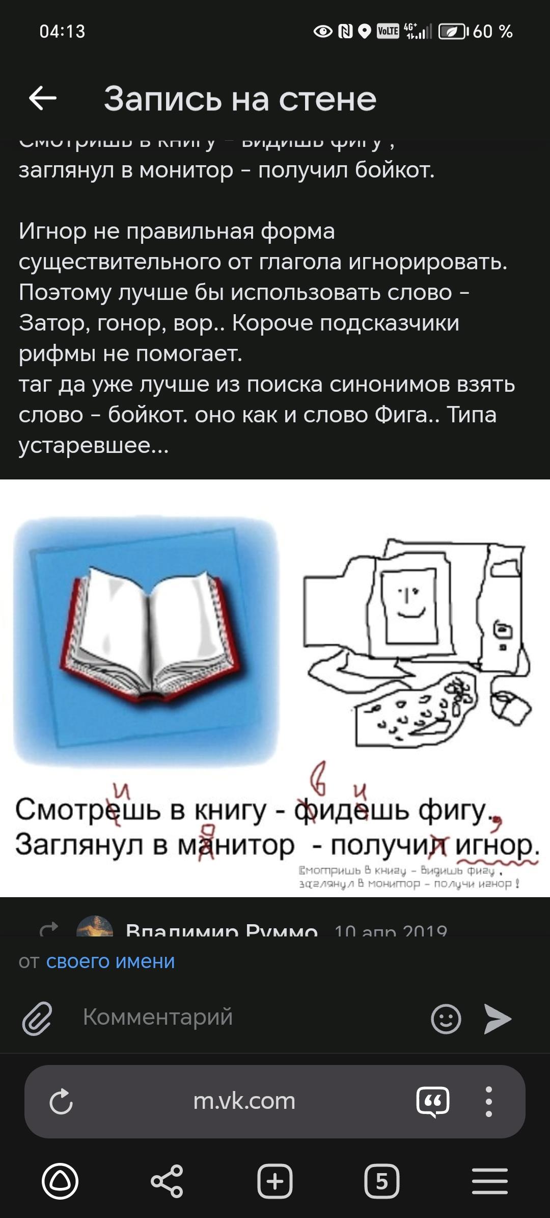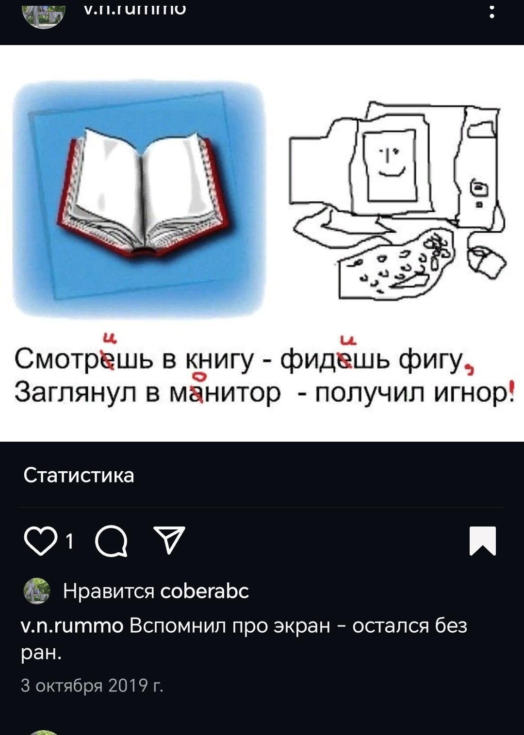 5. В инстограмме нашёл проделжение текста. Смотришь в книгу - видишь фигу, заглянул в монитор - получи игнор, вспомнил про экран - остался без ран.