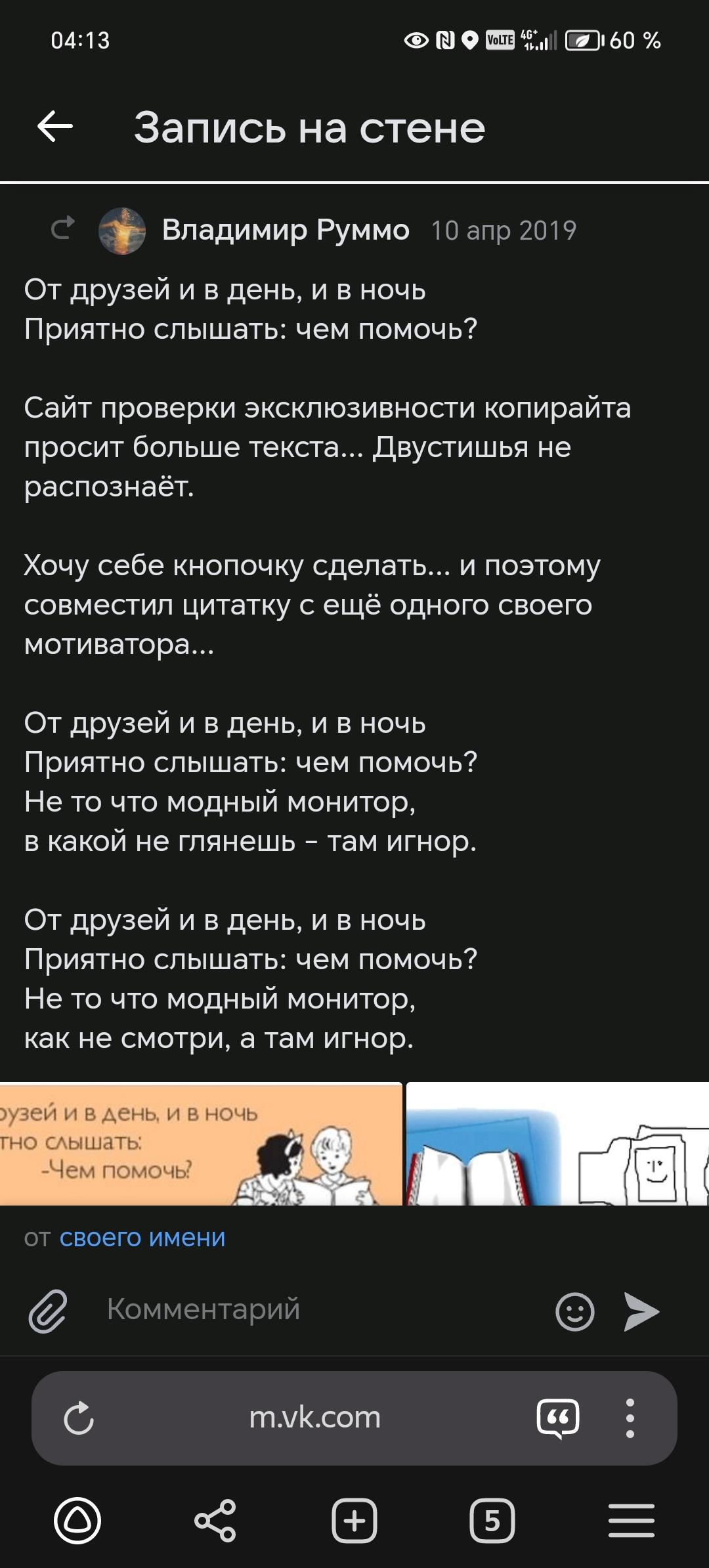 Пояснения. Первая ссылка уже содержит в себе вторую. А вторая должна была содержать в себе третью. Но ВК-админы выключили(обновили) эту функцию. Теперь в ВК нет возможности комментировать отдельное высказывание в комментариях. Ну, за бесплатно... Нет. За бесплатно, наверно, нет. Может там какие суперы-пуперы и прочие люди Икс... Или нейро-ИИ им в самом деле поможет и спасёт. Но я лучше по старики на друзей и товарищей сделаю ставку. На адекватных читателей которых не сломано чувство материнские и отечественный долг не прощён.
