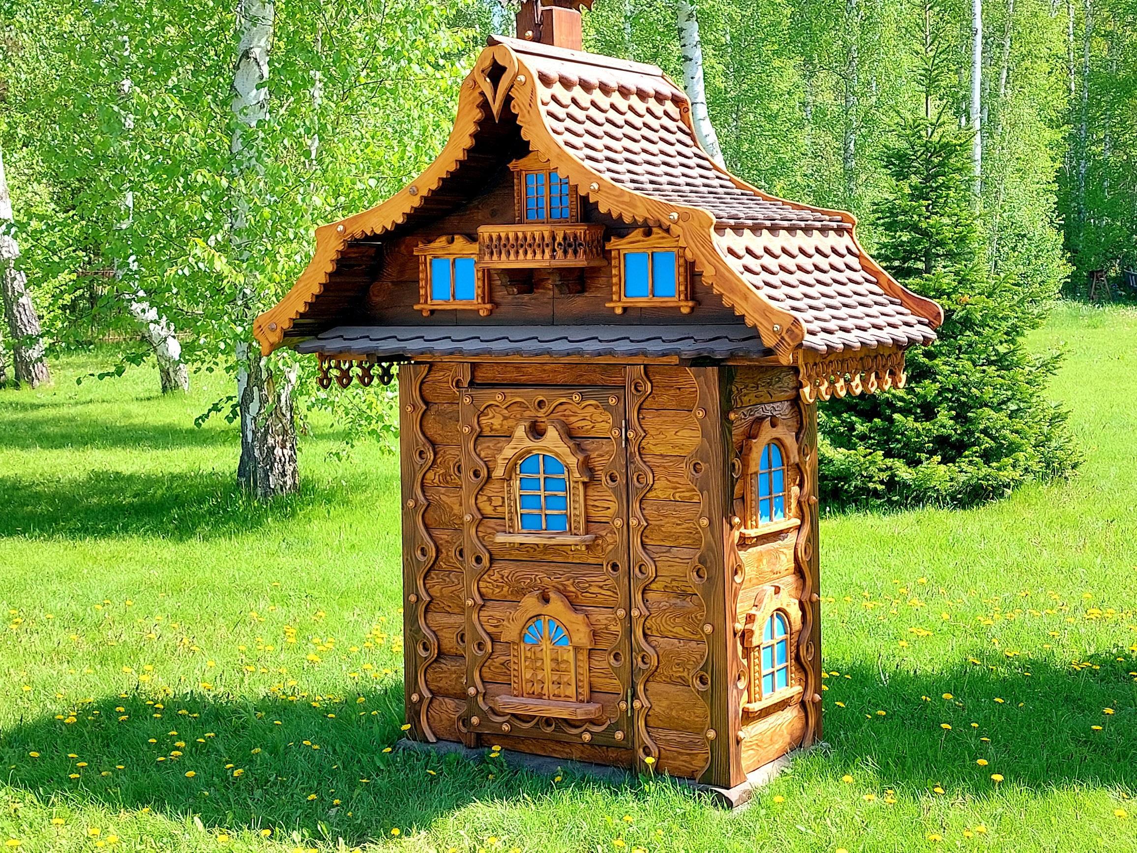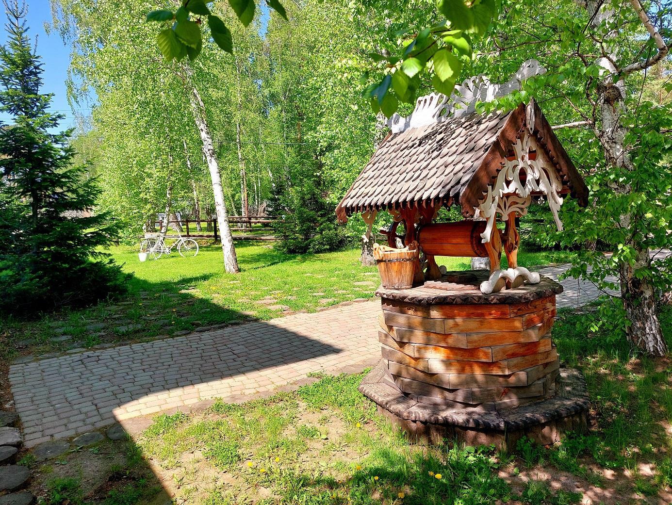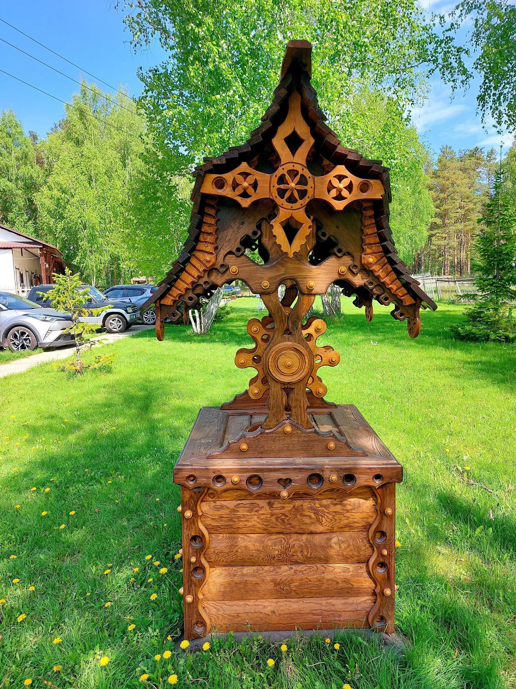 Новые деревянные домики, колодцы и указатели парка-отеля "Чайка"...