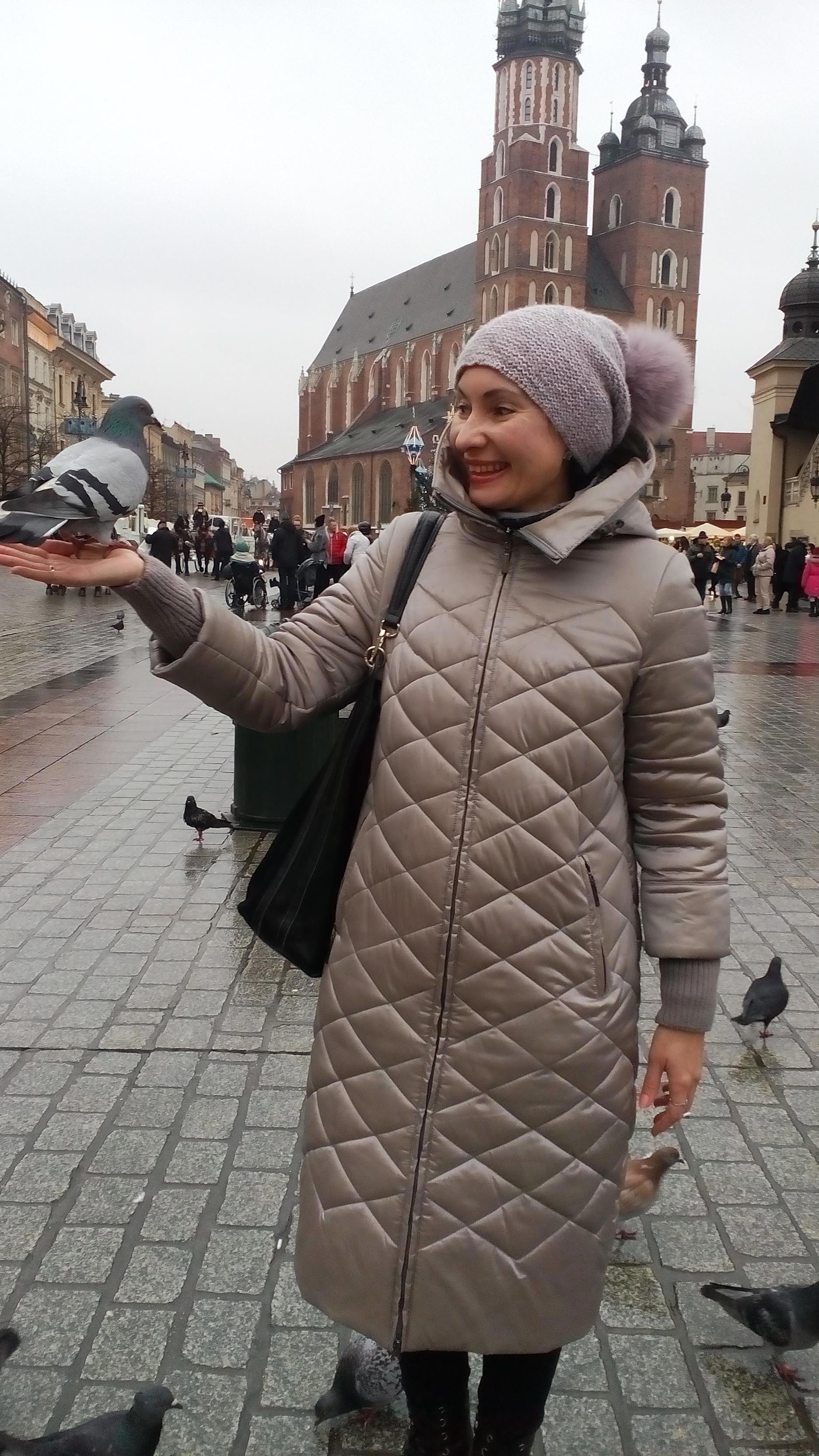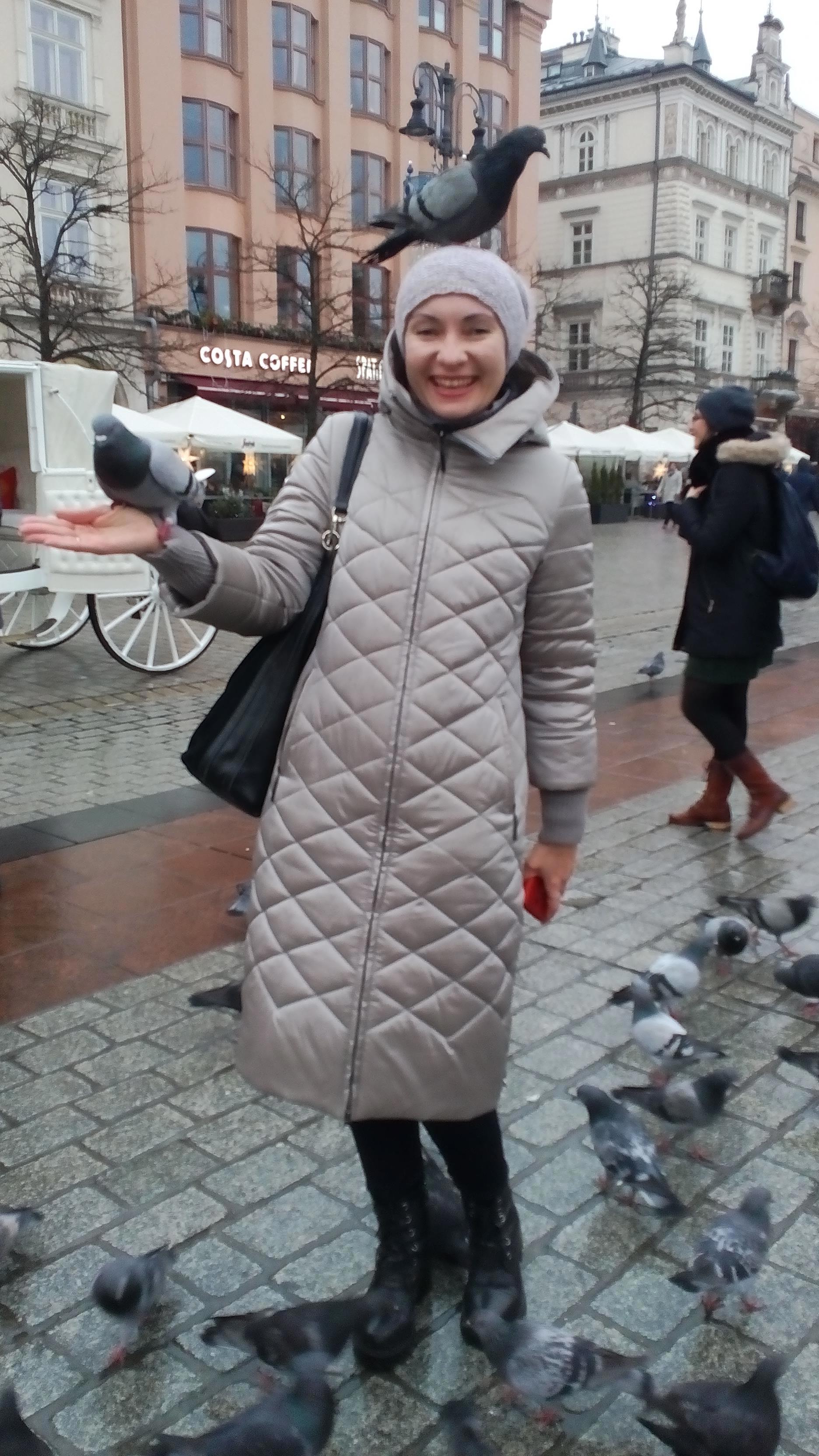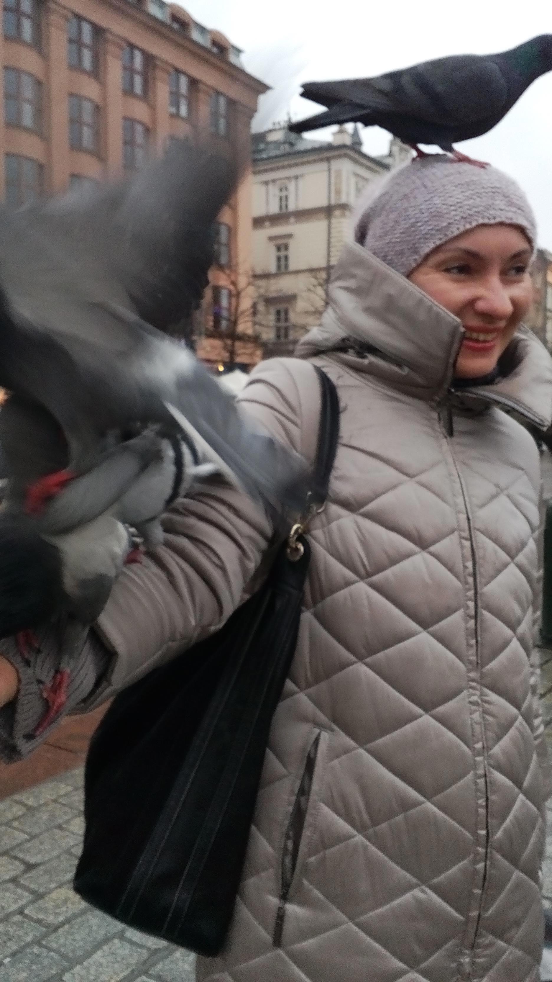 Я кивнула и тут же была обсыпана пшеницей с головы до ног. А потом это все начали клевать голуби. Было весело и я чувствовала себя почти памятником. Девушка получила свои пару злотых и, кажется, осталась довольна.