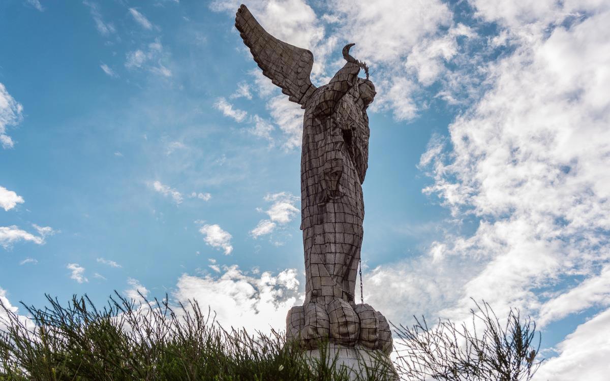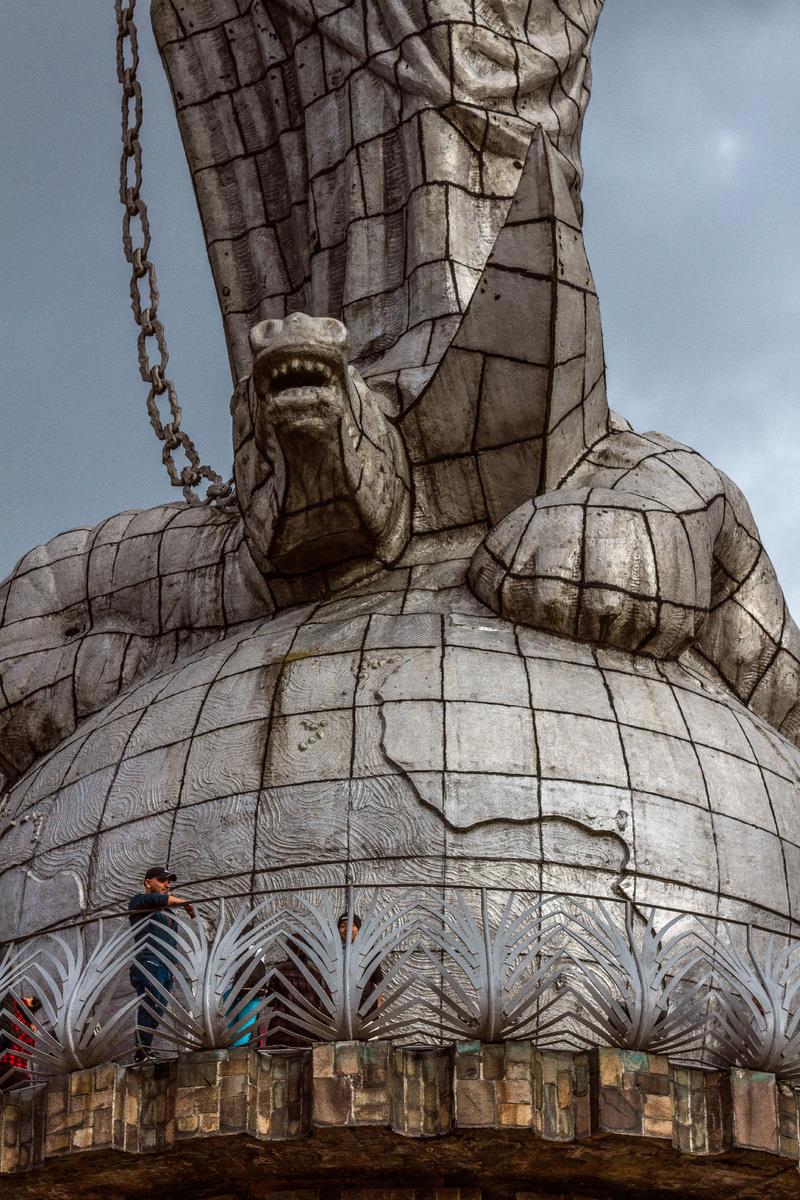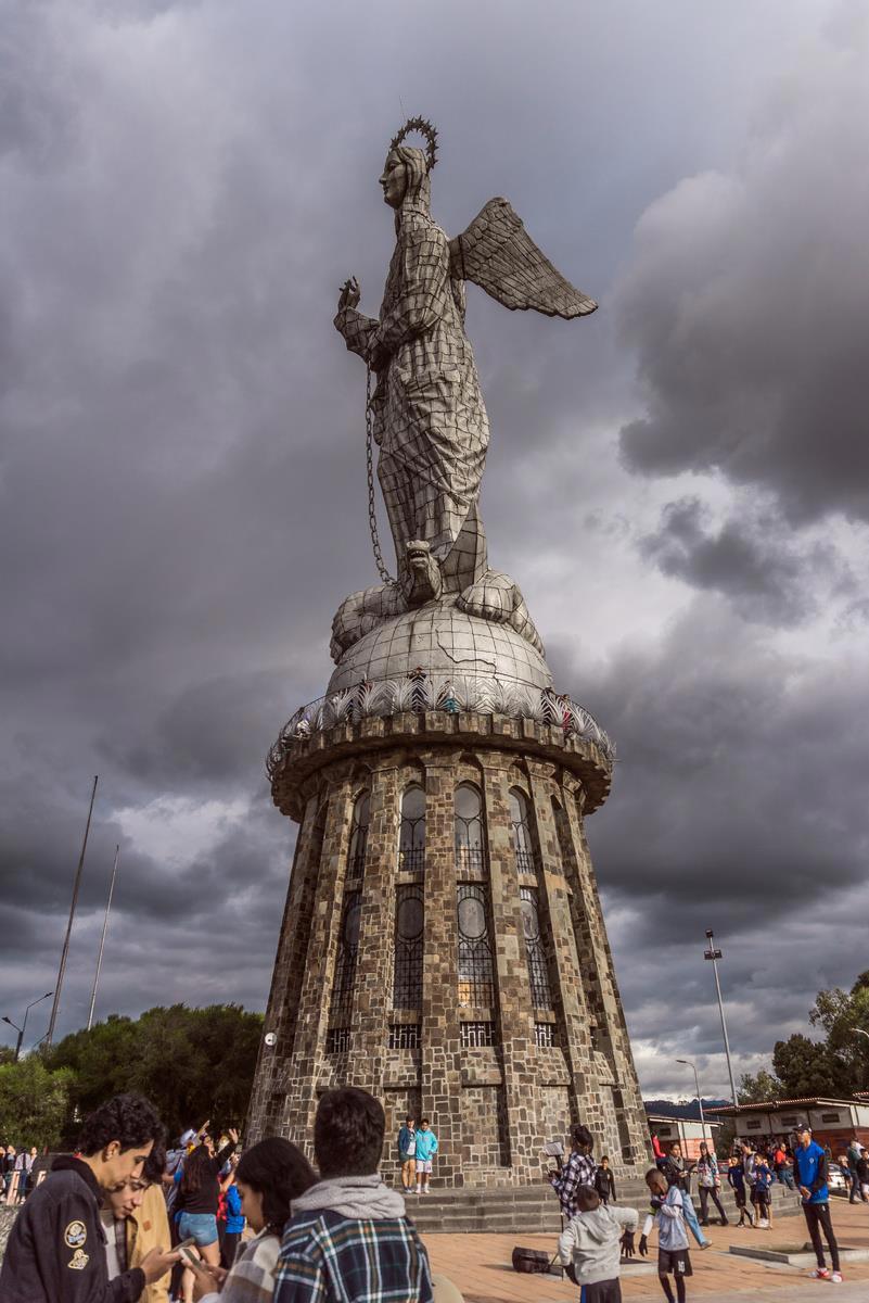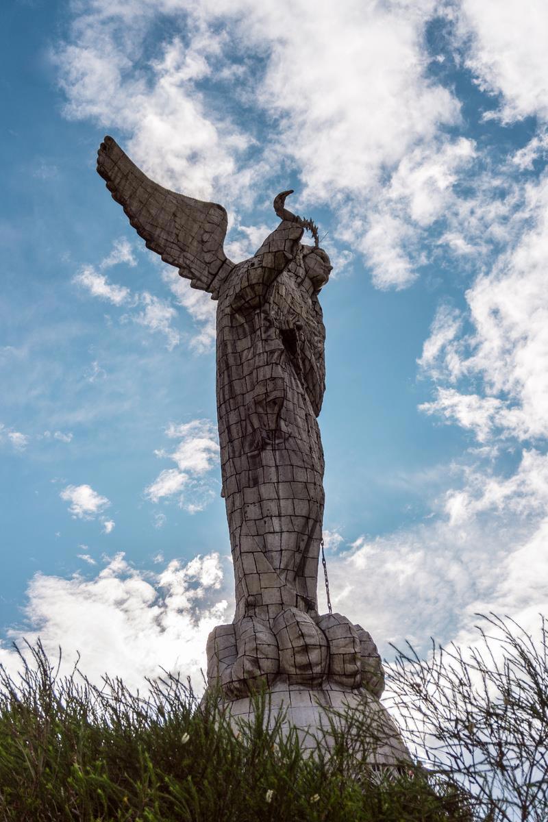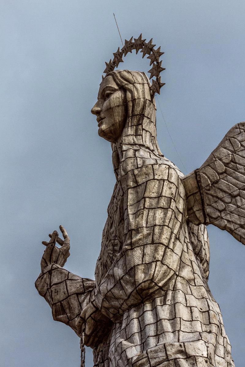 А вот в 1975 году установили саму Деву, состоящую из 7400 алюминиевых частей (тщательно пронумерованных, кстати). Так проще было перевозить её через океан — из Испании в Эквадор. И после установки выяснилось, что Дева со Змием реально офигенна и мощна. По высоте она в лёгкую переплевывает Христа-искупителя из Рио-де-Жанейро (Бразилия). Вместе с постаментом его «рост» составляет 38 метров, а вот у Бирхен холма Панесиджо (также вместе с постаментом) — 41 метр. Это самая высокая алюминиевая скульптура на южноамериканском материке. И ещё единственное огромное изображение матери Иисуса с... крыльями!