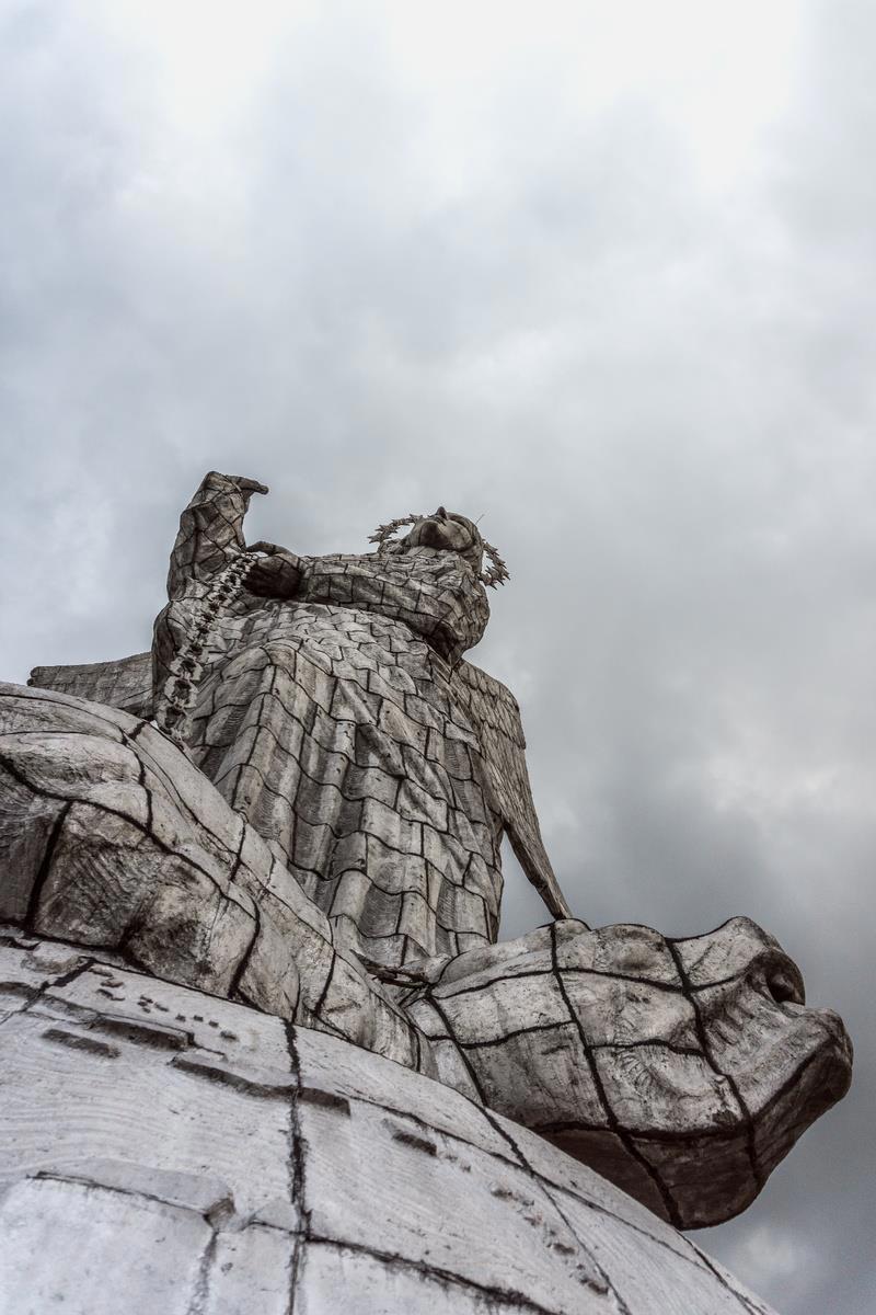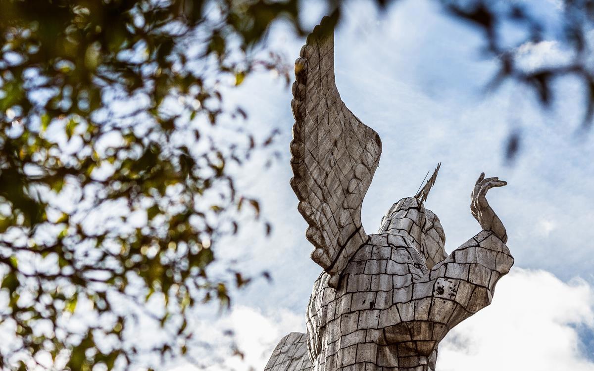 Но испанский скульптор Агустин де ла Эрран Маторрас решил, что слепо копировать сию Деву не будет. Да и как вы себе представляете изготовление офигенной и мощной, то есть огромной танцующей статуи? Вот и он никак не представлял. А потому Змия и крылья Деве оставил, но танцы эти вот решил упразднить, придав облику хранительницы пупа Земли более серьезное выражение.